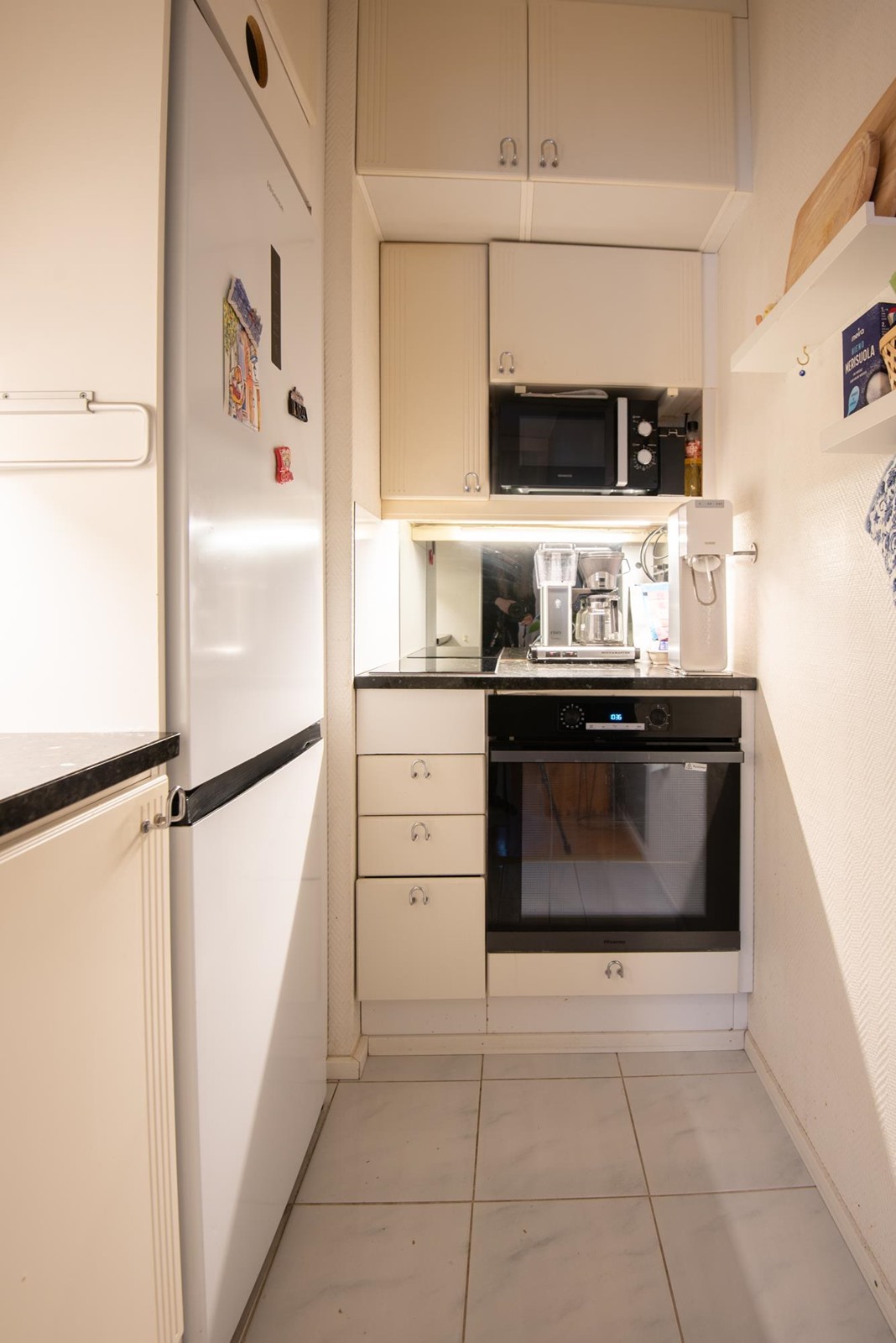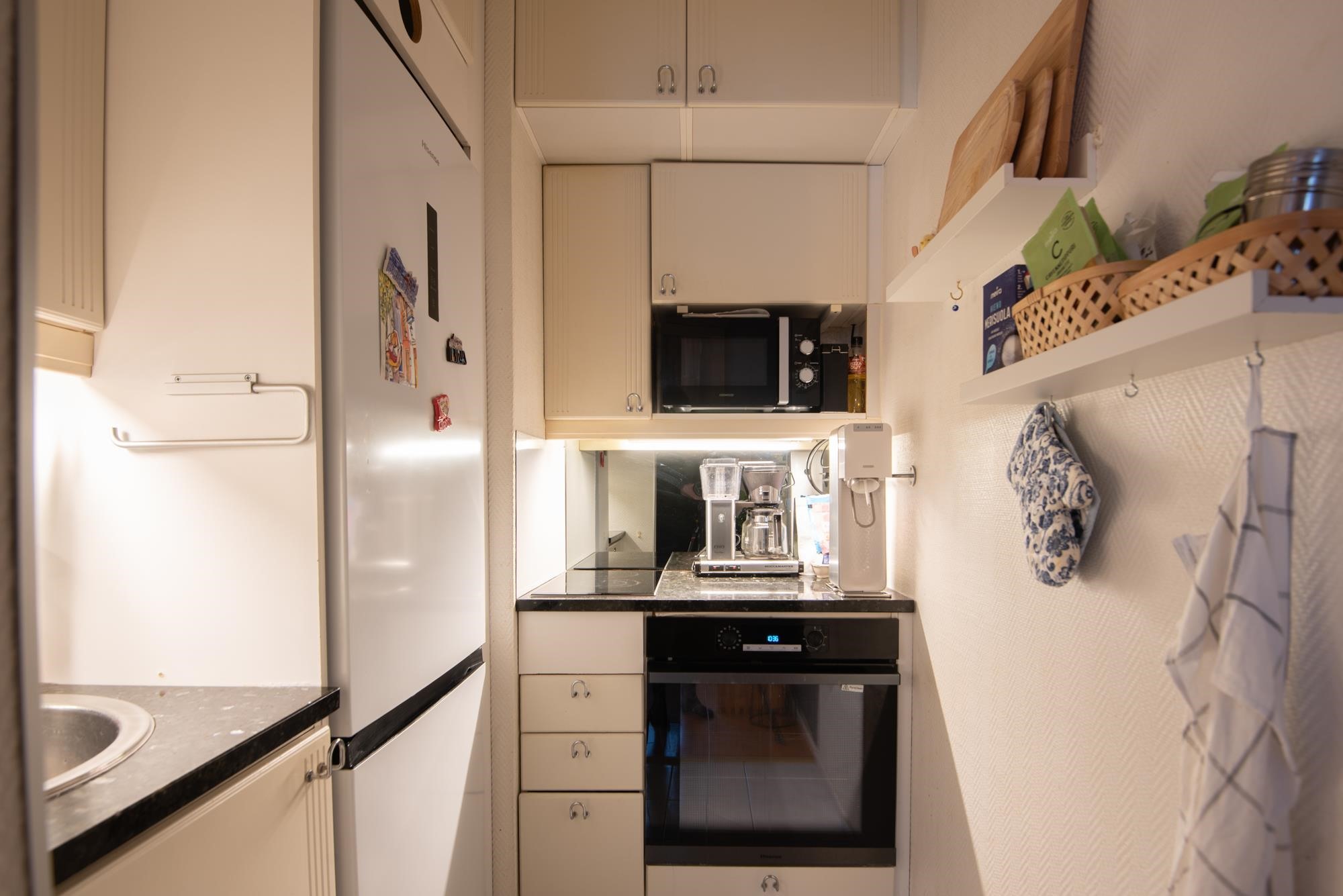 - Jääkaappipakastin, erillisuuni, keraaminen liesi, liesituuletin, kaapistot.