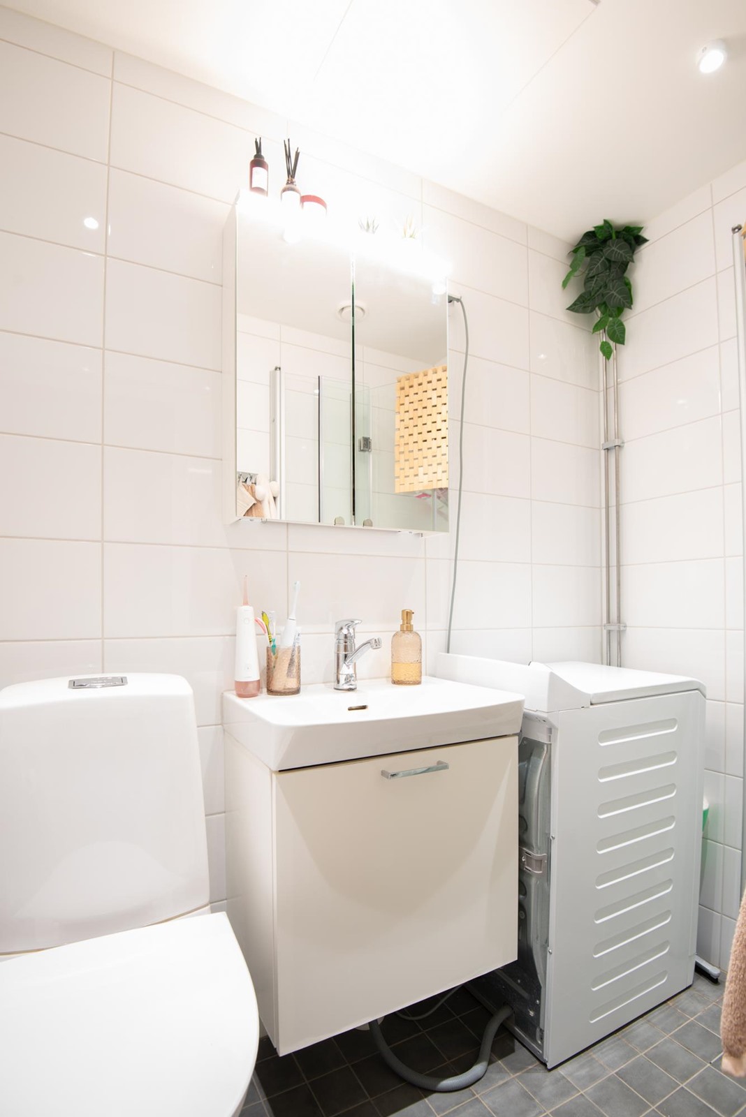 - Kylpyhuone, suihku, suihkuseinä, peilit, allaskaappi, lattialämmitys.