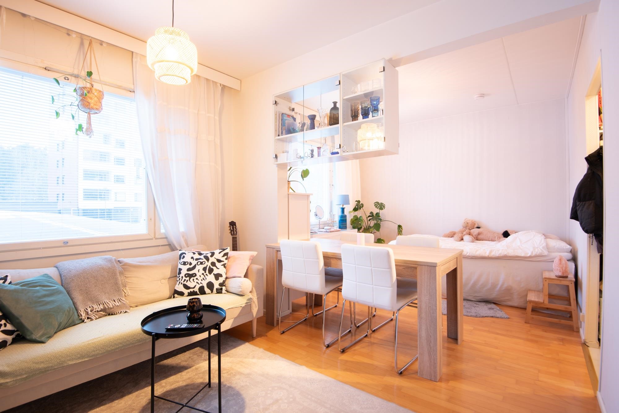Huoneistossa on selkeä pohjaratkaisu: tilava huone, erillinen keittokomero, vaatehuone sekä kylpyhuone, jossa pesukoneliitäntä. Keittokomerosta löytyvät jääkaappipakastin, erillisuuni ja keraaminen liesi. Säilytystilaa on runsaasti sekä asunnon omassa vaatehuoneessa että taloyhtiön kellarikomerossa.