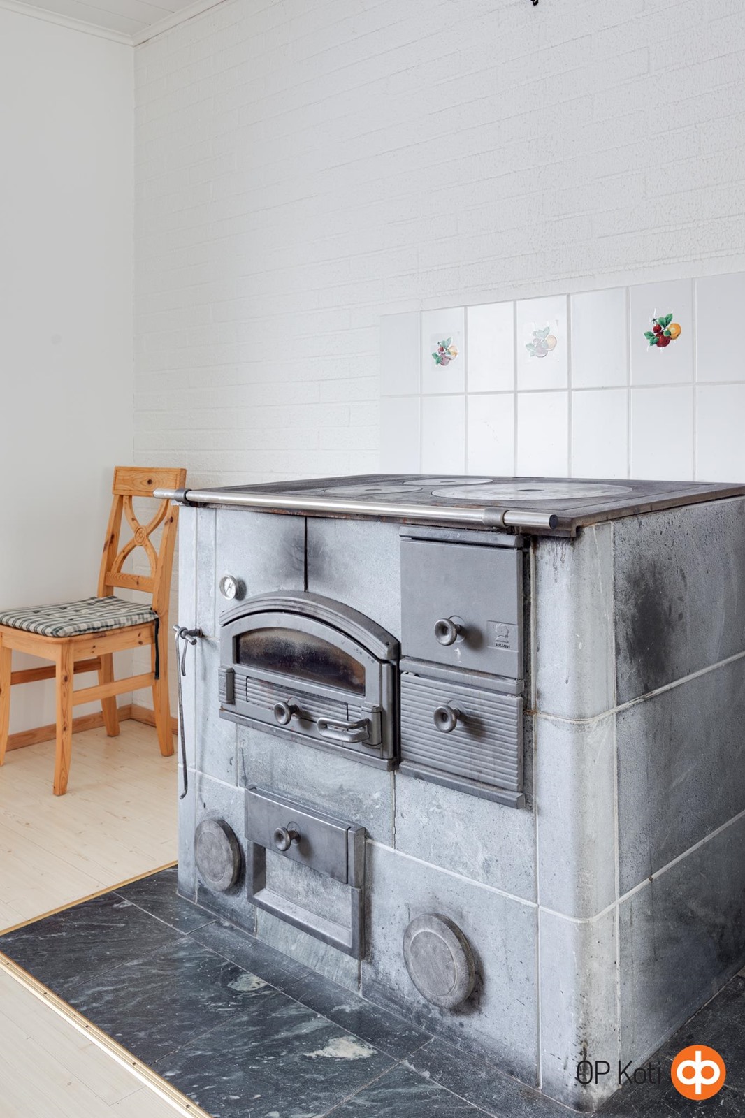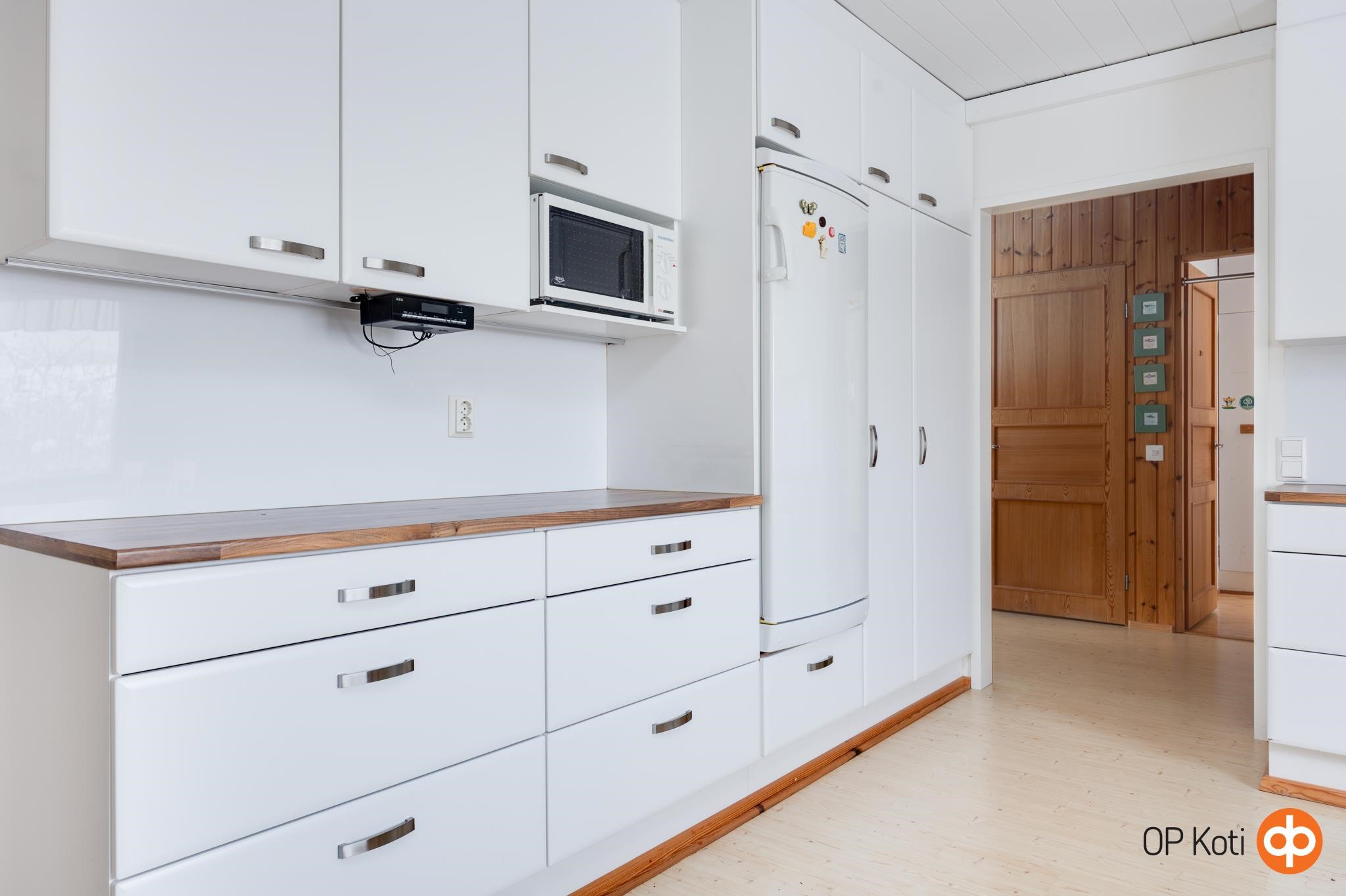 - Jääkaappi, sähköliesi (lattialiesi), liesituuletin, leivinuuni, kaapistot, kiinteät valaisimet. Keittiö uusittu 2010-luvulla.