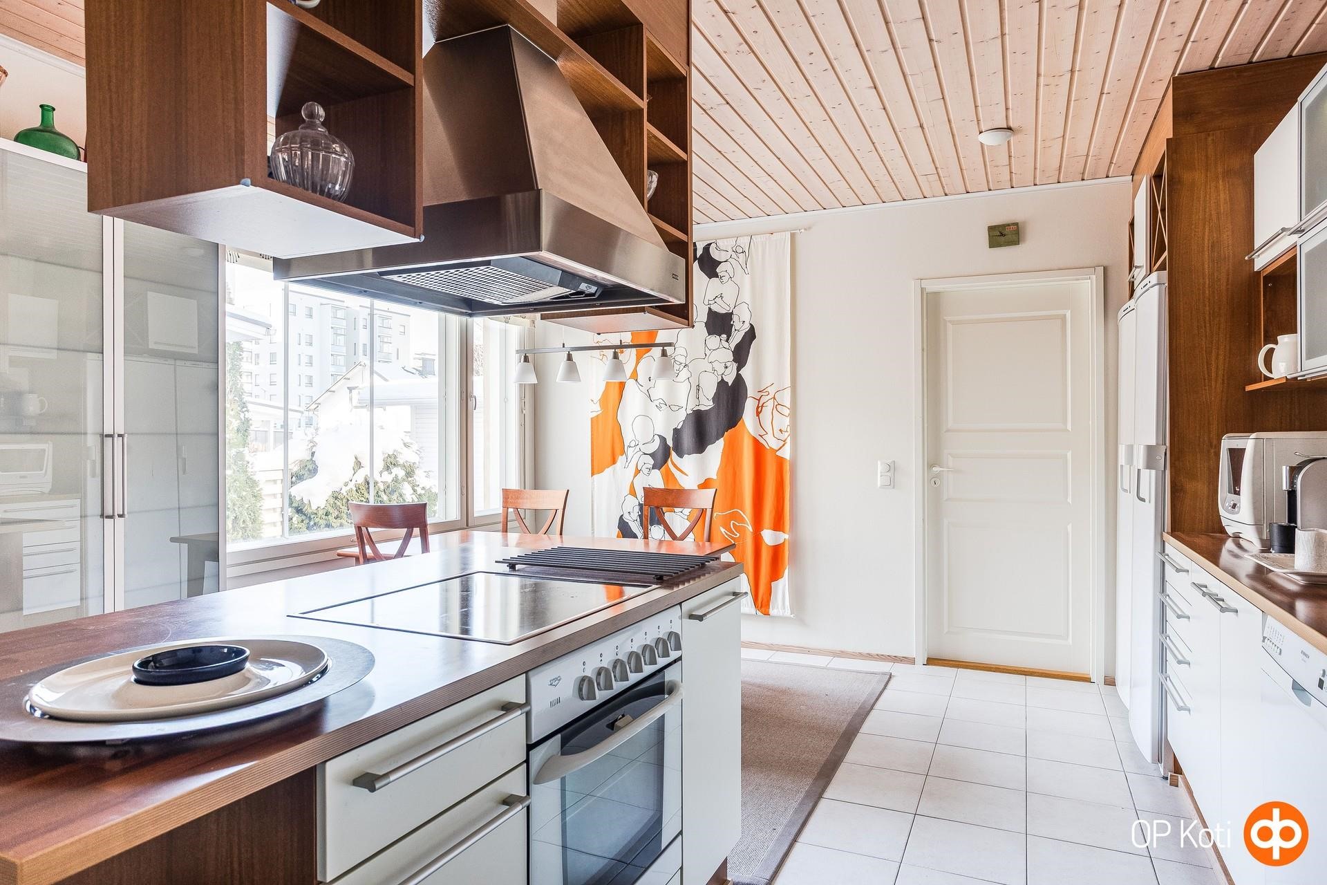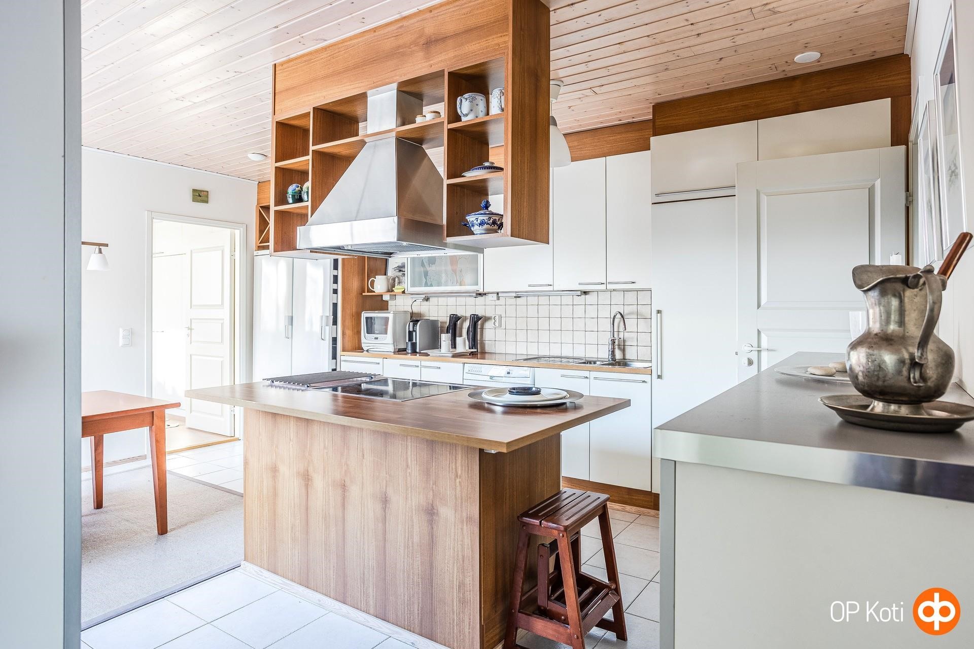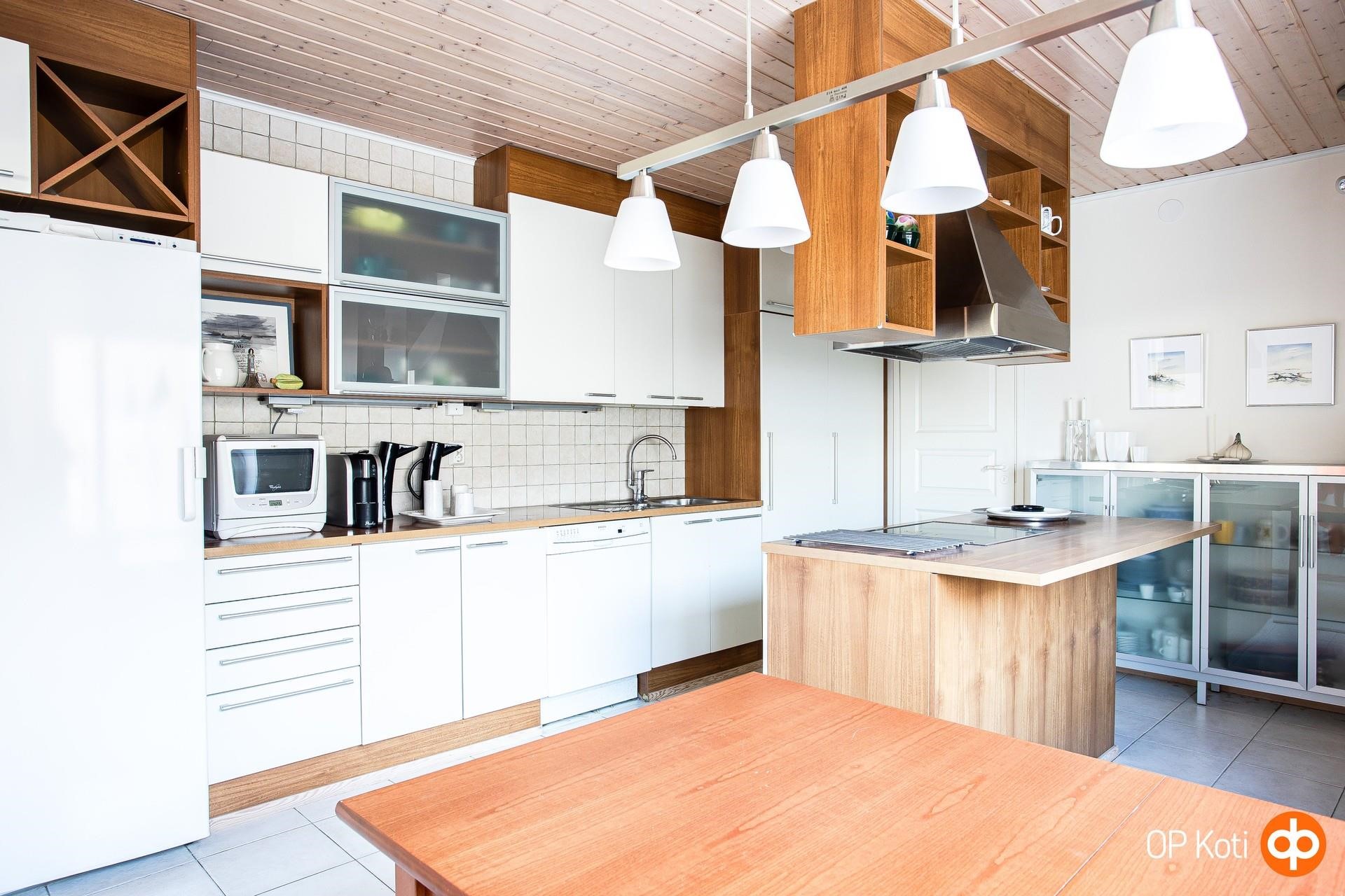 Tilavassa keittiössä paljon kaappitilaa, suuri saareke, ruokailutila.