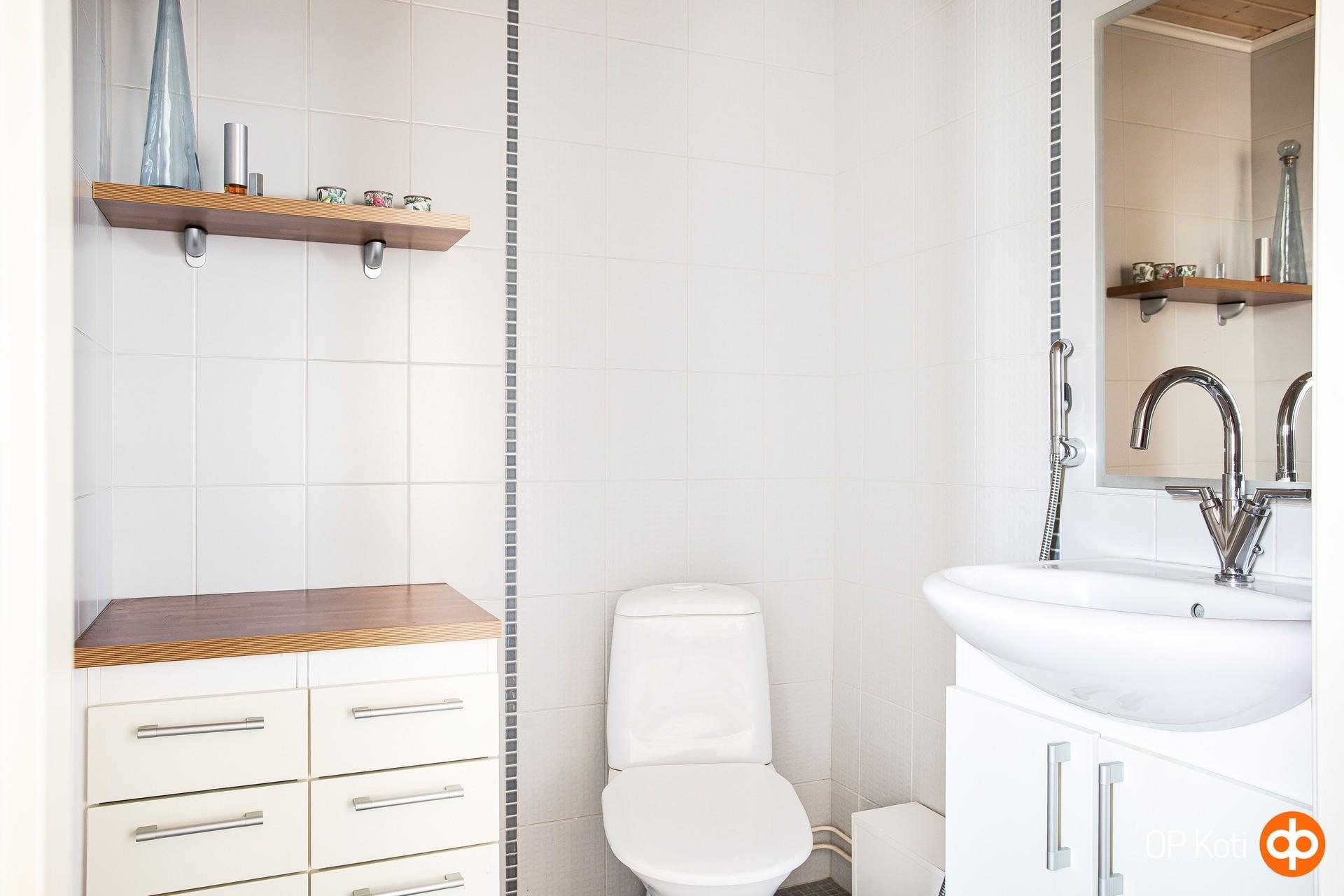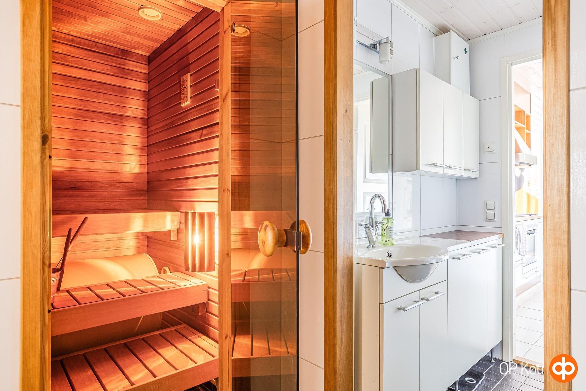 - Saunassa sähkökiuas (n. 3 vuotta vanha), kylpyhuoneessa suihku ja seinällä erotettu wc-tila. Lisäksi erillinen wc, peilit (kph/wc ja erill. wc), allaskaappi (kph/wc ja erill. wc), kylpyhuonekaapisto (kph/wc), pesukoneliitäntä, sähköinen lattialämmitys laatoitetuissa tiloissa, kiinteät valaisimet.