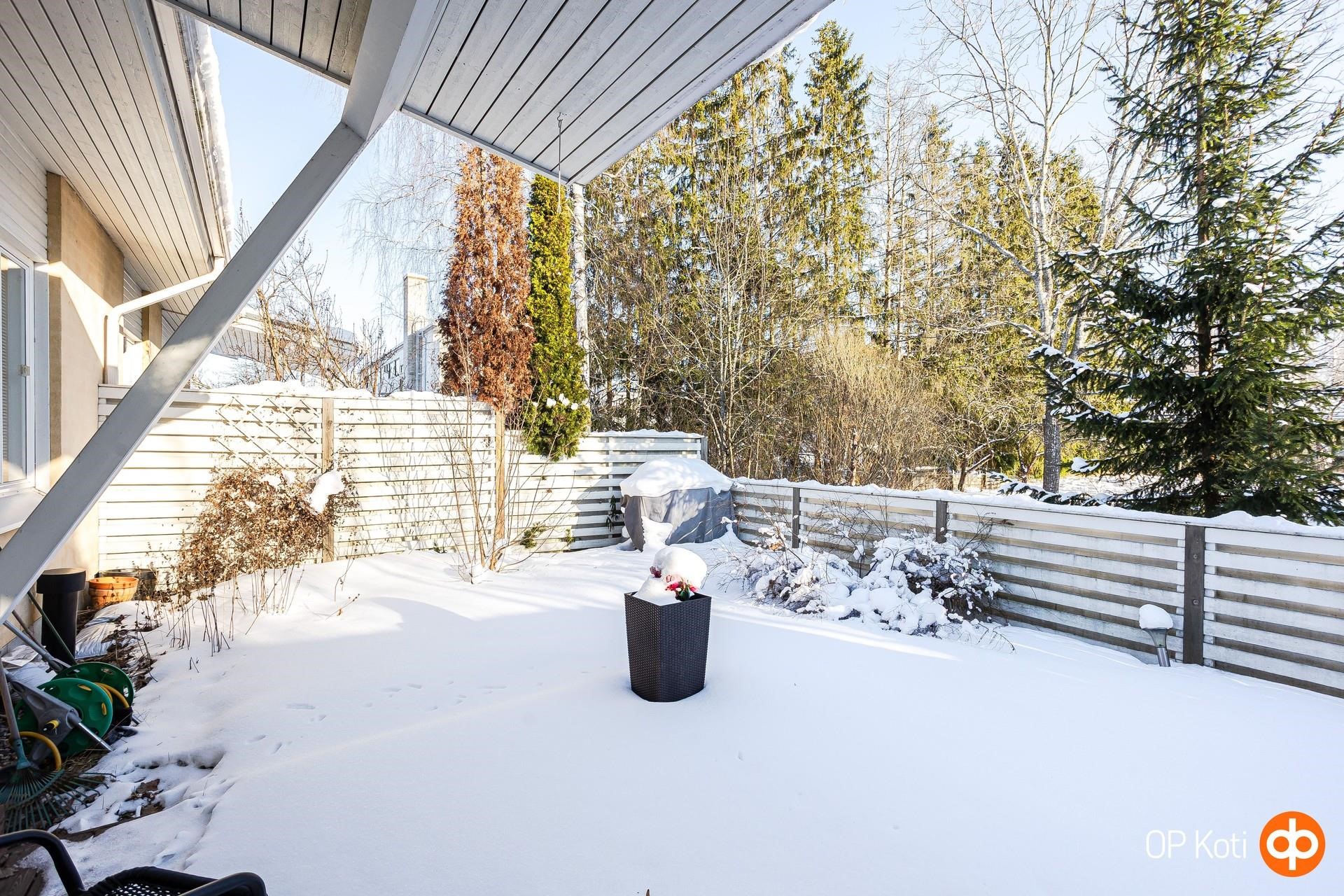 Suojaisa aidattu takapiha. Eristetty, lämmin varasto.