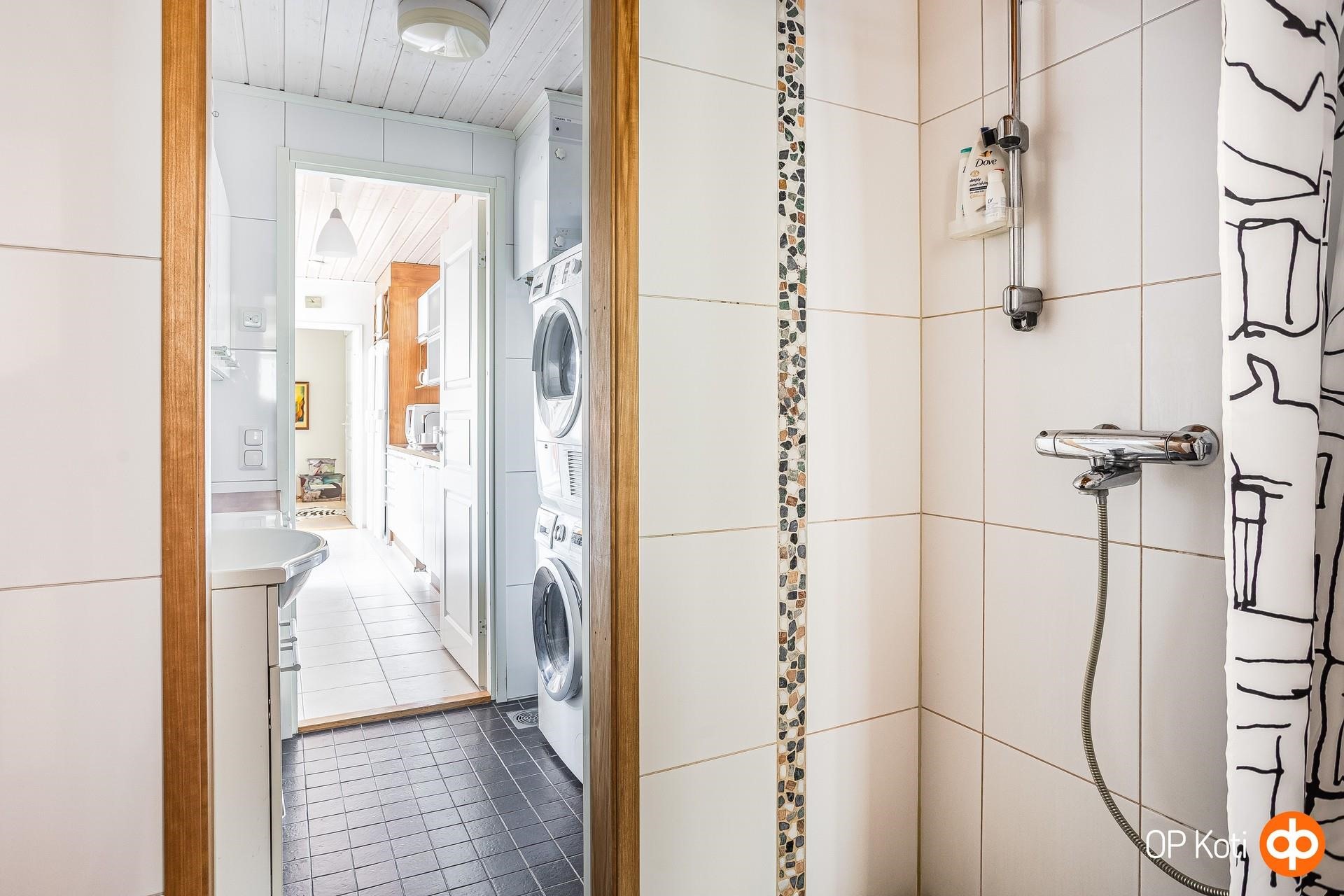 Hyväkuntoinen kylpyhuone, sauna ja kodinhoitohuone, jossa myös wc ja kylpyhuonekaapisto. Erillinen wc.