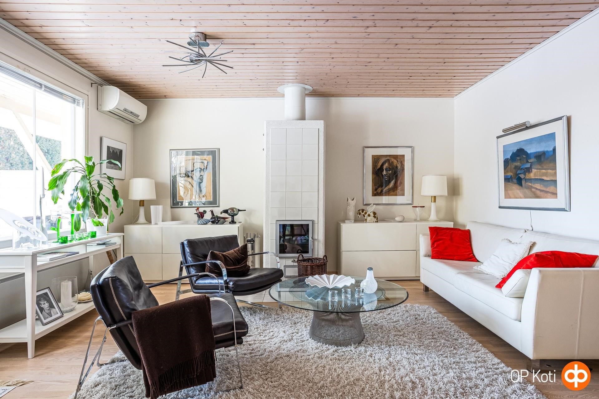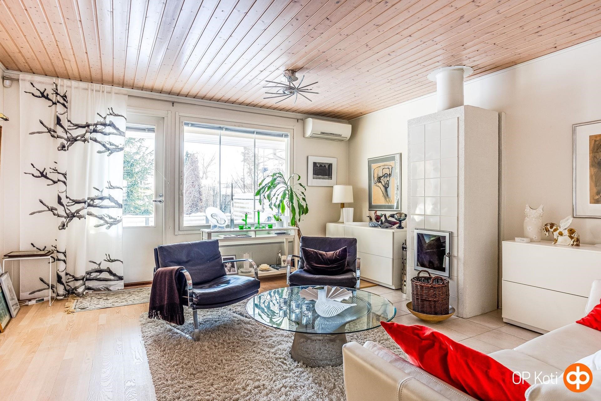 Olohuoneessa varaava takka, isot ikkunat, käynti työ/makuuhuoneeseen lasipariovista. Ilmalämpöpumppu.