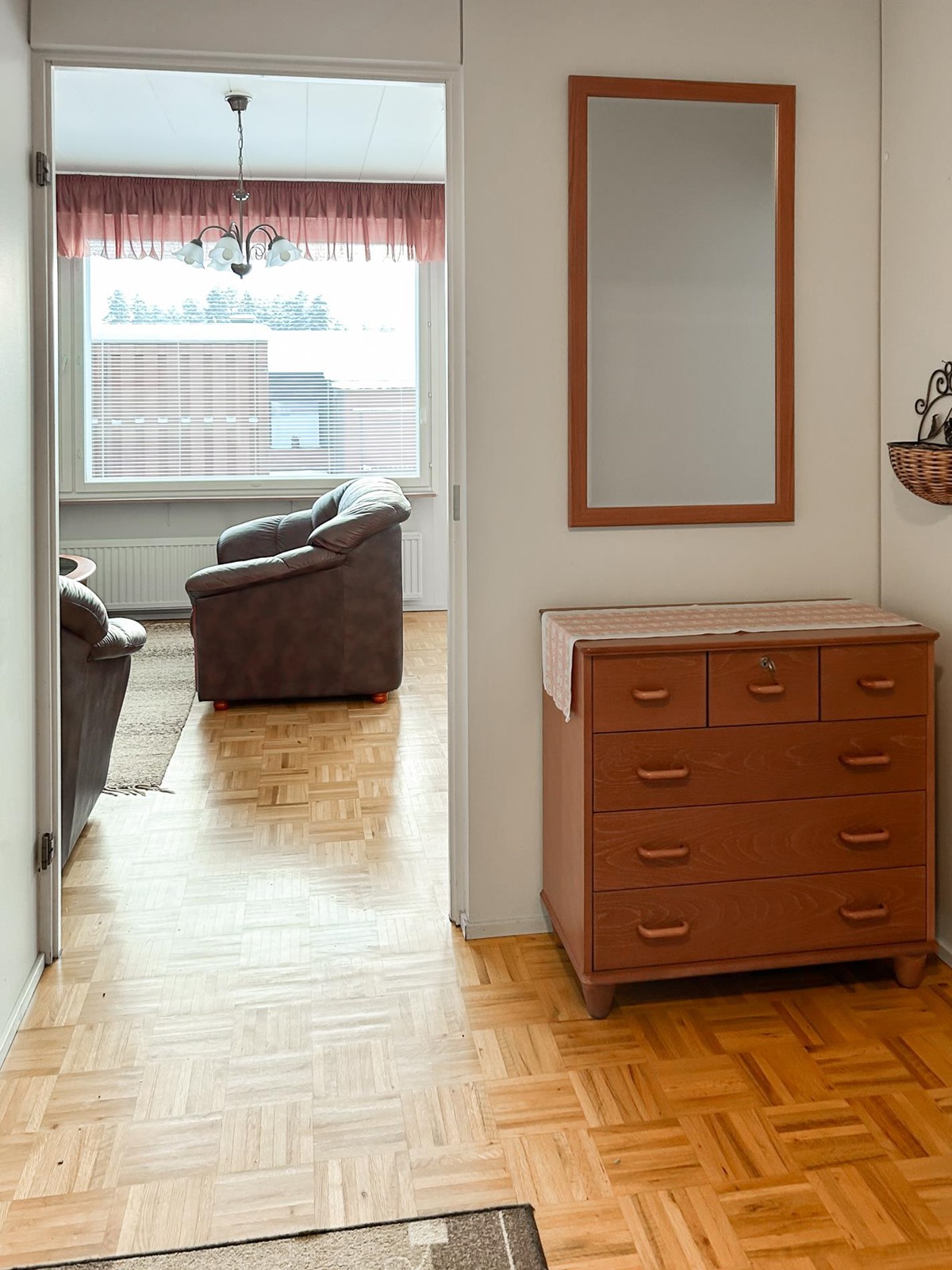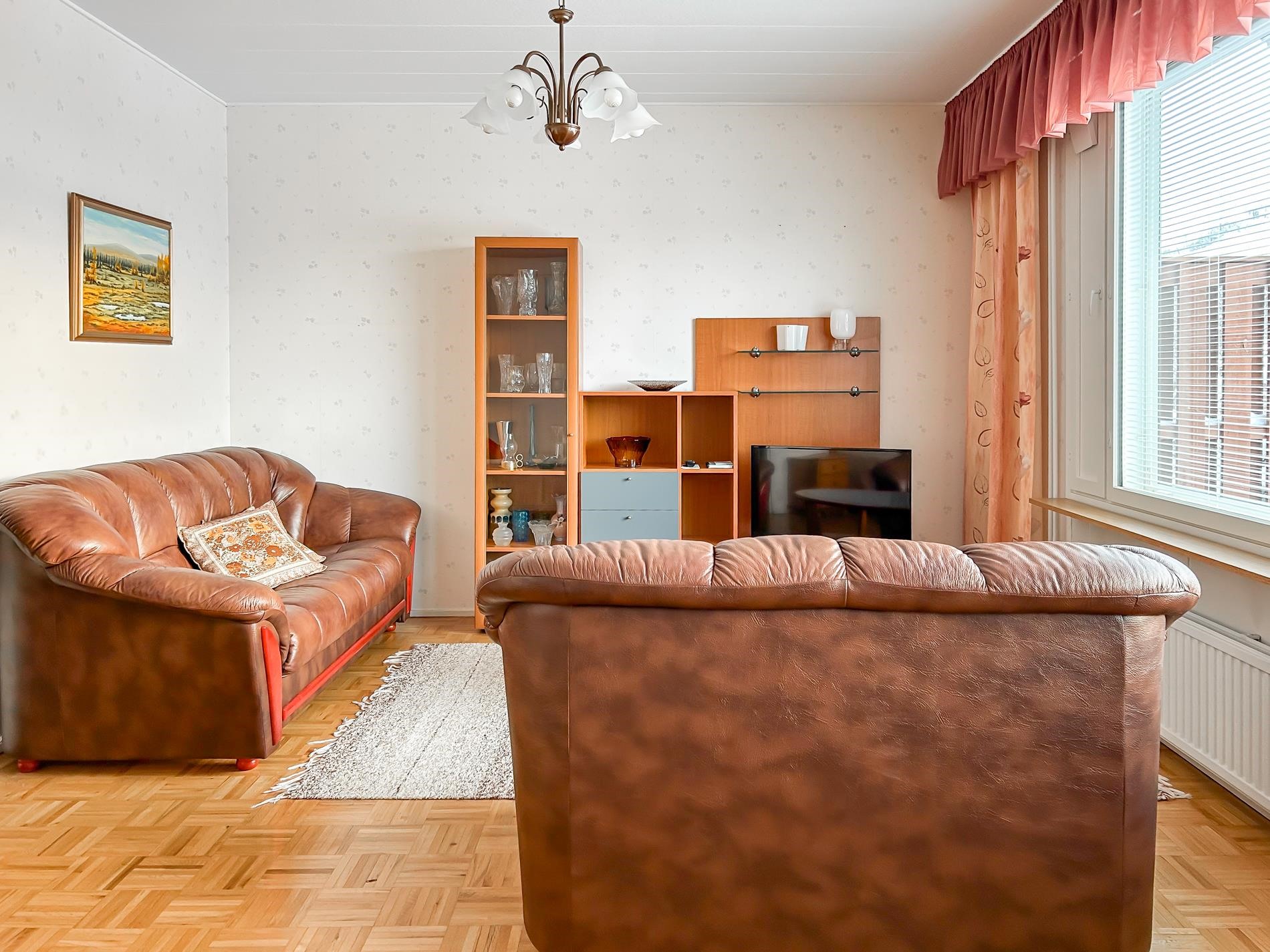 Keittiö: tapettia seinissä, parketti lattiassa. Olohuone: maalia seinissä, parketti lattiassa. Makuuhuone 1: tapettia seinissä, muovimatto lattiassa. Sauna: paneelia seinissä, maalattu betoni lattiassa. Kylpyhuone: muovimatto seinissä ja lattiassa. Eteinen: maalia seinissä, parketti lattiassa.