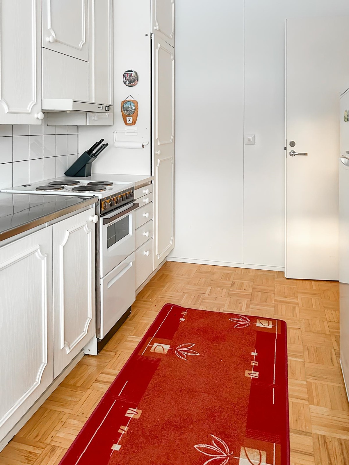- Jääkaappipakastin ns. jenkkikaappi, sähköliesi, liesituuletin, kaapistot vaaleat, kiinteät valaisimet. astianpesukoneliitäntä