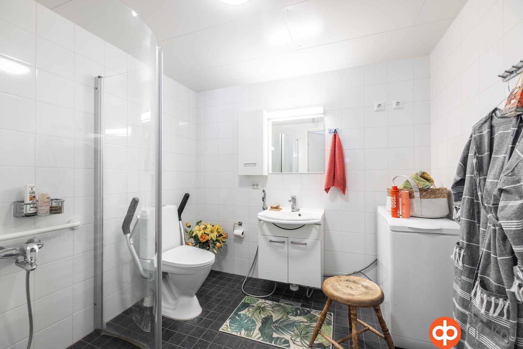 - Kylpyhuone, suihku, suihkuseinä, peilikaappi, allaskaappi, pesukoneliitäntä, lattialämmitys pesuhuoneessa, kiinteät valaisimet.