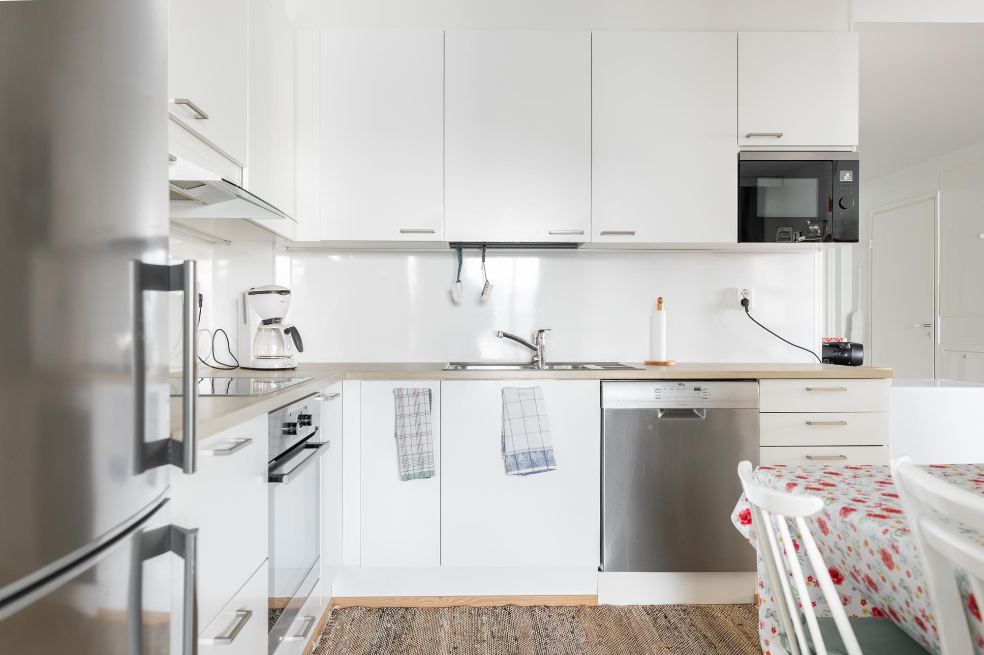 - Jääkaappipakastin, erillisuuni, induktioliesi, liesituuletin, mikroaaltouuni Integroitu, astianpesukone, kaapistot, kiinteät valaisimet.