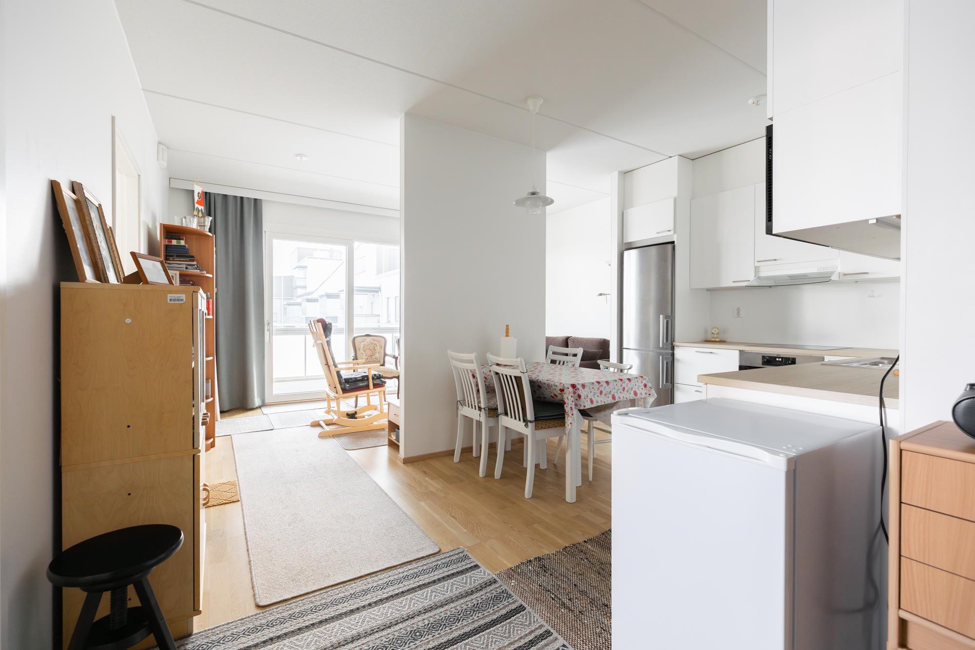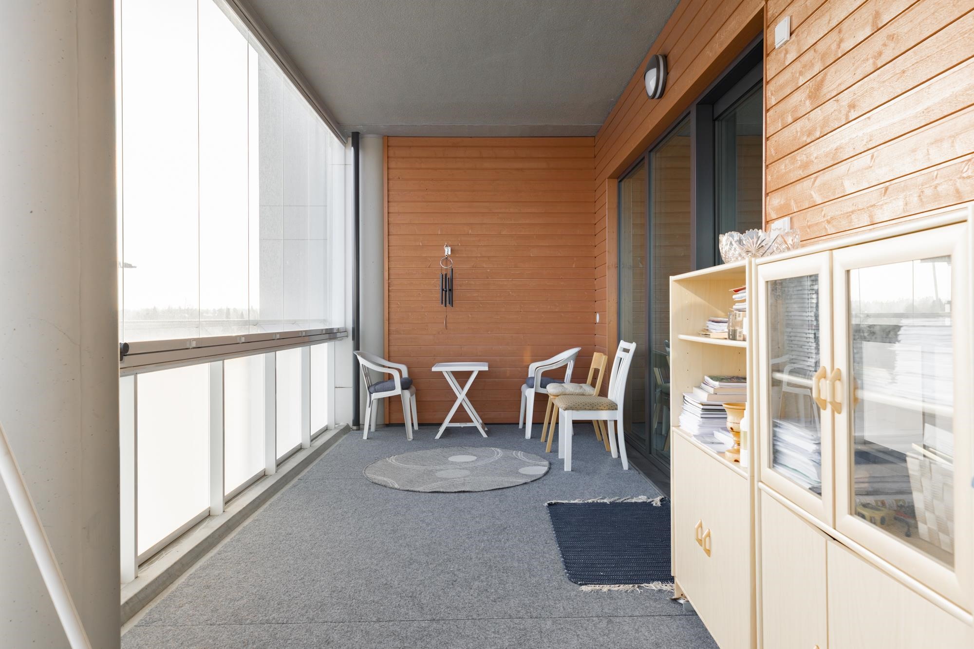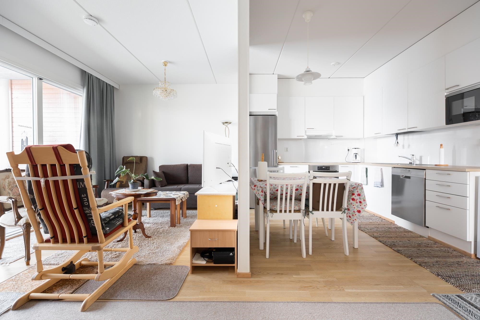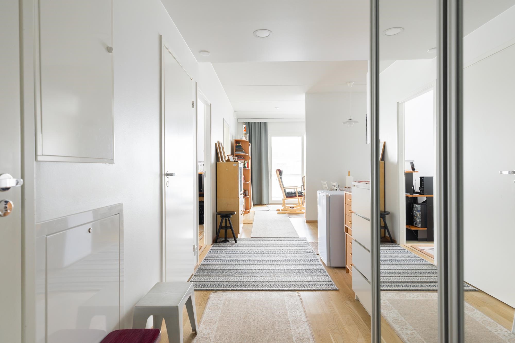 Pohjaratkaisu soveltuu mainiosti monenlaiseen tarpeeseen ja säilytystilan määrä on optimaalinen. Asunto on sisustettu laadukkain ja tyylikkäin materiaalein, ja asuintiloihin tulvii runsaasti valoa isoista ikkunoista.