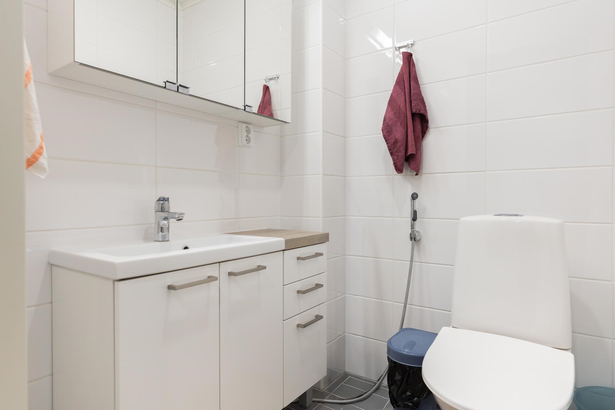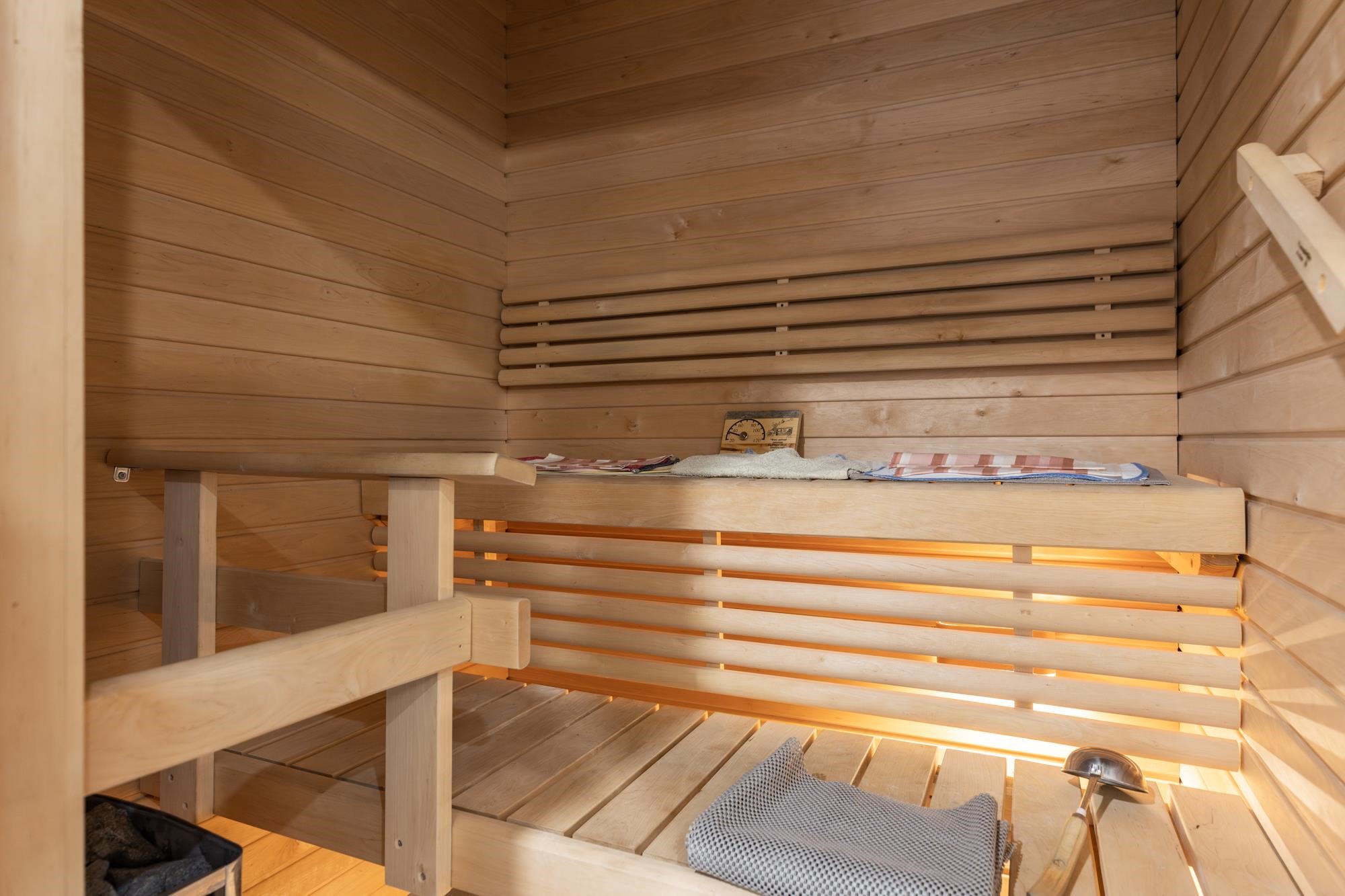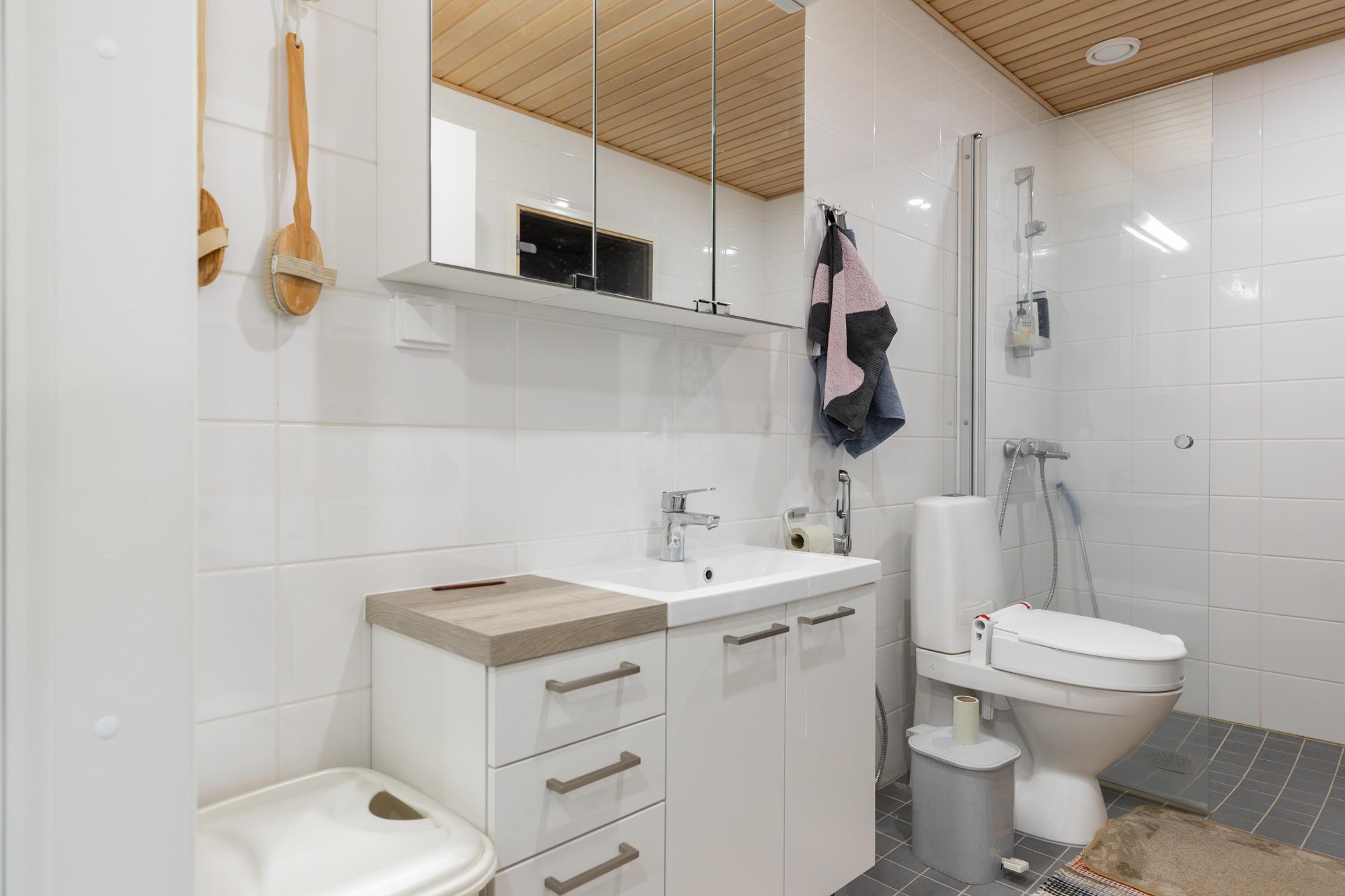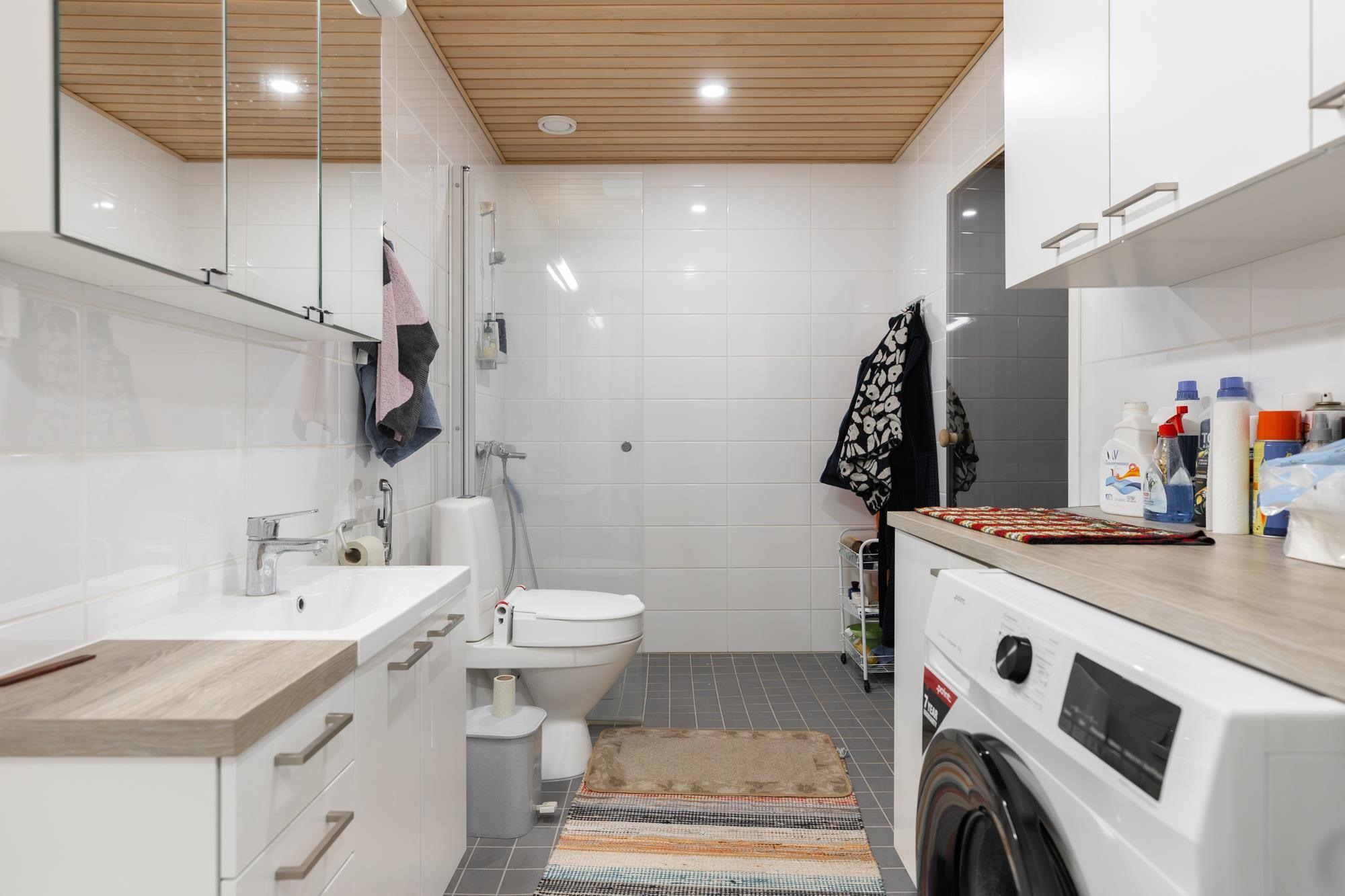 - Sauna, sähkökiuas, erillinen wc, suihku, peilikaappi, allaskaappi, pesukoneliitäntä, lattialämmitys, kiinteät valaisimet.