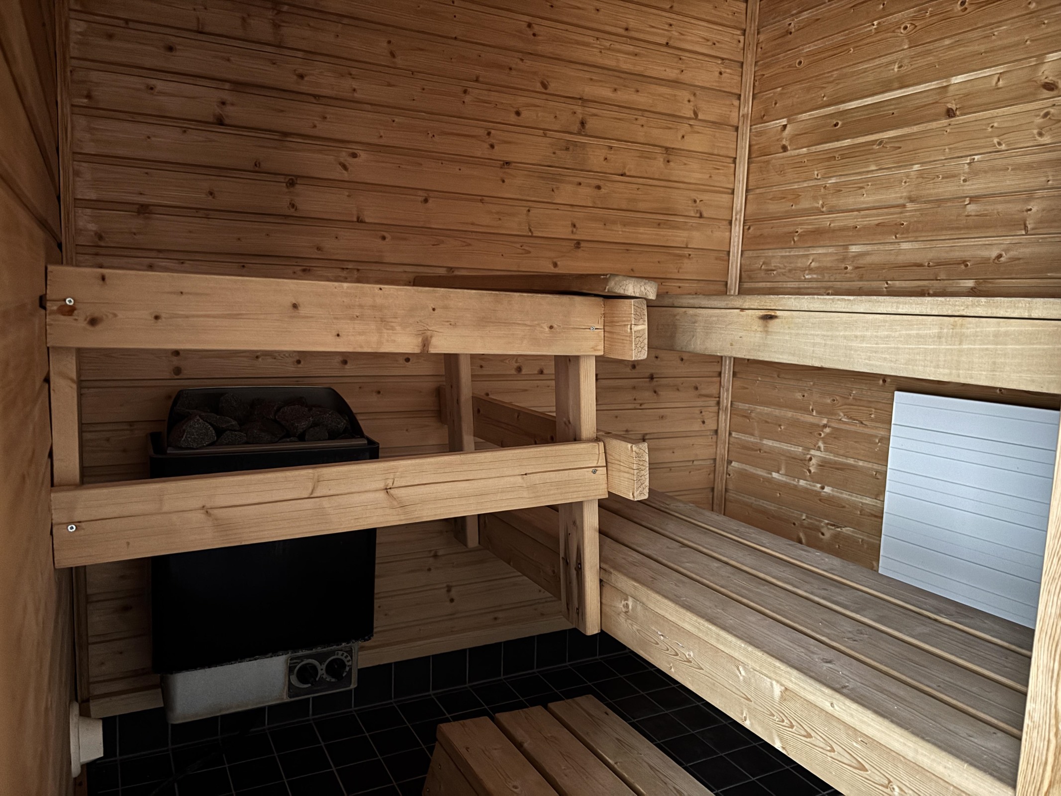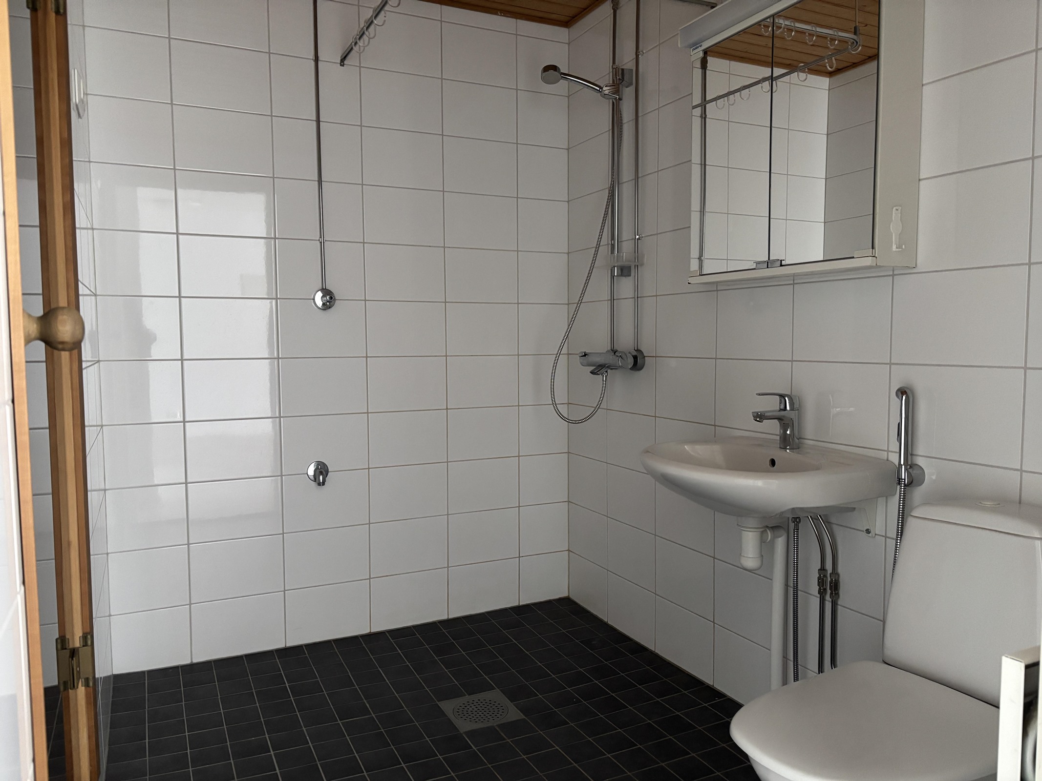 - Sauna, sähkökiuas, kylpyhuone, suihku, peilikaappi, allaskaappi, pesukoneliitäntä, kiinteät valaisimet.