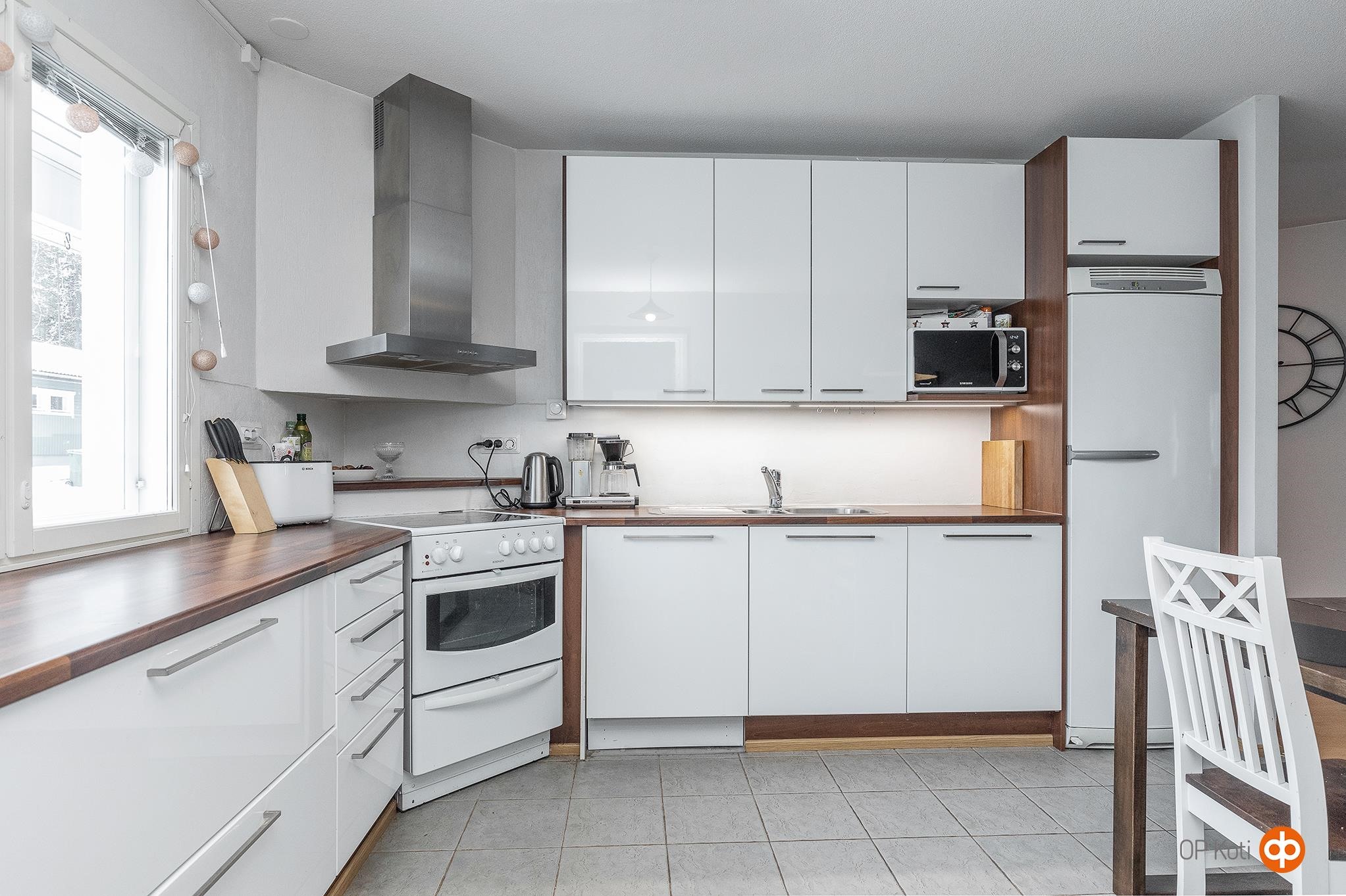 - Jääkaappi, pakastekaappi, keraaminen liesi, liesituuletin, astianpesukone, kaapistot, kiinteät valaisimet, pöytätasojen materiaali : Laminaatti.