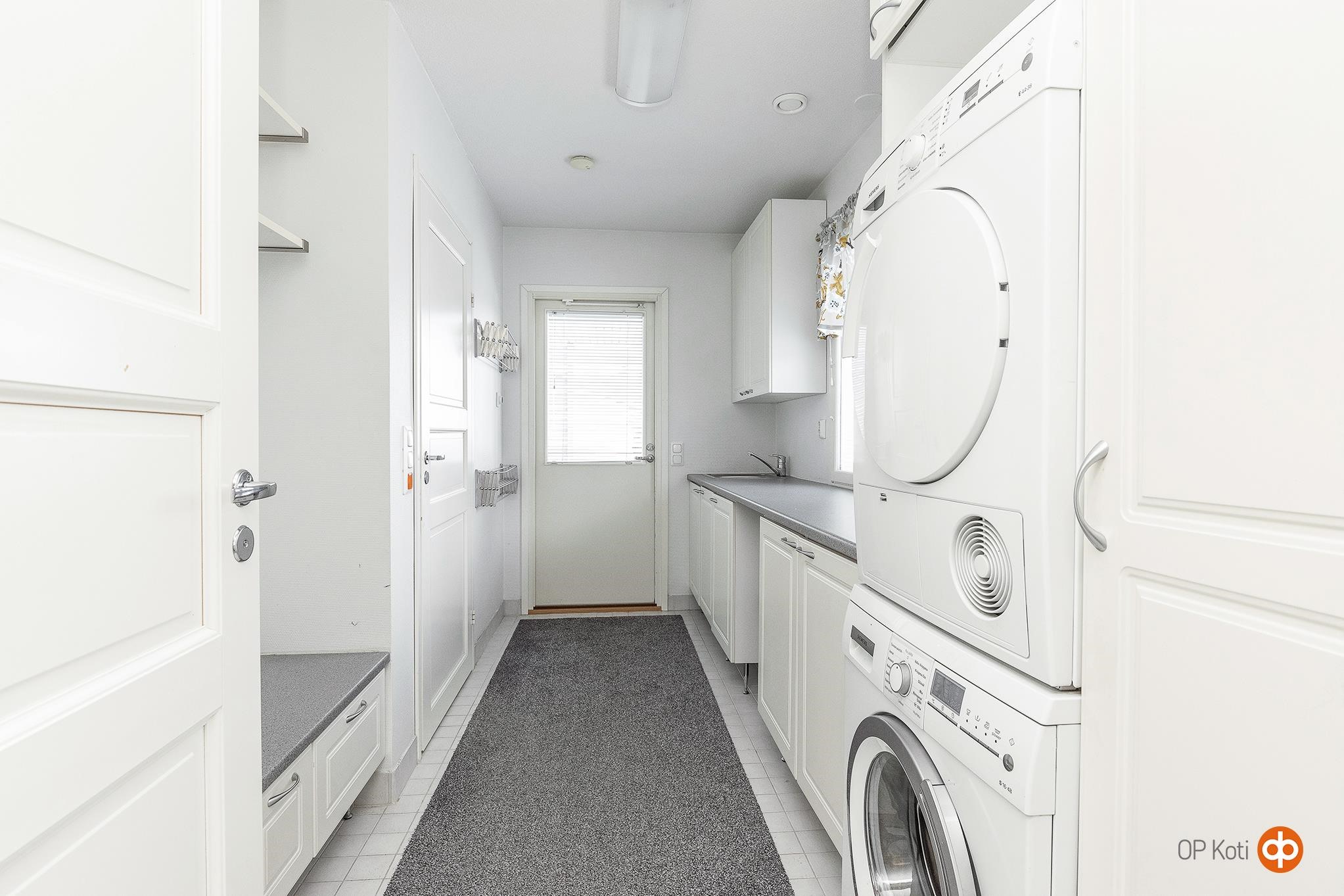 Lasten ja aikuisten makuutilat on sijoitettu omiin rauhallisiin kokonaisuuksiinsa. Aikuisten makuuhuoneesta on suora käynti pesu- ja saunatiloihin, jossa on myös wc-istuin. Pesutilojen yhteydessä sijaitsee tilava kodinhoitohuone, josta on kulku sekä keittiöön että suoraan ulos pihalle.