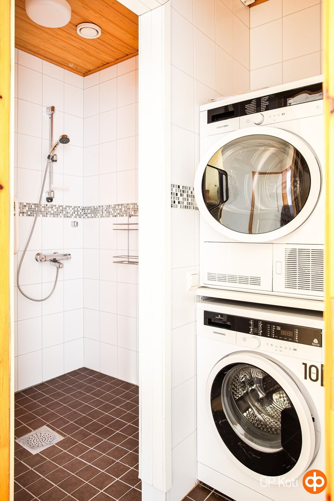 Kylpyhuoneessa vaaleat laatat, samassa tilassa seinällä erotettu kodinhoitotila. Ikkunallinen siistikuntoinen sauna.
