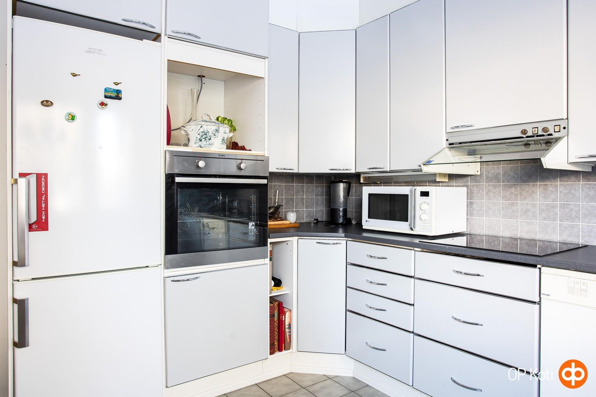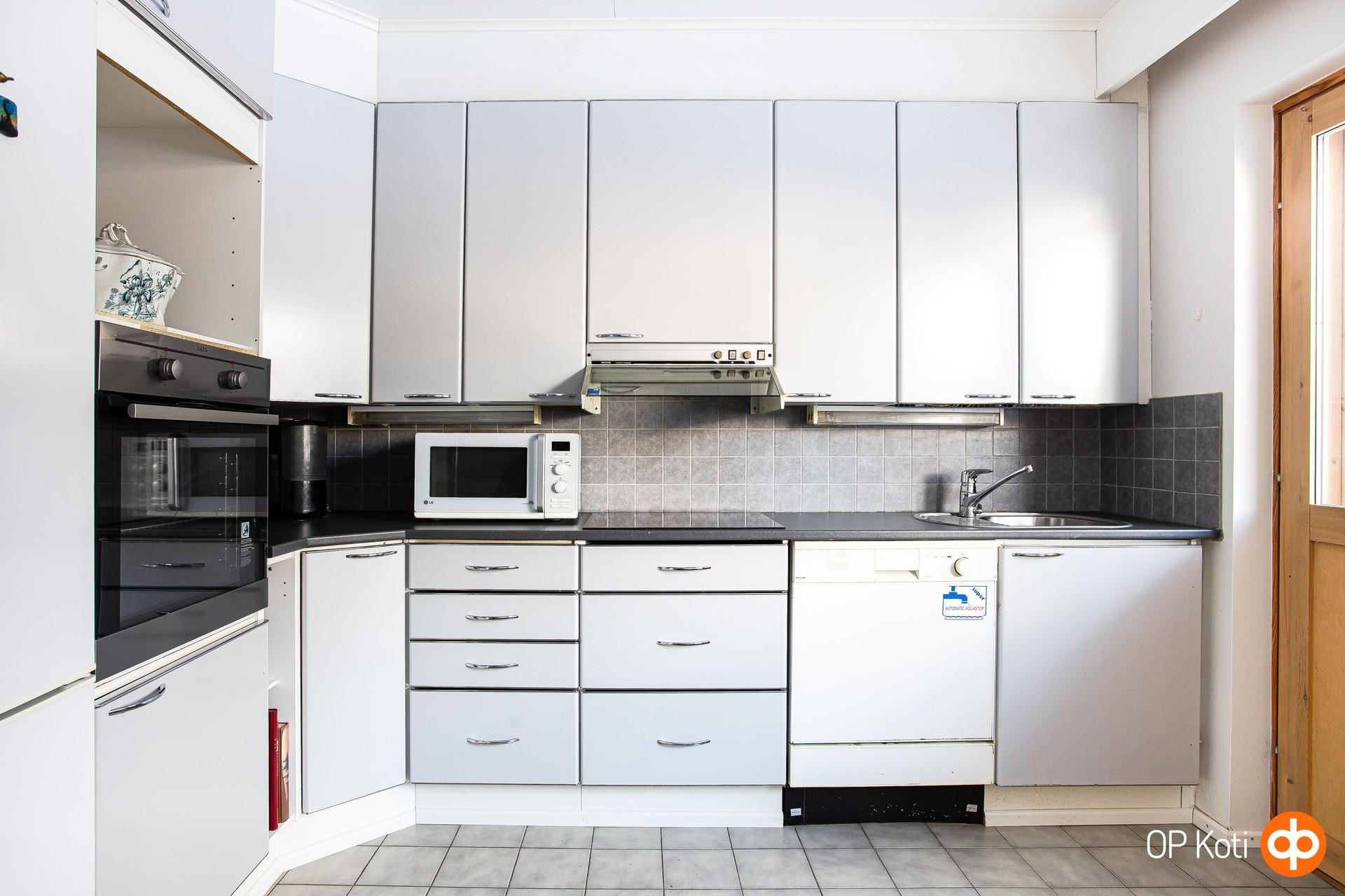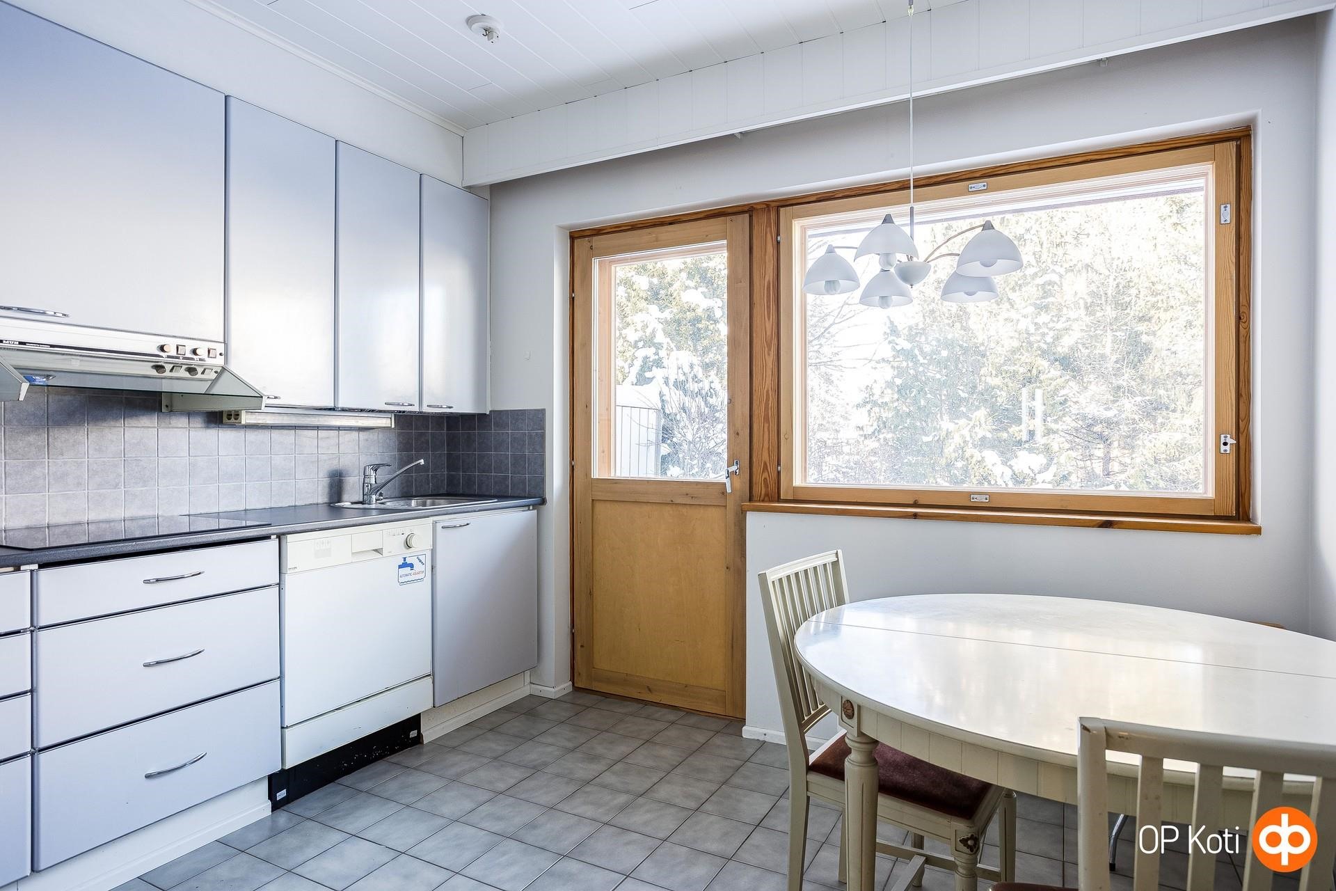 Keittiössä kestävät kiiltäväpintaiset laminaattiovet ja tila ruokapöydälle. Keittiöstä käynti takapihan terassille.