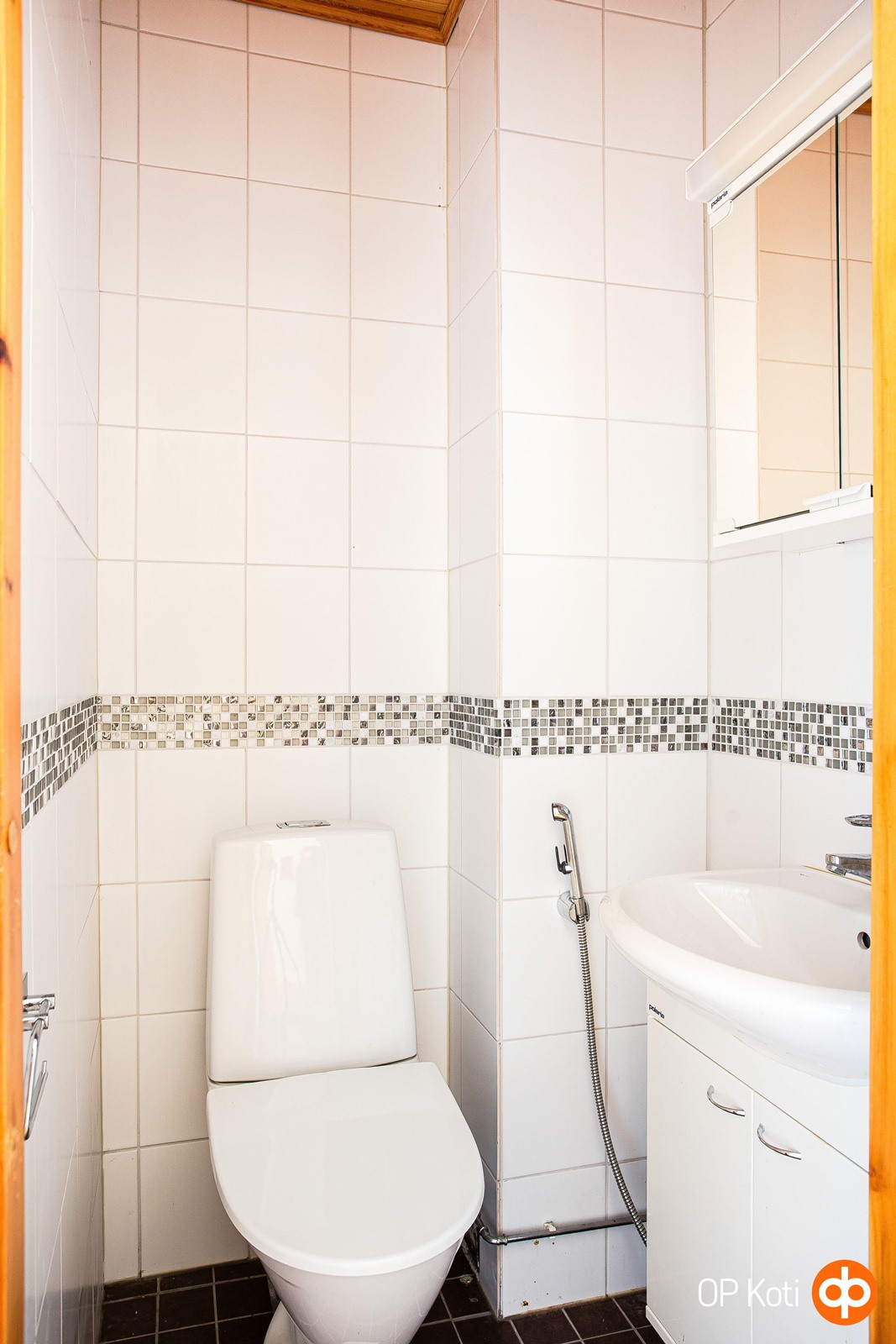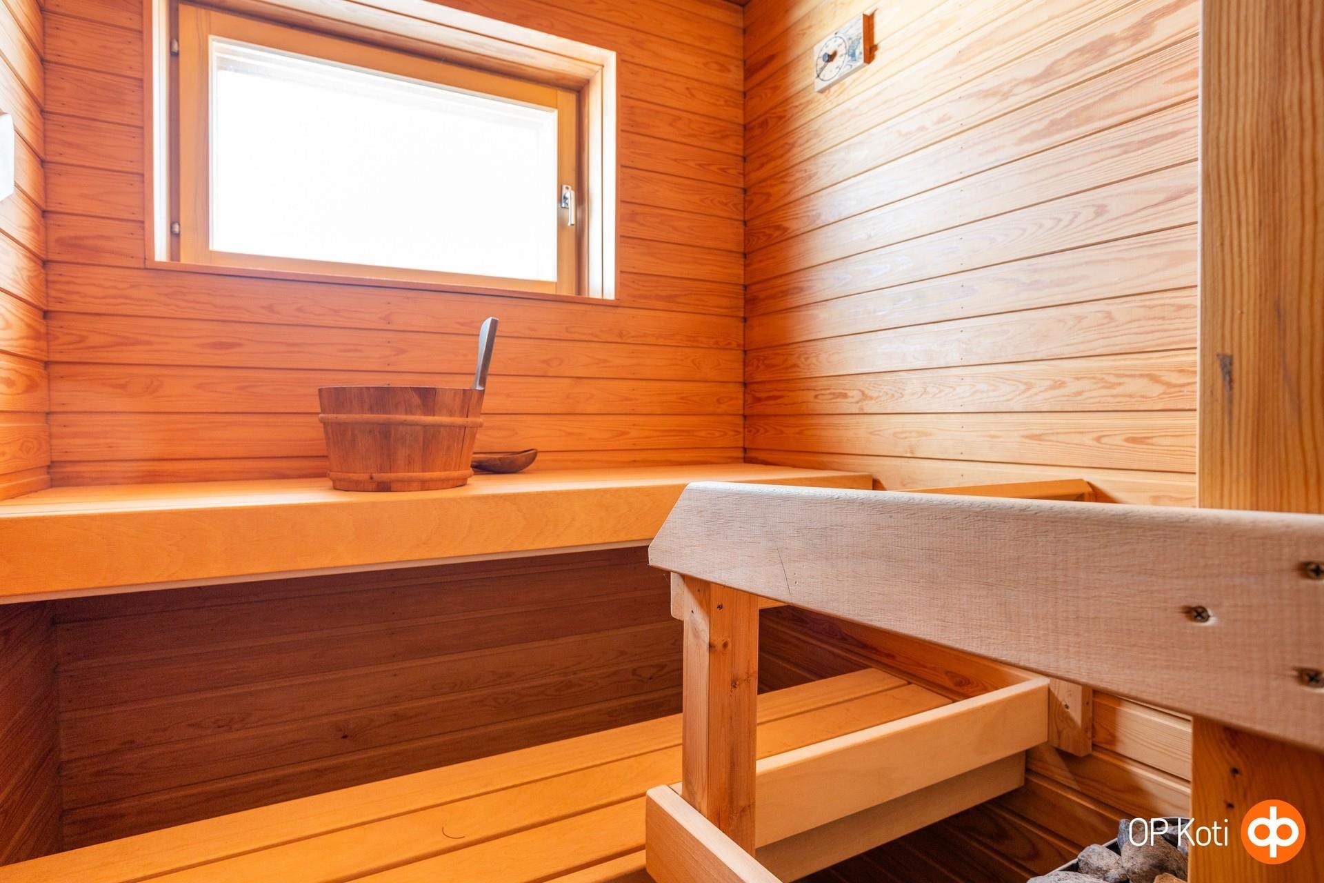 - Sauna, sähkökiuas, kylpyhuone, erillinen wc, suihku, peilikaappi, allaskaappi, pesukoneliitäntä, lattialämmitys keittiössä ja kylpyhuoneessa, sähköllä, kiinteät valaisimet, asiakkaan asennuttama tuki kylpyhuoneessa.