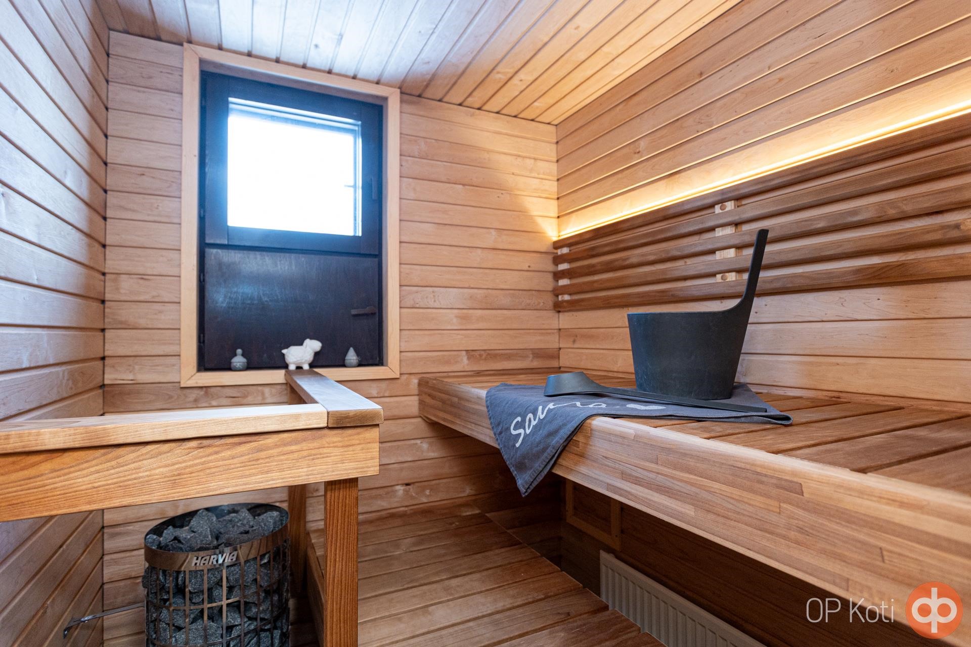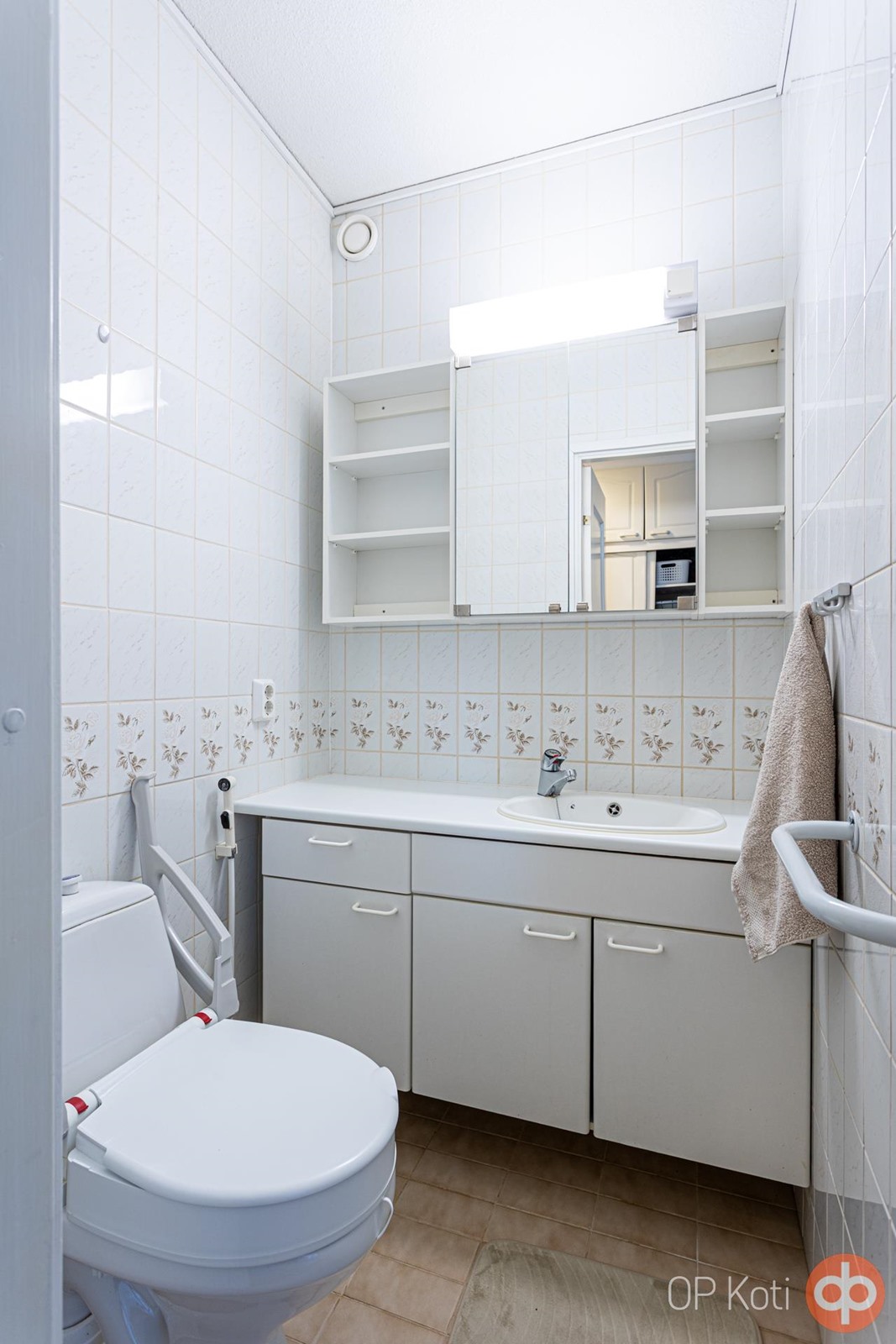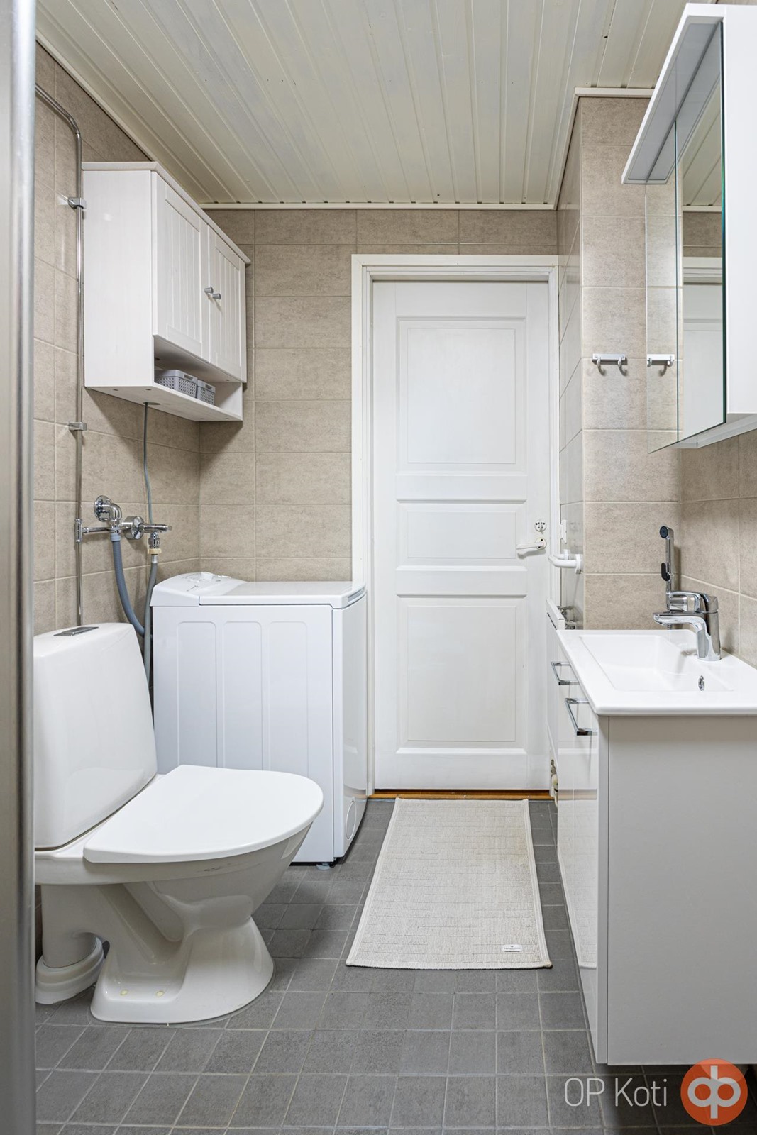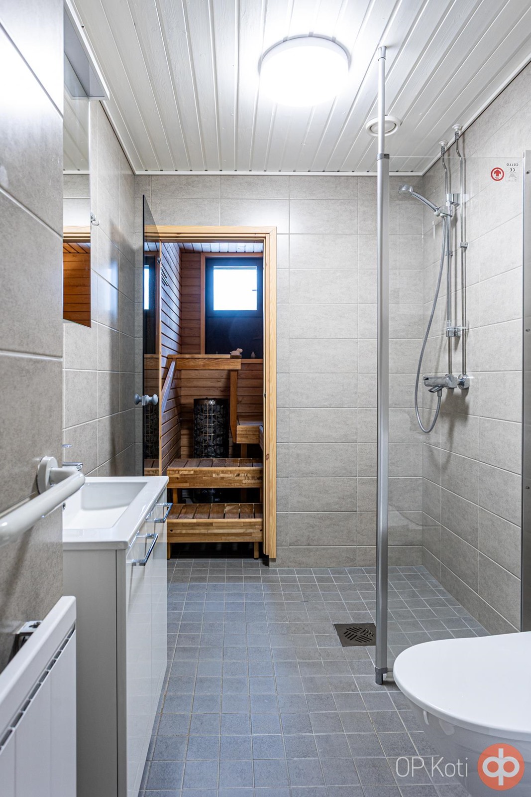 - Sauna, sähkökiuas, kylpyhuone, erillinen wc, suihku, suihkuseinä, peilikaappi, kaapit, allaskaappi, pesukoneliitäntä, lattialämmitys, kiinteät valaisimet.