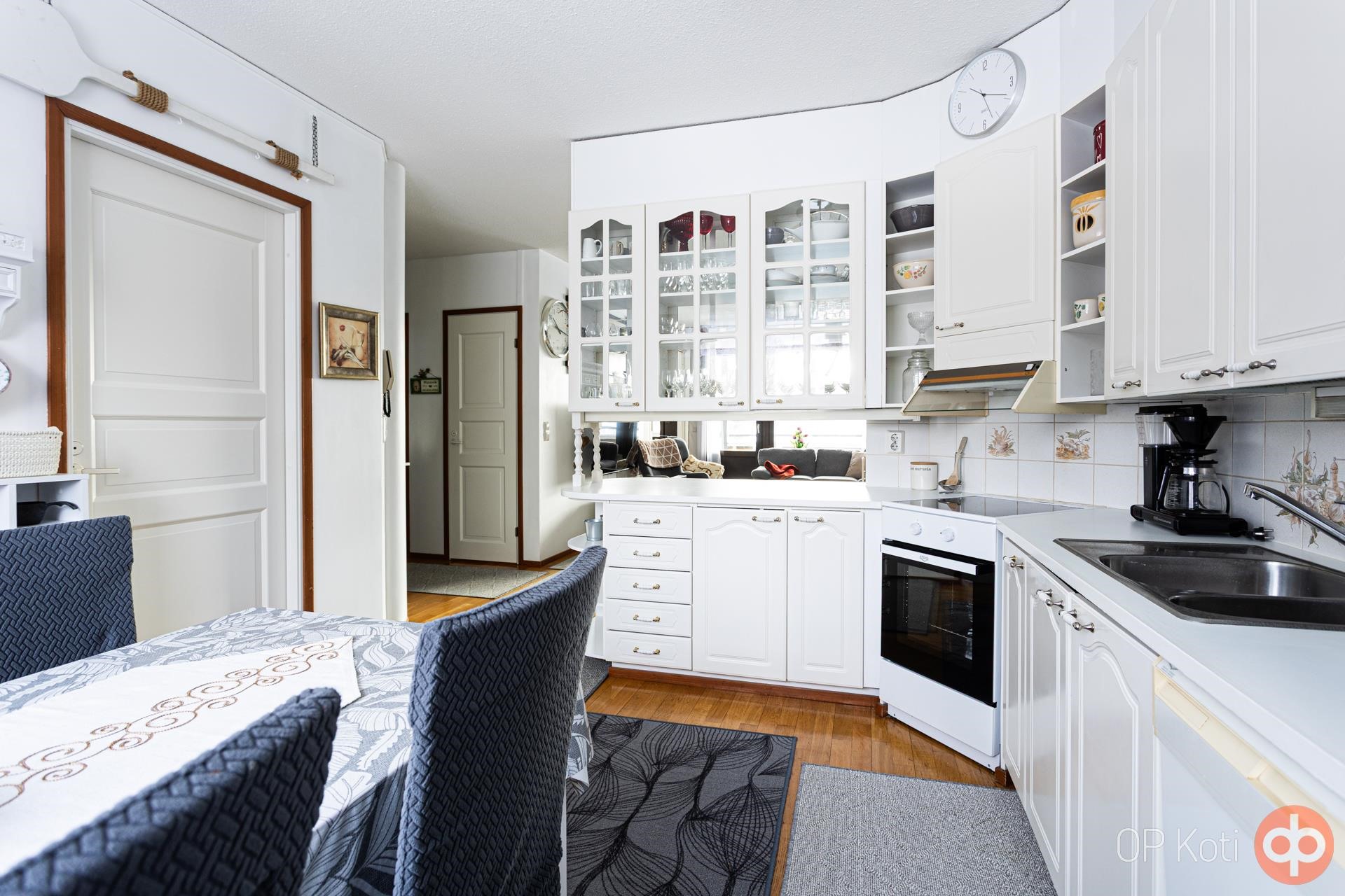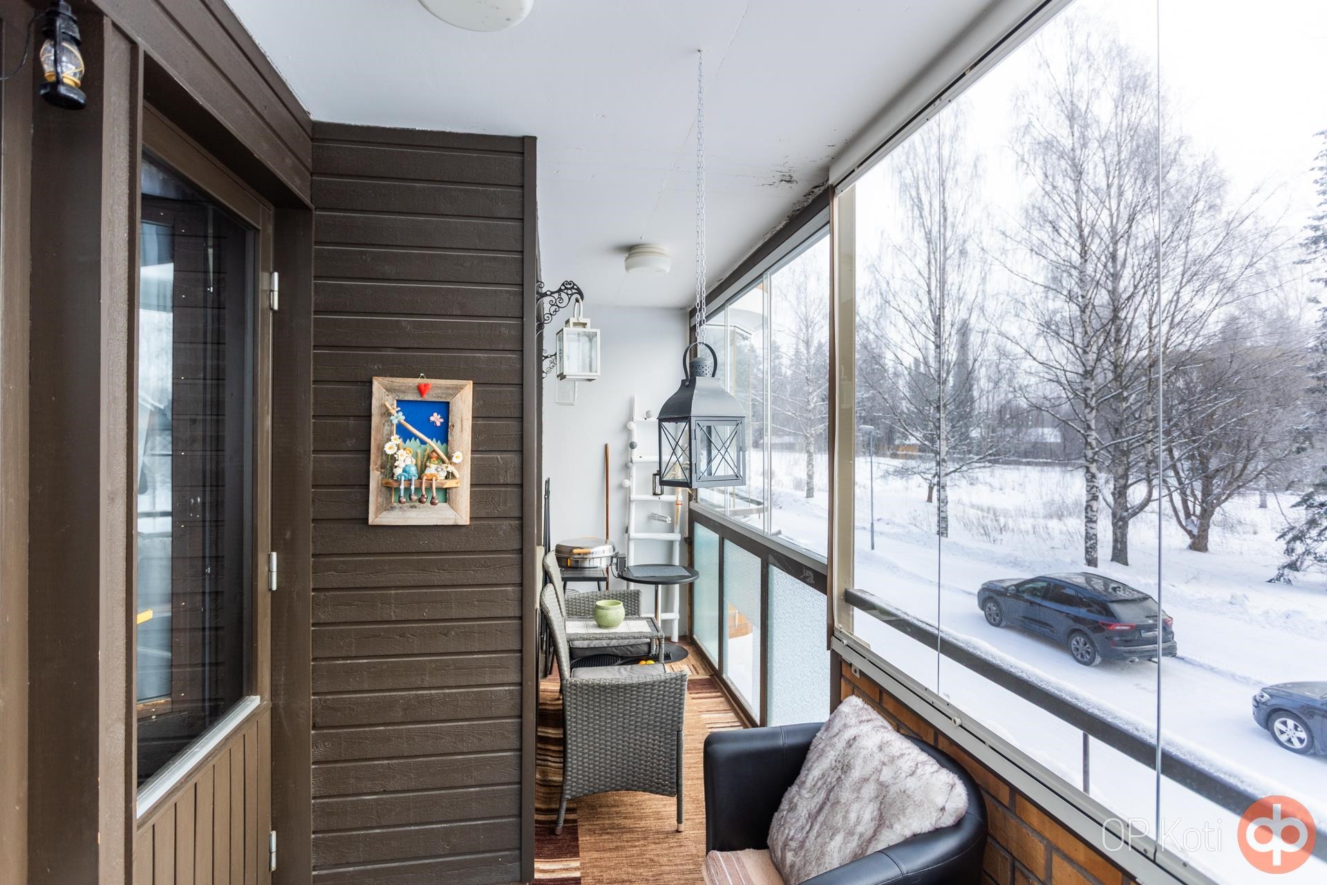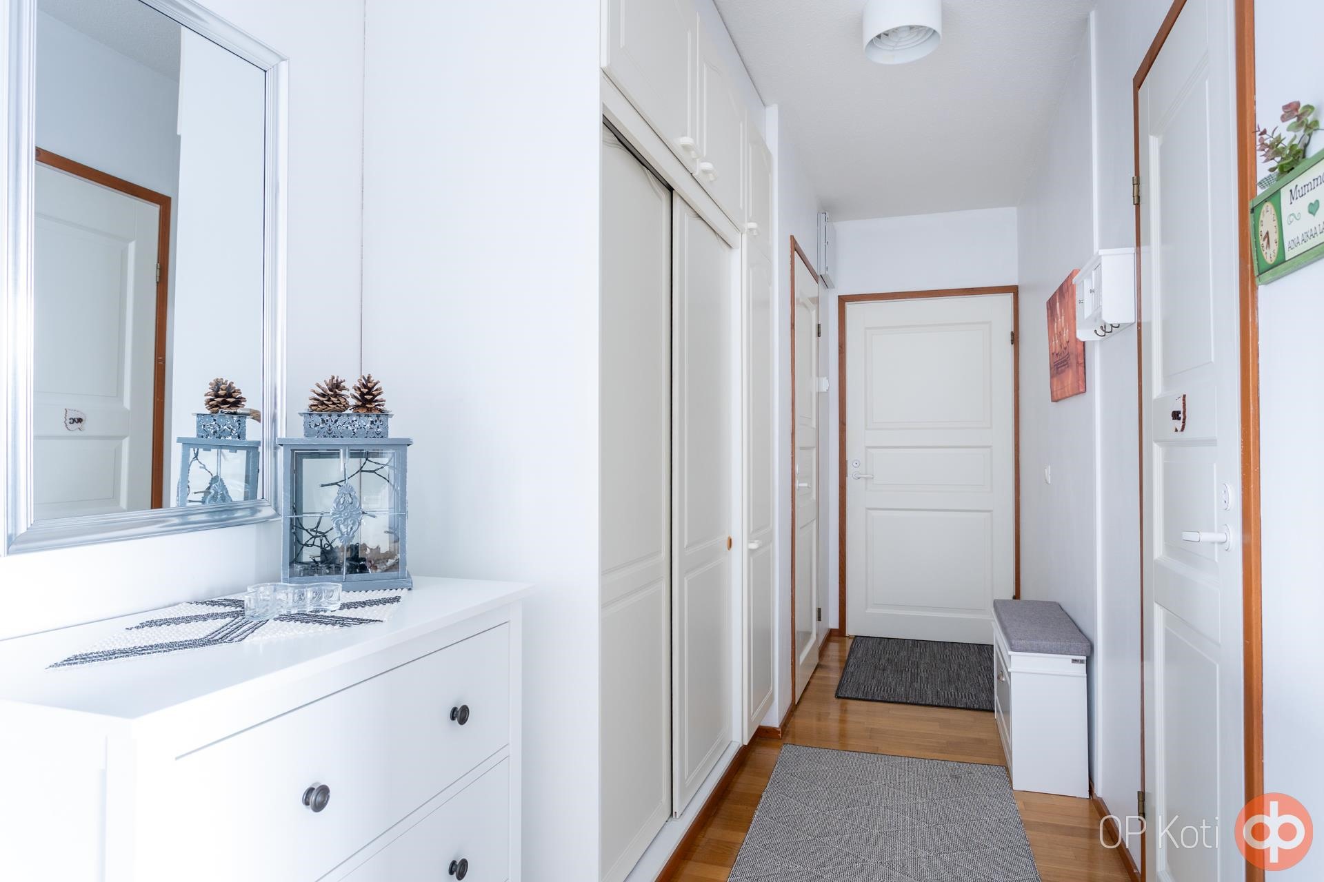 Tässä valoisassa läpitalon huoneistossa on tilava keittiö runsaine kaappitiloineen. Kodin lattiamateriaali on parketti ja uusittu kylpyhuone kaakeloitu. Viilennyspumppu antaa mukavasti kesän helteisiin helpotusta. Reilunkokoiselta lasitetulta parvekkeelta kauniit näkymät Paloisvirralle. Kodissa kaksi vessaa; erillinen wc ja toinen kylpyhuoneen yhteydessä.