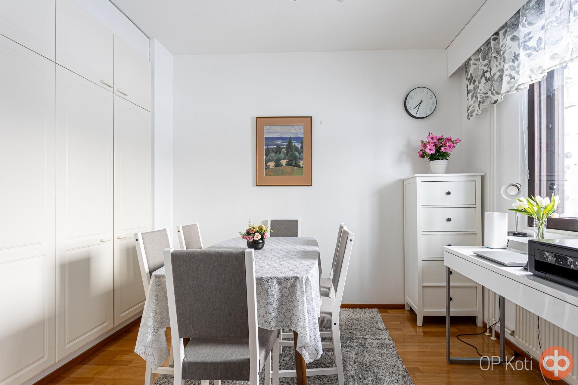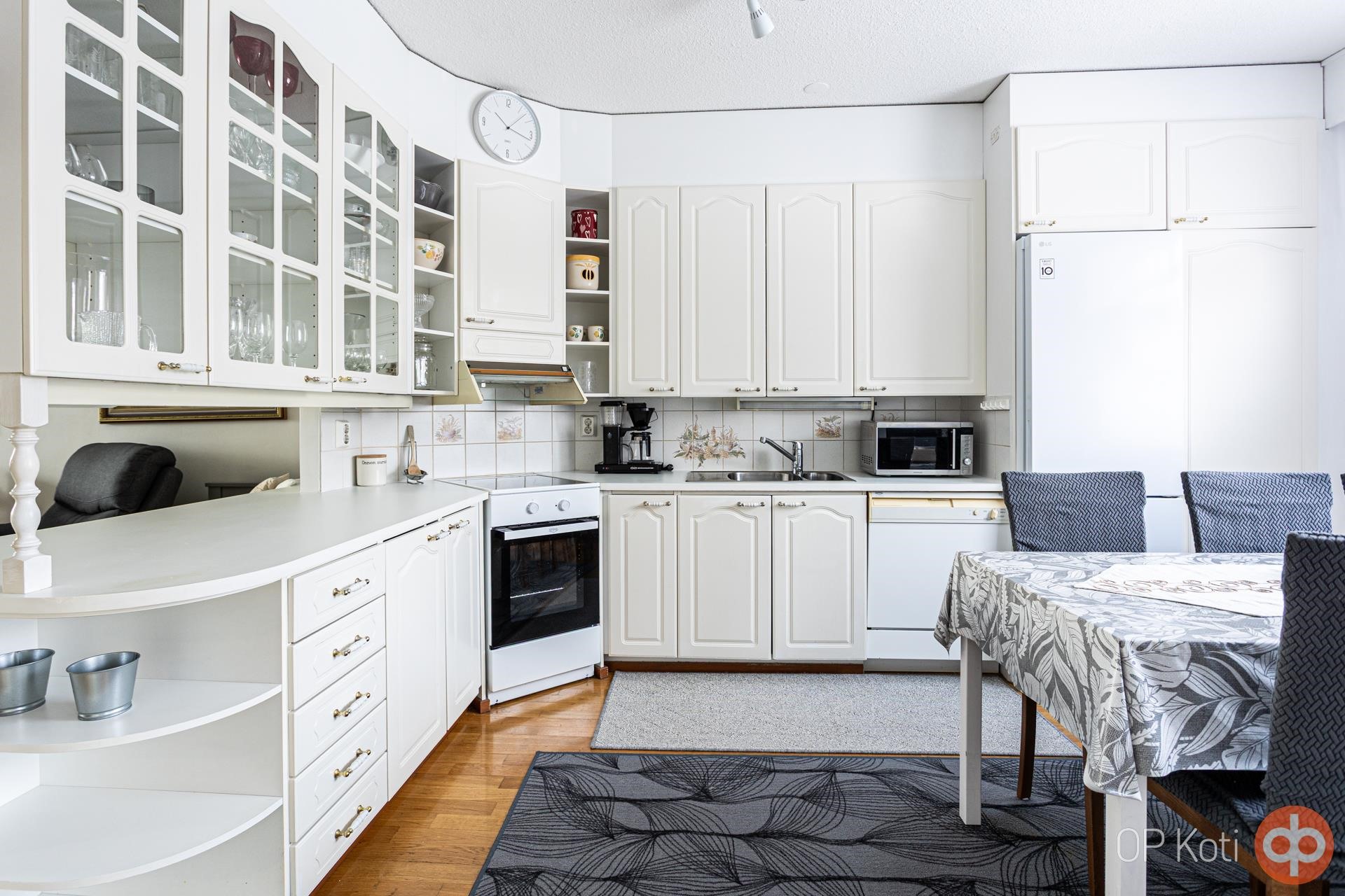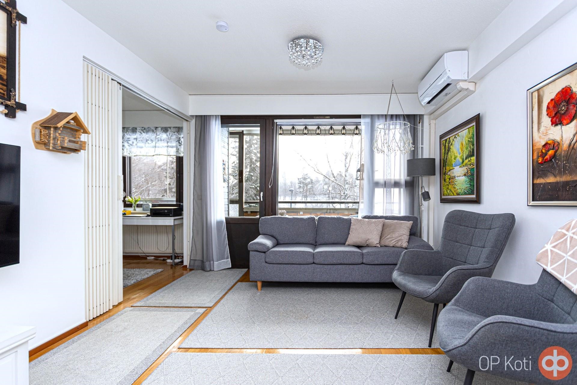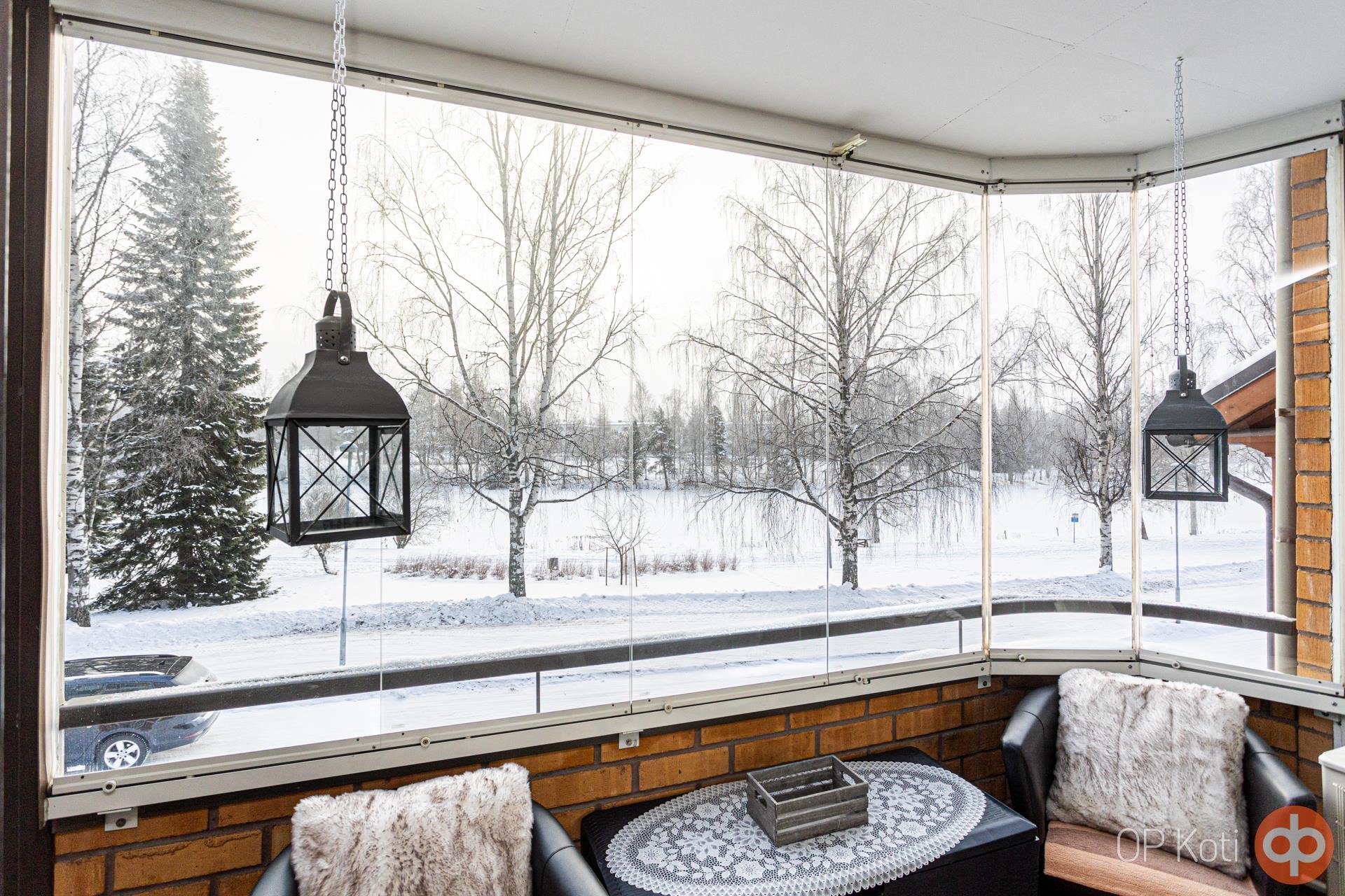 Tässä valoisassa läpitalon huoneistossa on tilava keittiö runsaine kaappitiloineen. Kodin lattiamateriaali on parketti ja uusittu kylpyhuone kaakeloitu. Viilennyspumppu antaa mukavasti kesän helteisiin helpotusta. Reilunkokoiselta lasitetulta parvekkeelta kauniit näkymät Paloisvirralle. Kodissa kaksi vessaa; erillinen wc ja toinen kylpyhuoneen yhteydessä.