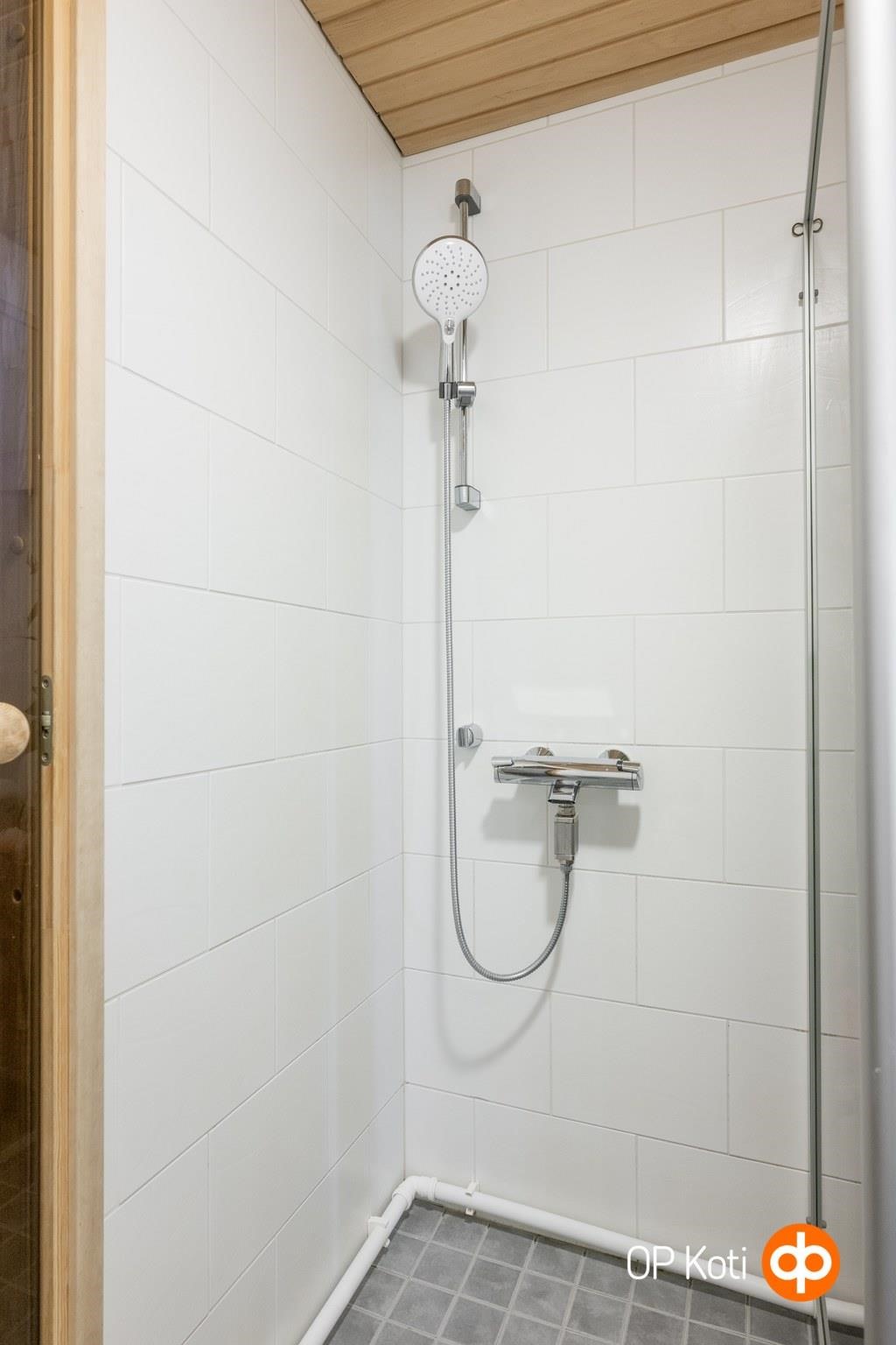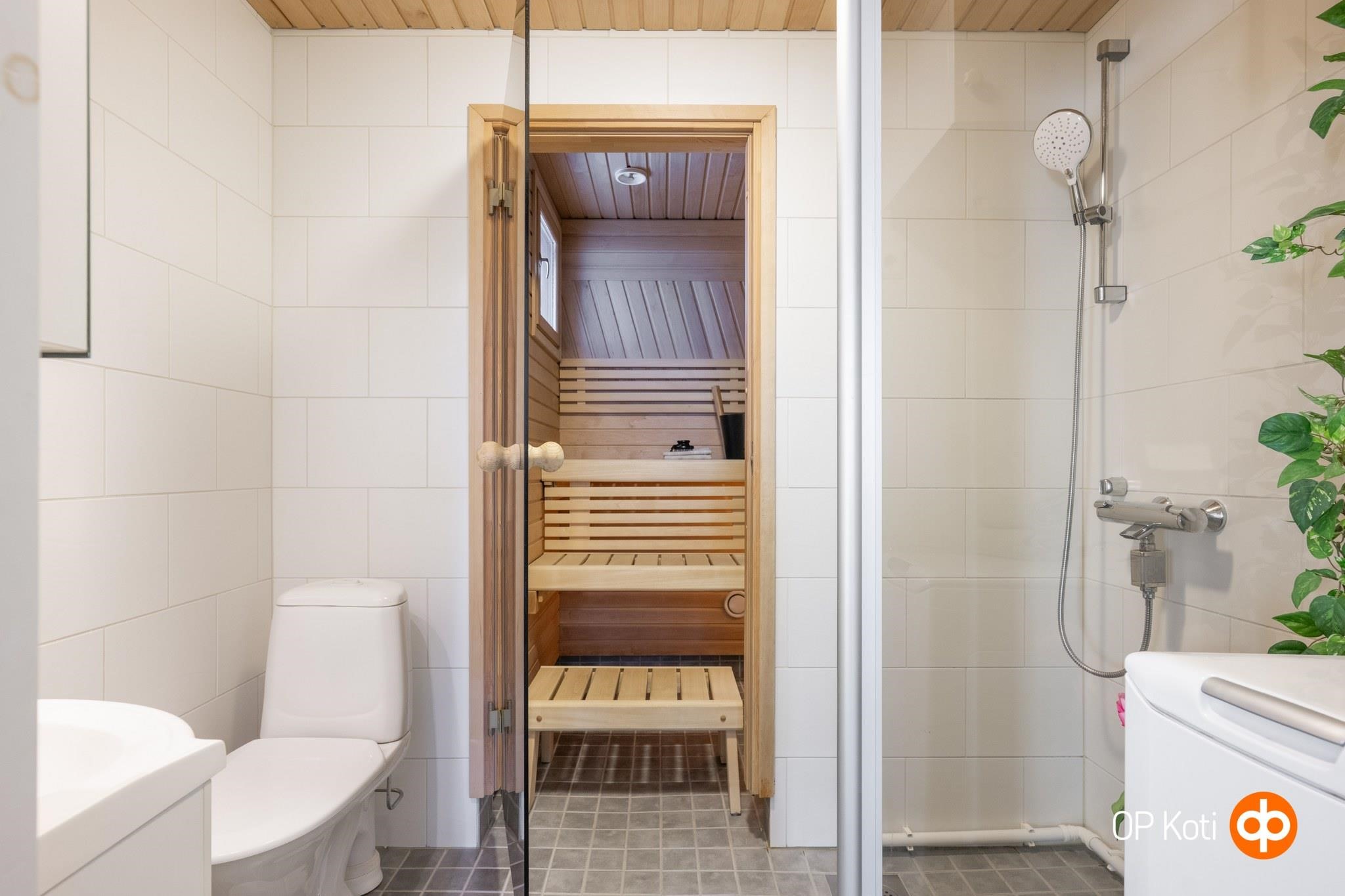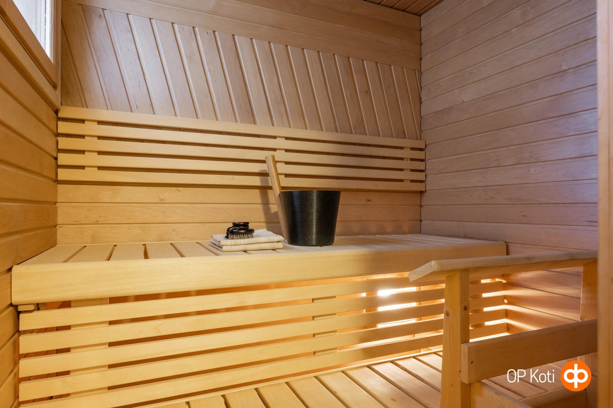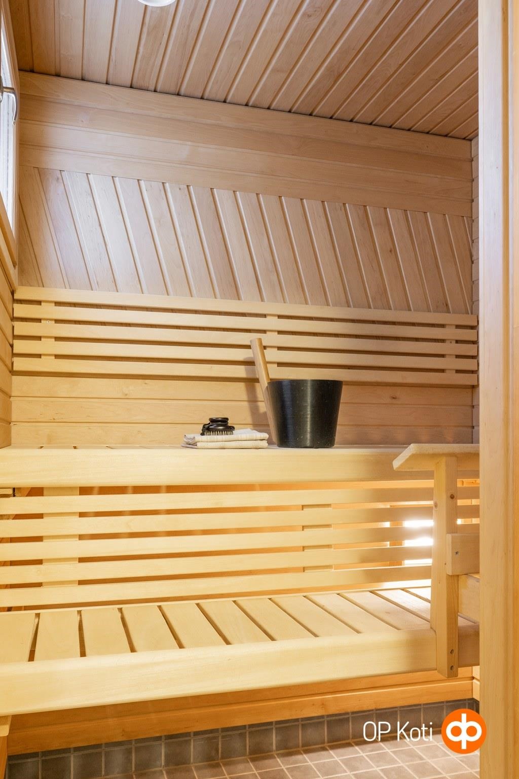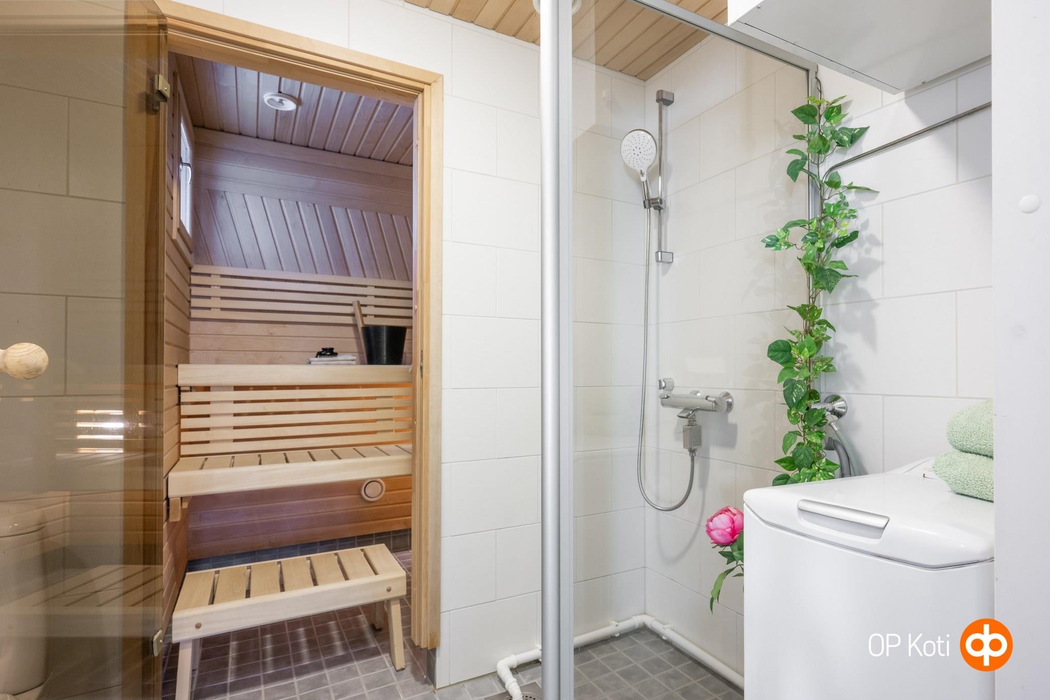 - Sauna, sähkökiuas, kylpyhuone, suihku, suihkuseinä, peilikaappi kph:ssa, allaskaappi kph:ssa, pesukoneliitäntä kph:ssa, lattialämmitys s:ssa ja kph:ssa, kiinteät valaisimet. Ilmastointikone kph:ssa