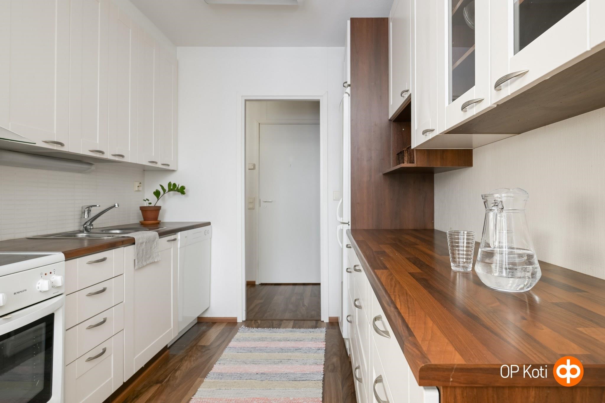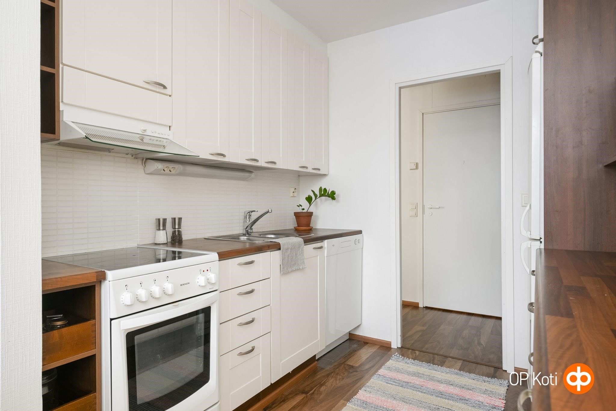 - Jääkaappipakastin, keraaminen liesi, liesituuletin, astianpesukone, kaapistot, kiinteät valaisimet.