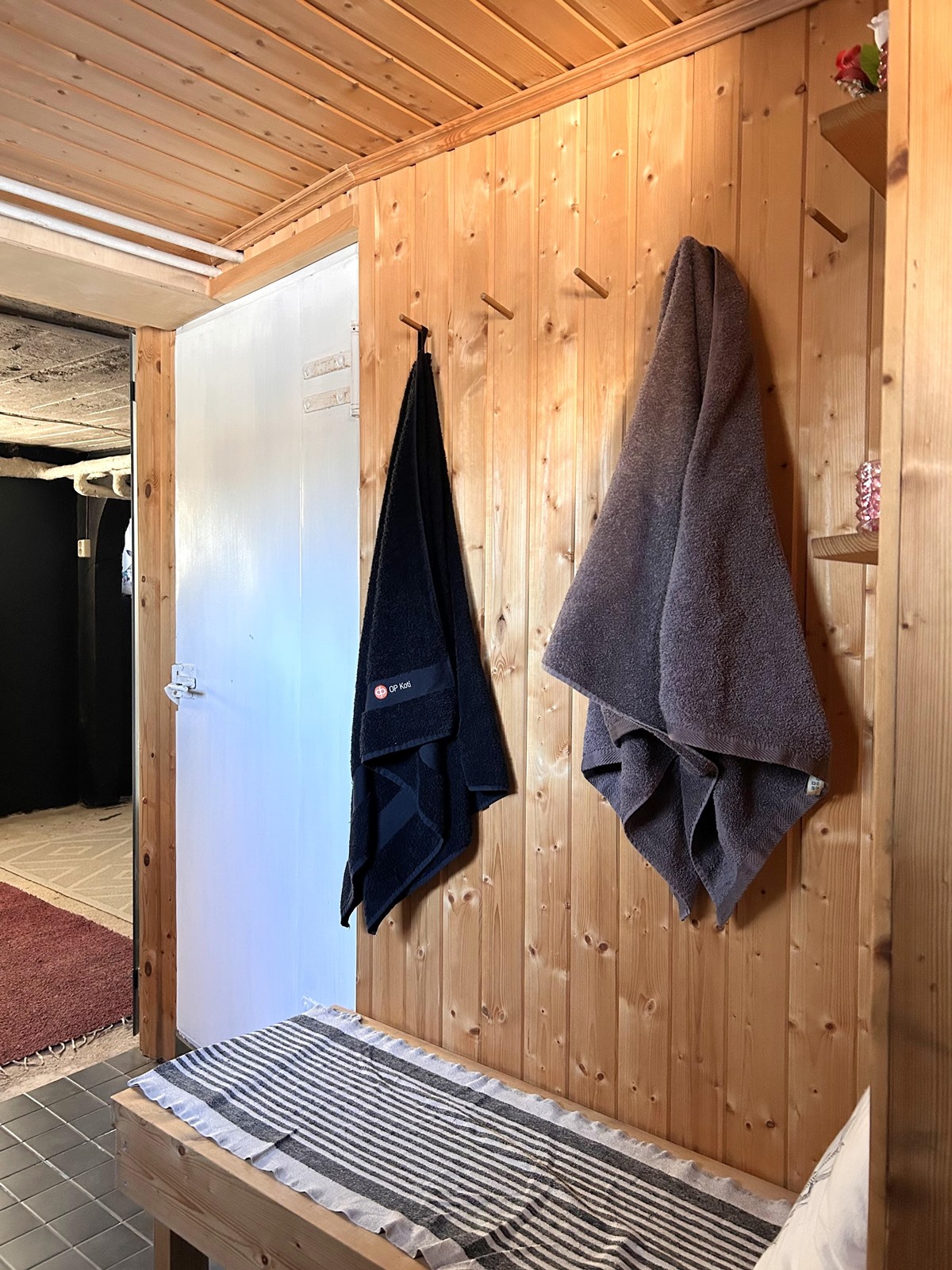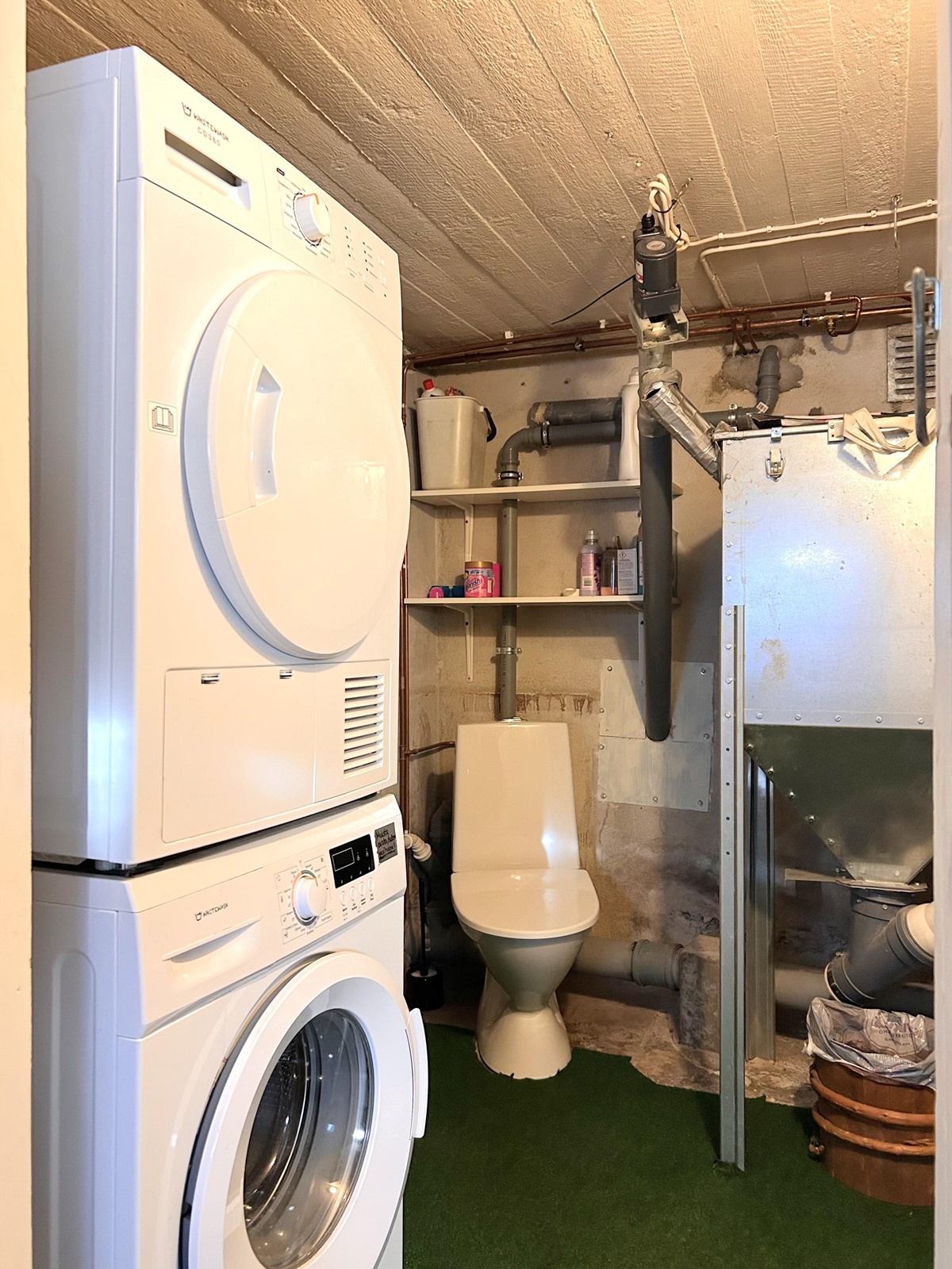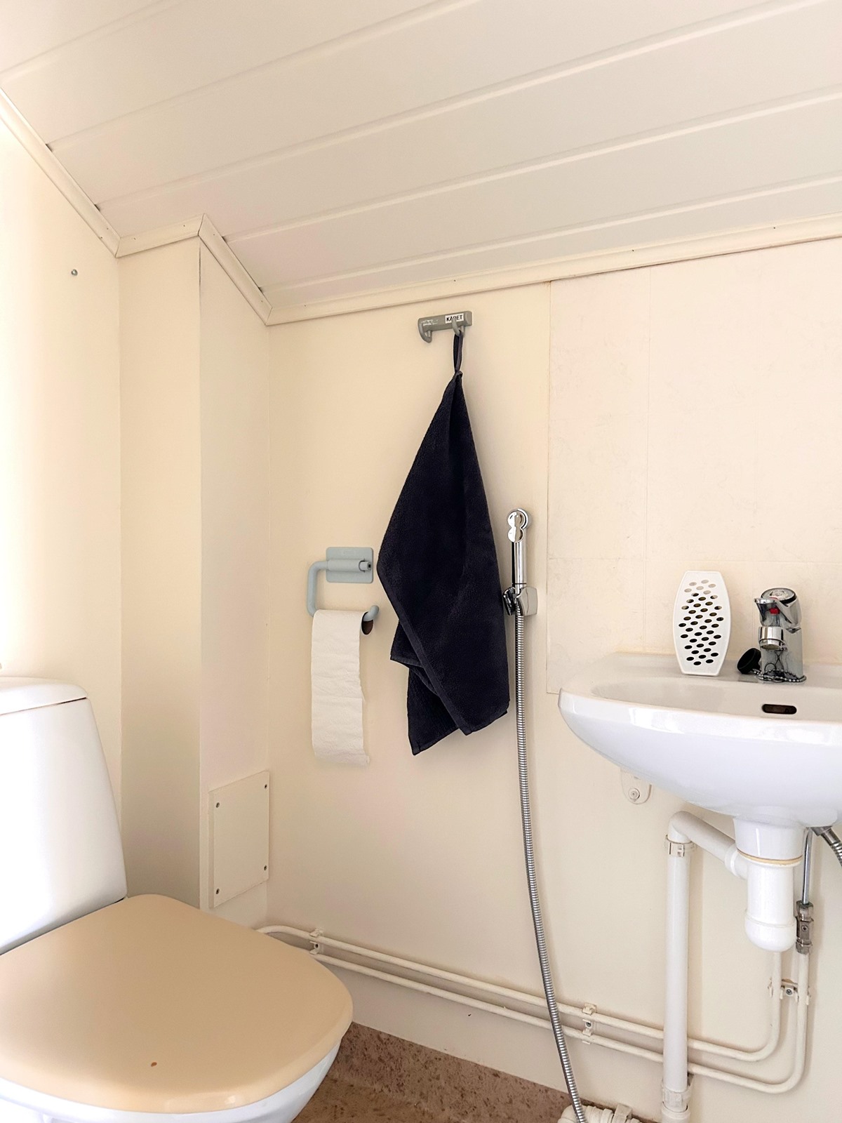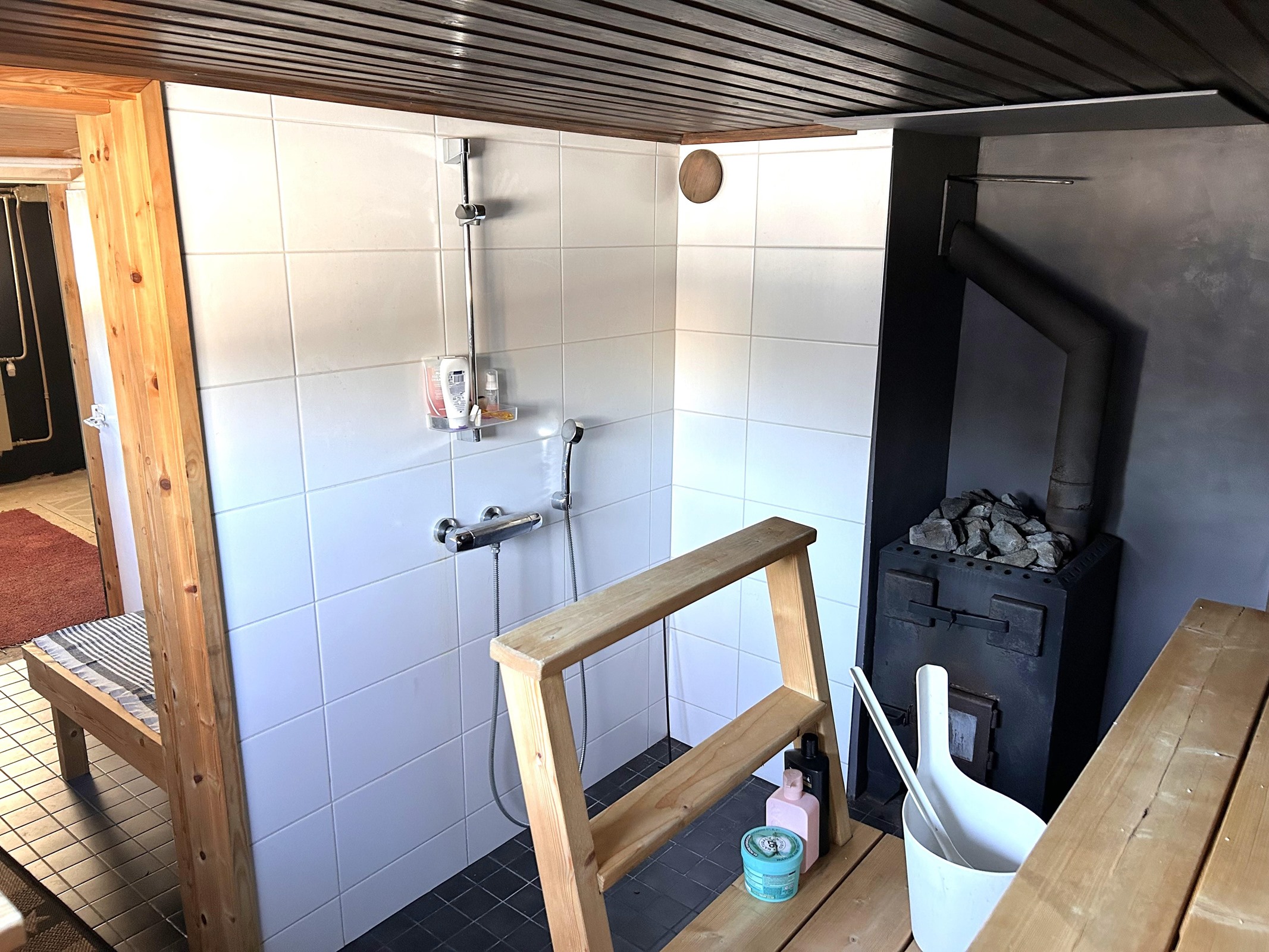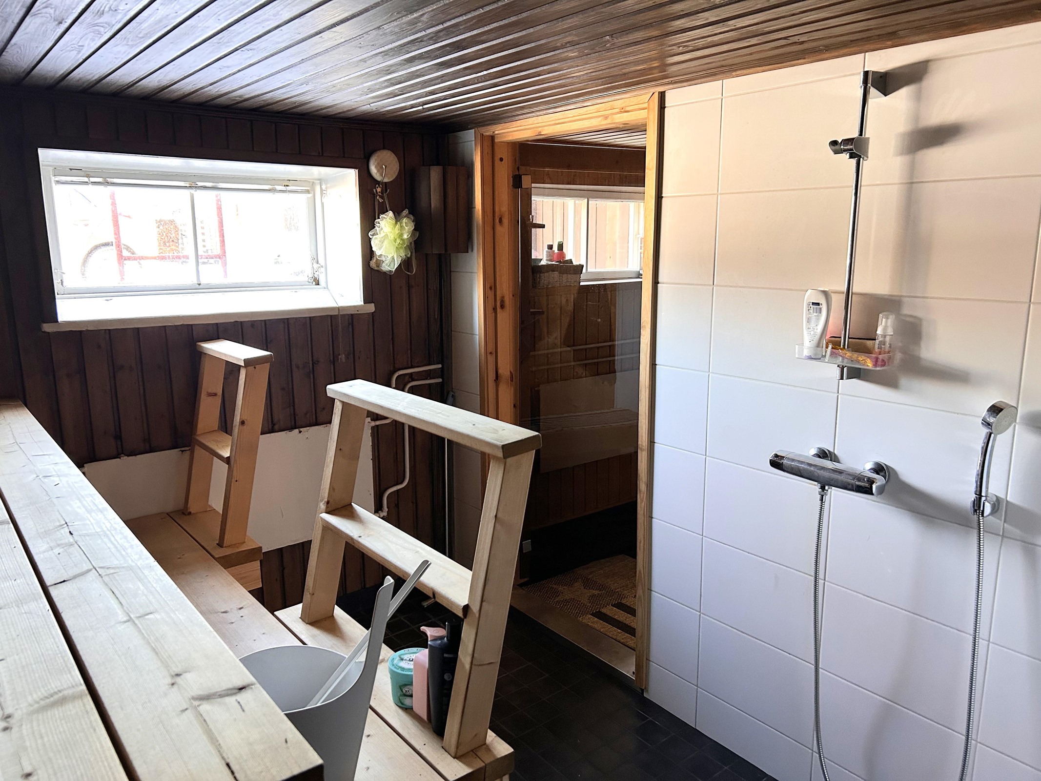 - Tässä kodissa on yhteensä kolme wc:tä; yksi kussakin kerroksessa. Yläkerran isomman makuuhuoneen yhteydessä on kylpyhuone, jossa suihkukaappi ja käsienpesuallas. Yläkerran eteistilassa erillinen wc. Asuinkerroksessa erillinen wc. Kellarikerroksen kodinhoitotilan yhteydessä kodin kolmas wc. Saunaosasto pukuhuoneineen sijaitsee tässä kerroksessa. Saunassa puulämmitteinen kiuas ja tilavat lauteet.