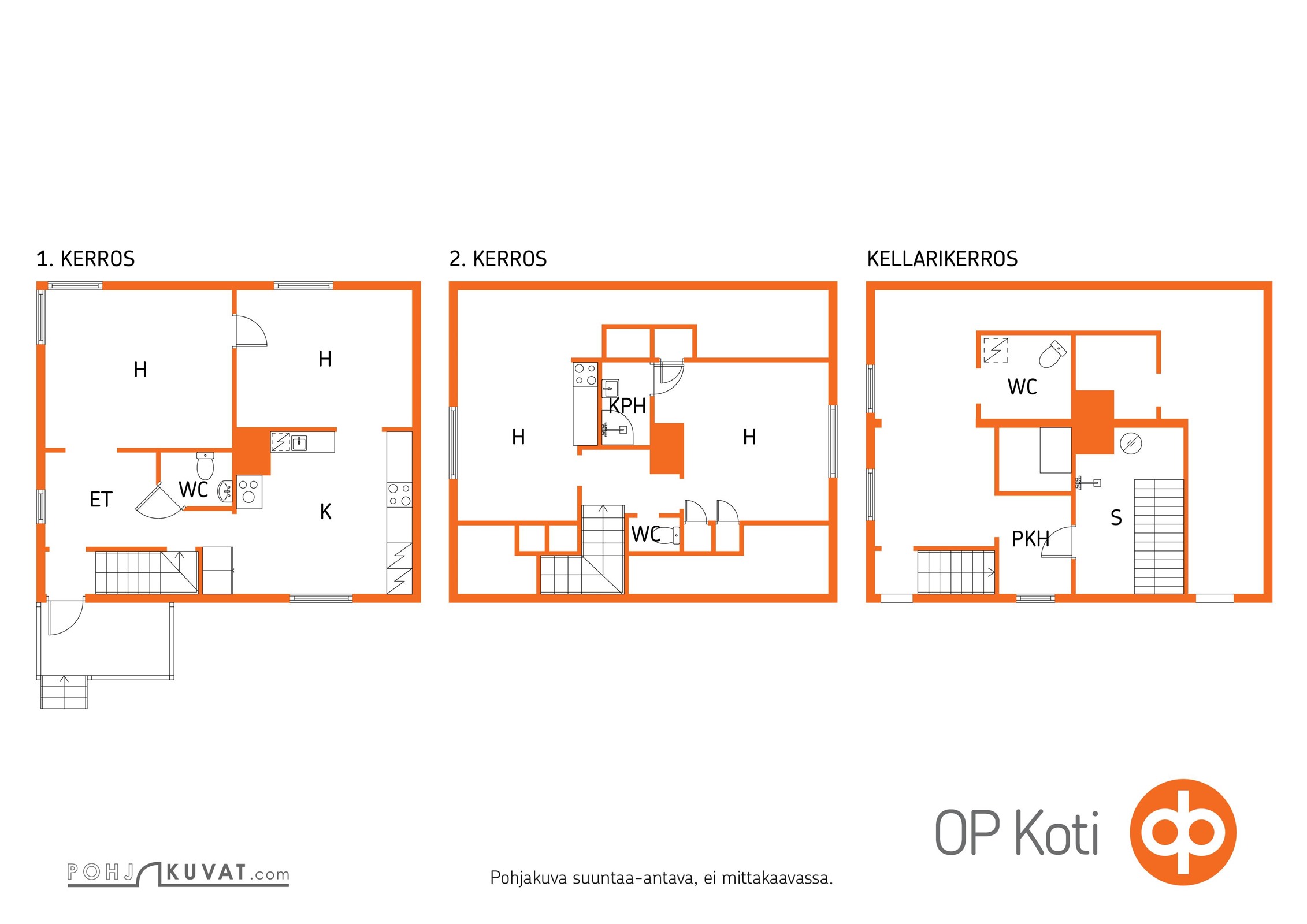 Sisääntulokerroksessa sinua odottavat valoisa olohuone, tilava keittiö, makuuhuone sekä erillinen wc. Yläkerrasta löydät kaksi makuuhuonetta, joista toisen yhteydessä on oma kylpyhuone, sekä erillisen wc:n. Kellarikerroksessa sijaitsevat kodin saunaosasto ja kodinhoitotila sekä kodin kolmas wc.
