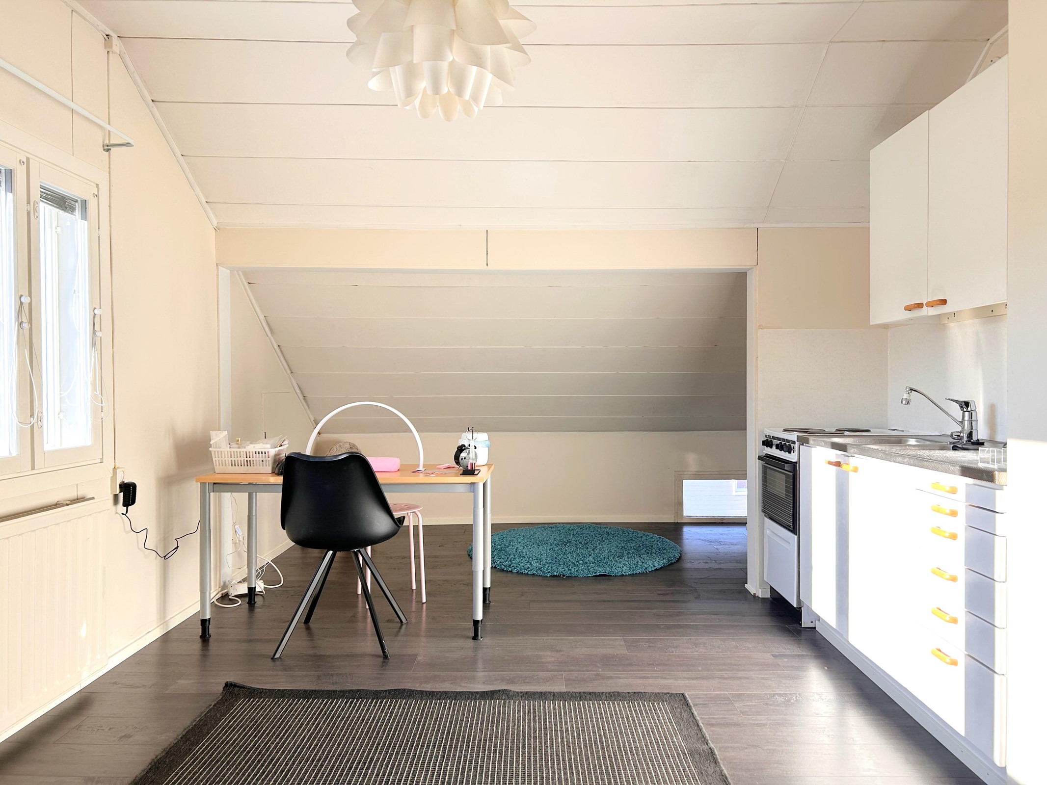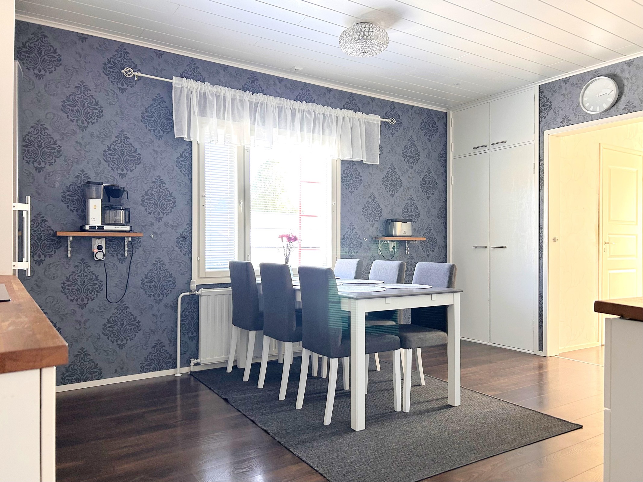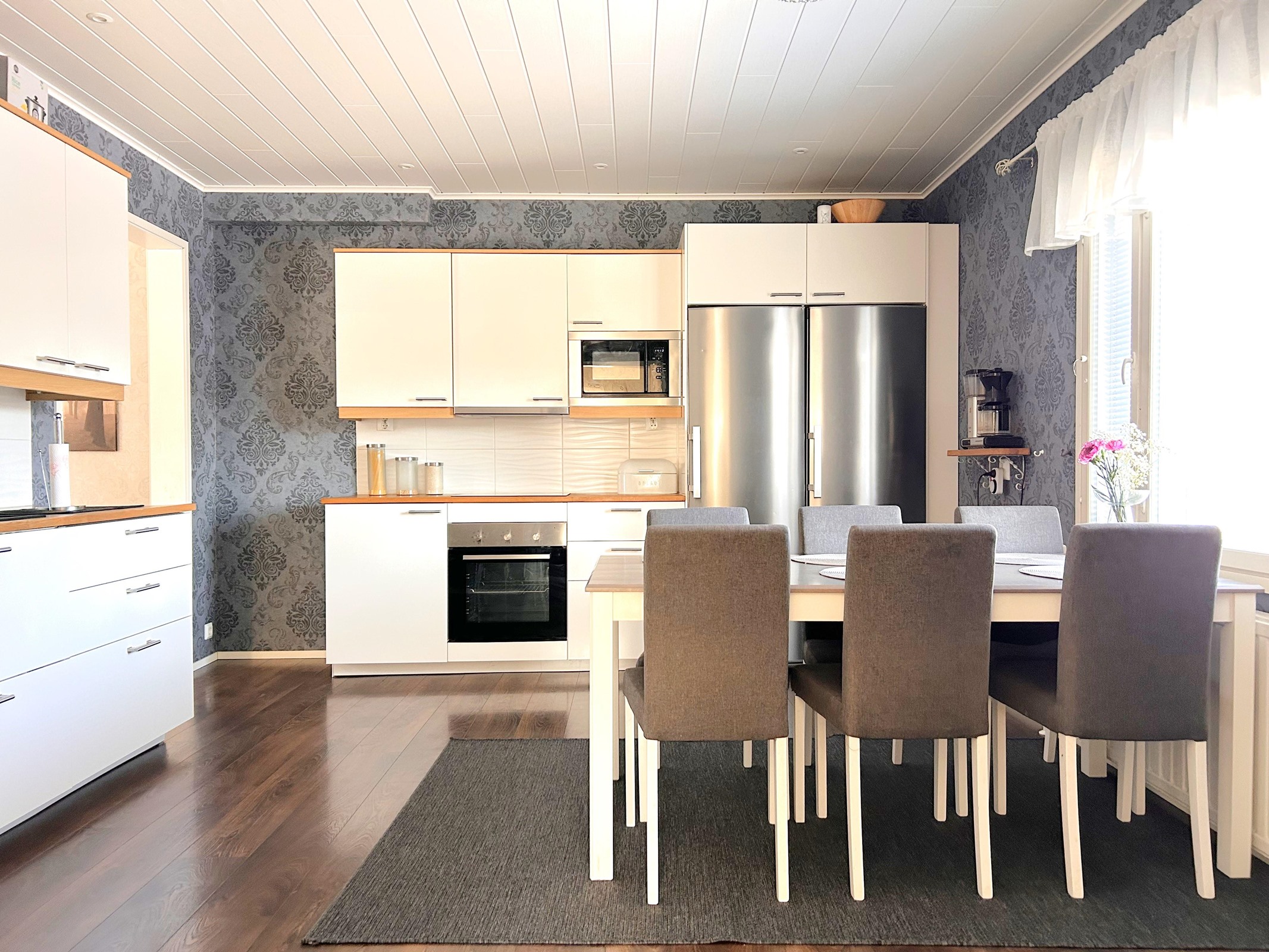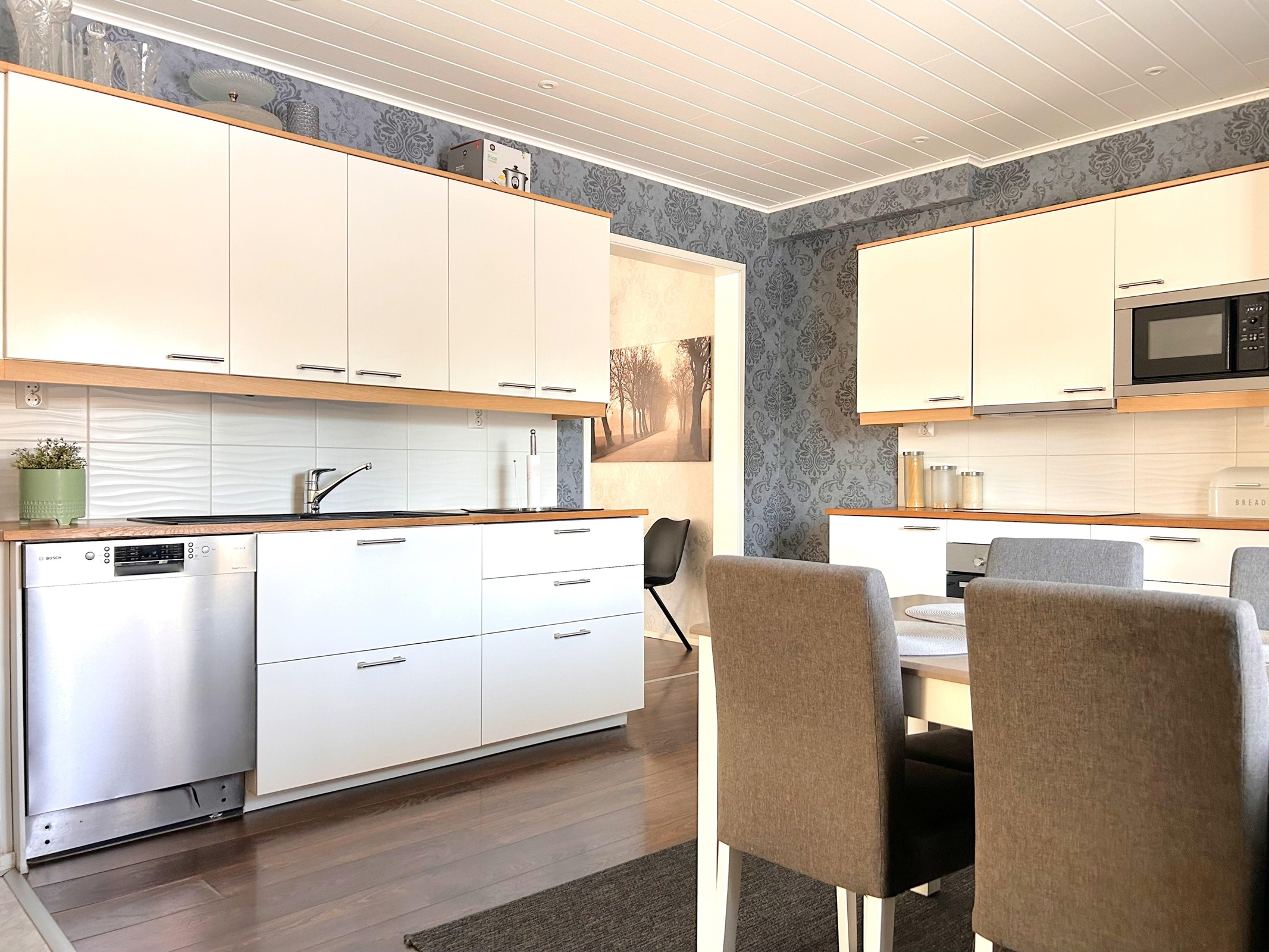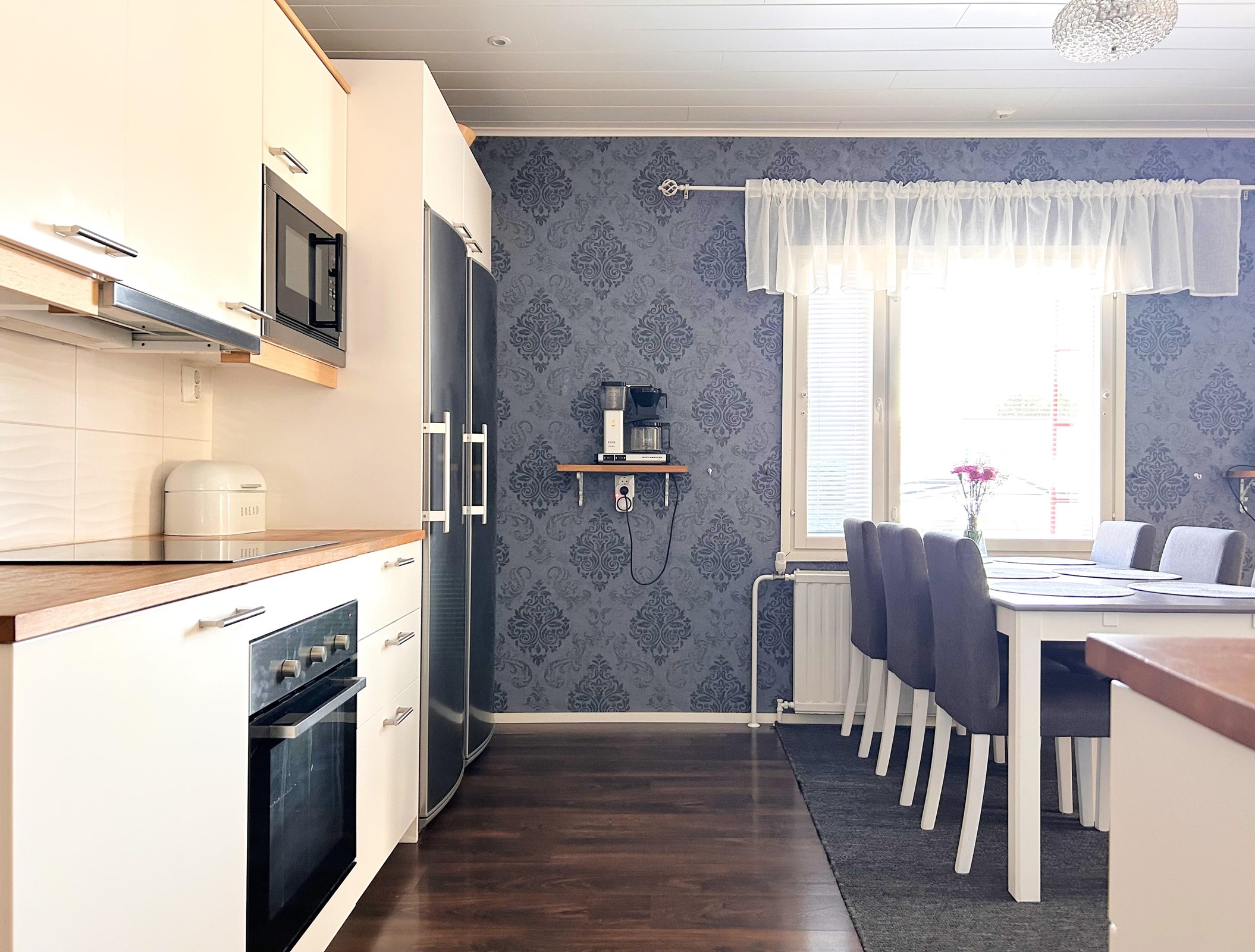 - Keittiö on uusittu vuonna 2017 ja tarjoaa runsaasti säilytys- ja työskentelytilaa. Keittiön varusteina jääkaappi, pakastekaappi, erillisuuni , liesitaso (induktio), liesituuletin, leivinuuni ja astianpesukone. Keittiössä puutasot.