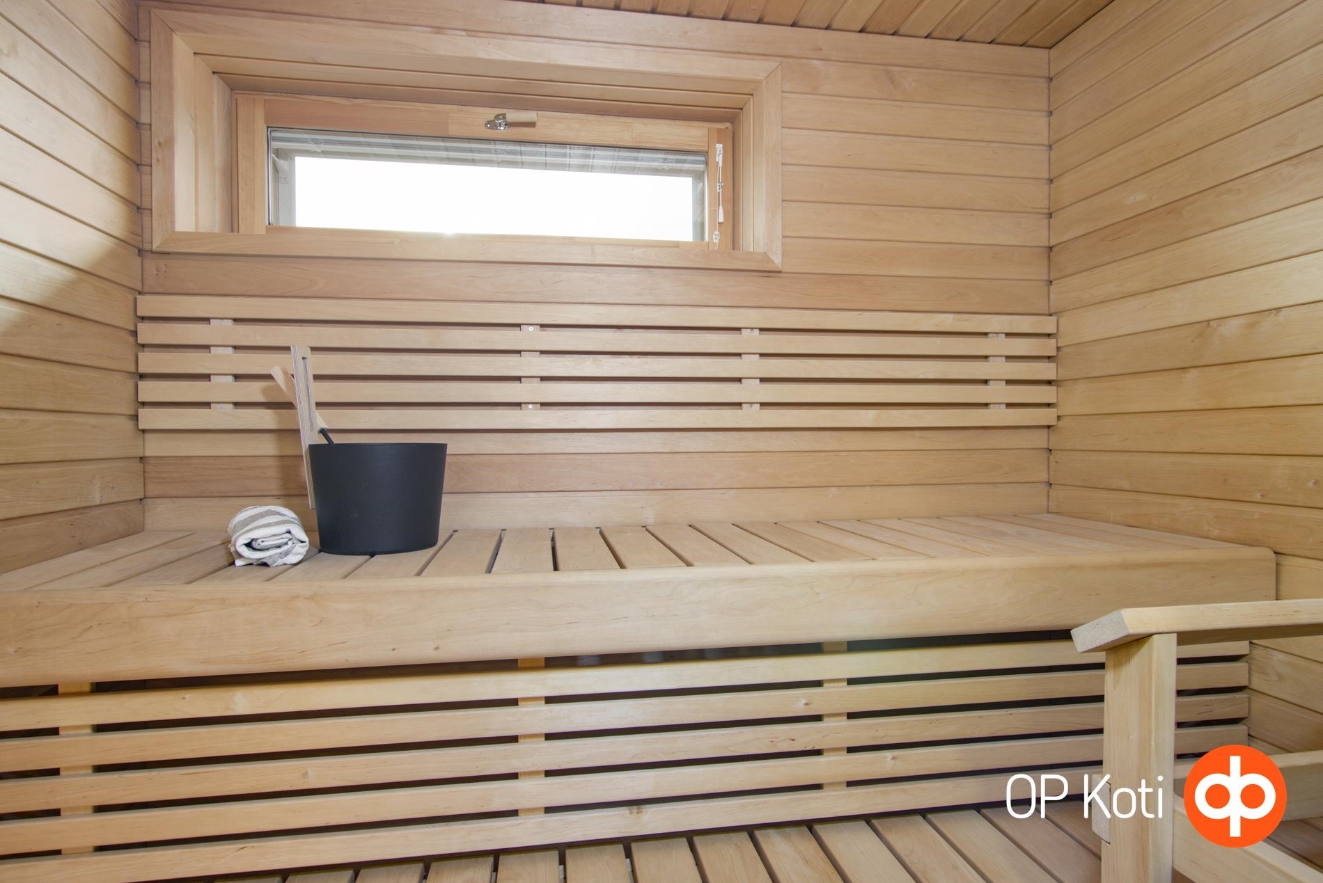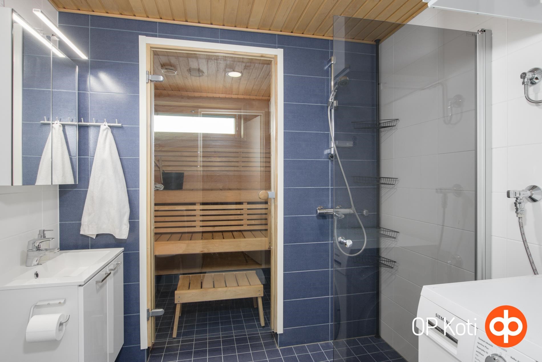 - Sauna, sähkökiuas, kylpyhuone, suihku, suihkuseinä, peilikaappi, allaskaappi, pesukoneliitäntä, lattialämmitys, kiinteät valaisimet.