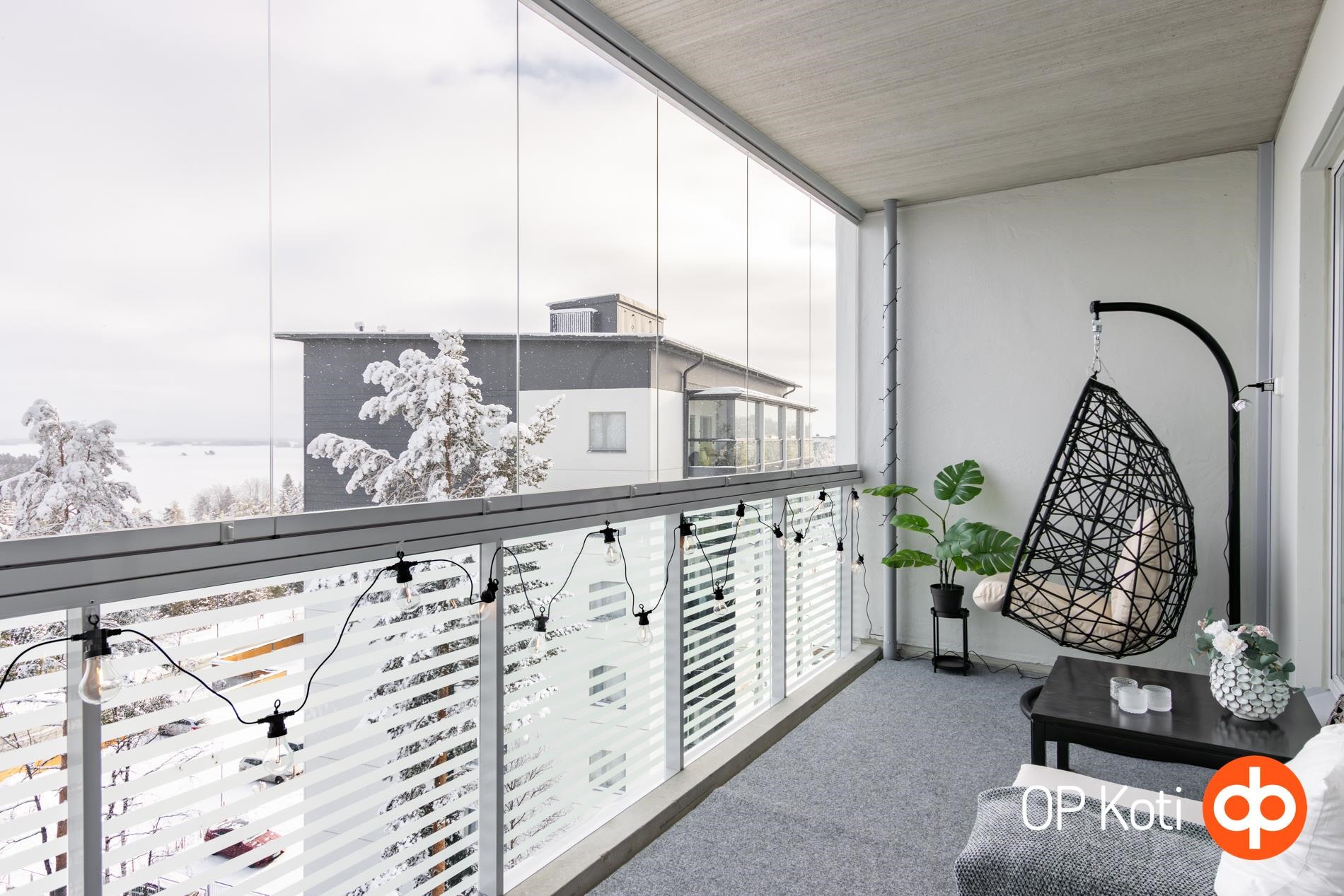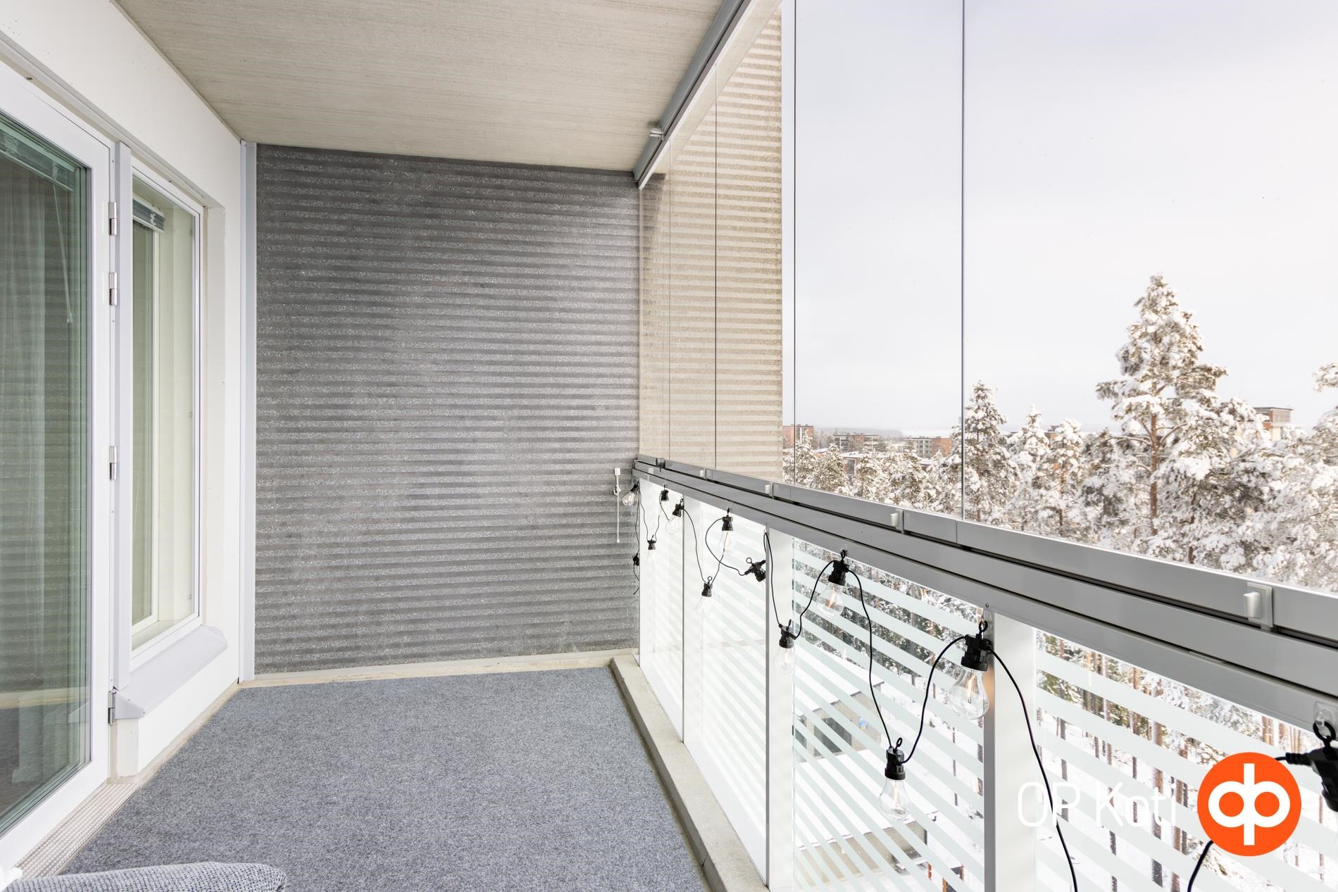 Tämä upea, ylimmän kerroksen huoneisto hurmaa ensisilmäyksellä. Ikkunoista avautuvat esteettömät näkymät kauas Kallaveden selälle, ja seitsemäs kerros takaa rauhalliset puitteet viihtyisään asumiseen vuoden jokaisena päivänä. Kodin harkittu materiaalien valinta ja harmoniset sävyt luovat tyylikkään ja seesteisen kokonaisuuden. Keittiö ja olohuone muodostavat avaran, yhtenäisen tilan. Olohuoneen jatkeena avautuu kookas lasitettu parveke, joka toimii eriomaisesti kutsuvana oleskelutilana varhaisesta keväästä vielä pitkälle syksyyn. Kylpyhuone- ja saunatilat on viimeistelty laadukkailla laatoilla ja materiaaleilla, jotka nostavat arjen mukavuudet uudelle tasolle. Huoneiston yhteydessä on lunastettavissa oma autopaikka erillisellä osakesarjalla. Paikka on varustettu lämmitystolpalla.