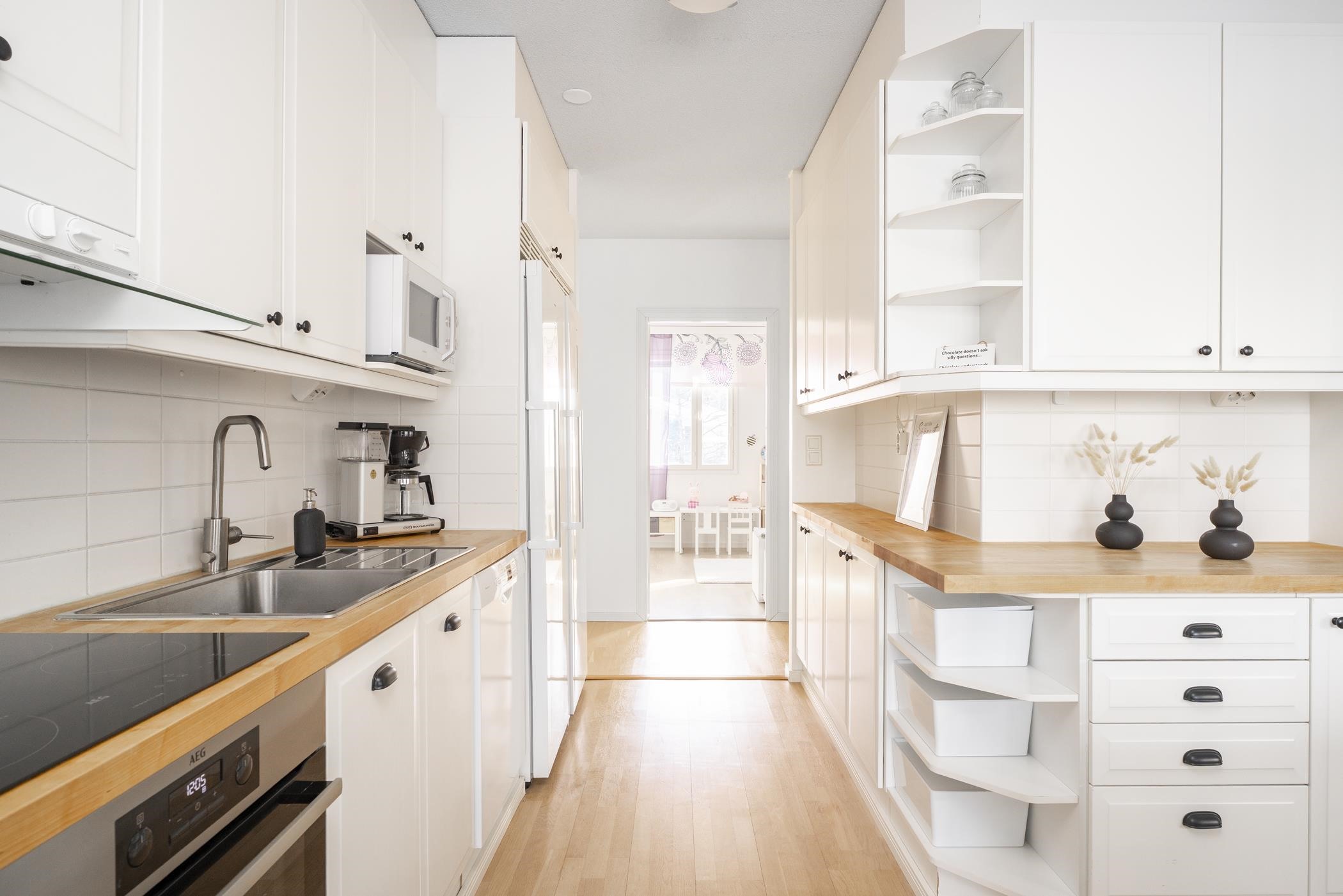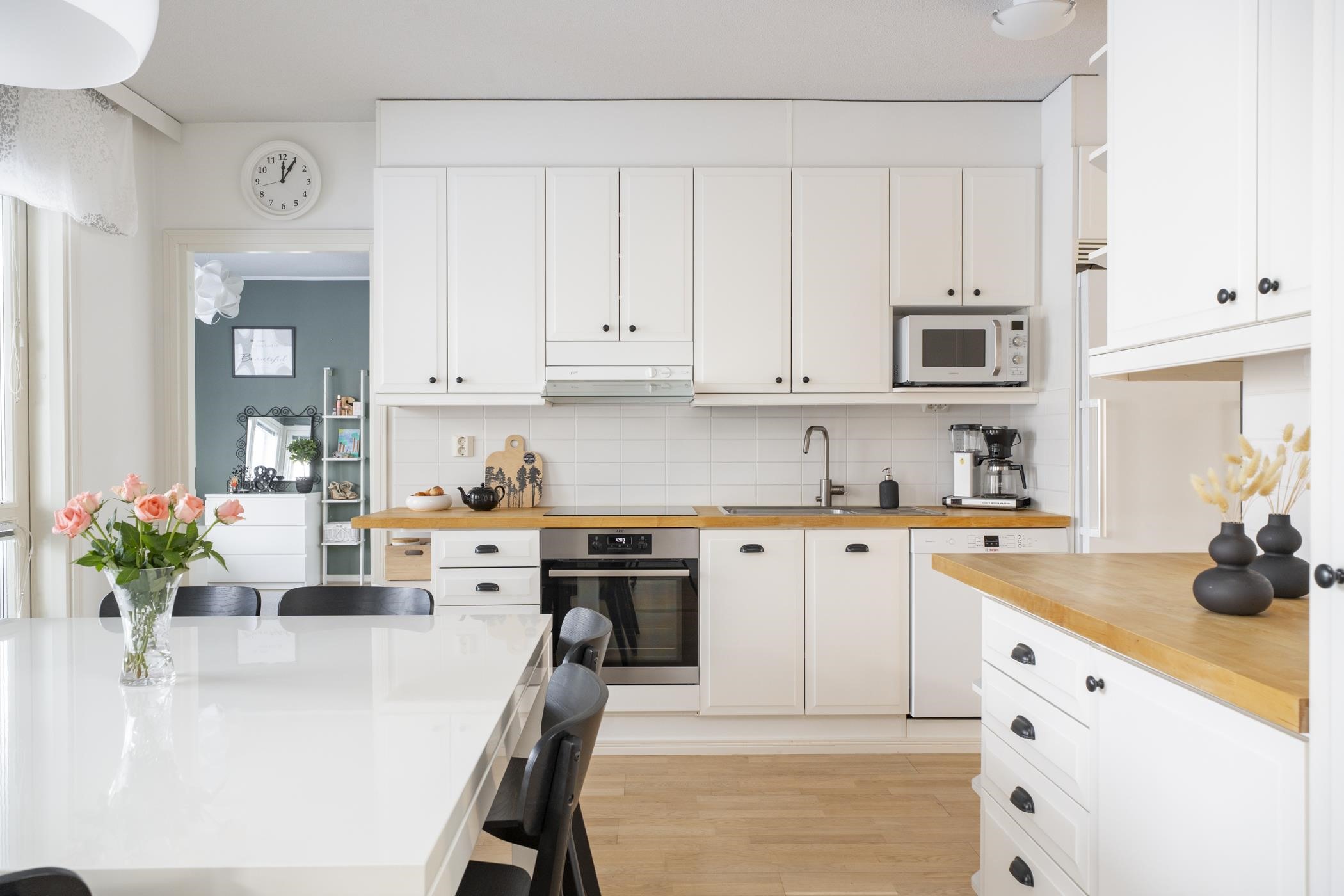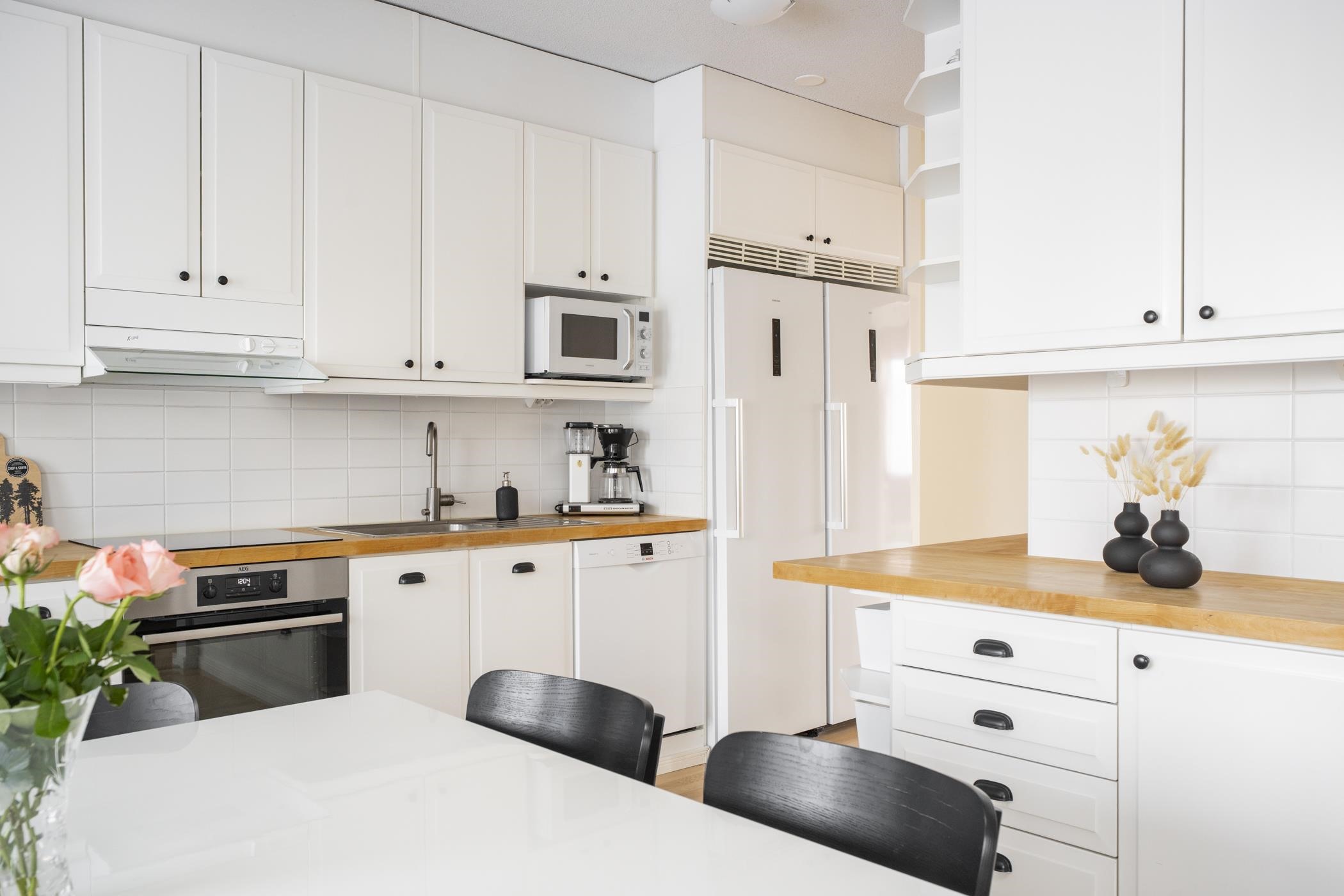 - Jääkaappi v. 2025, pakastekaappi v. 2025, kiertoilmaerillisuuni, induktioliesitaso, liesituuletin hormiin, astianpesukone, kaapistot, kiinteät valaisimet, puutyötasot.