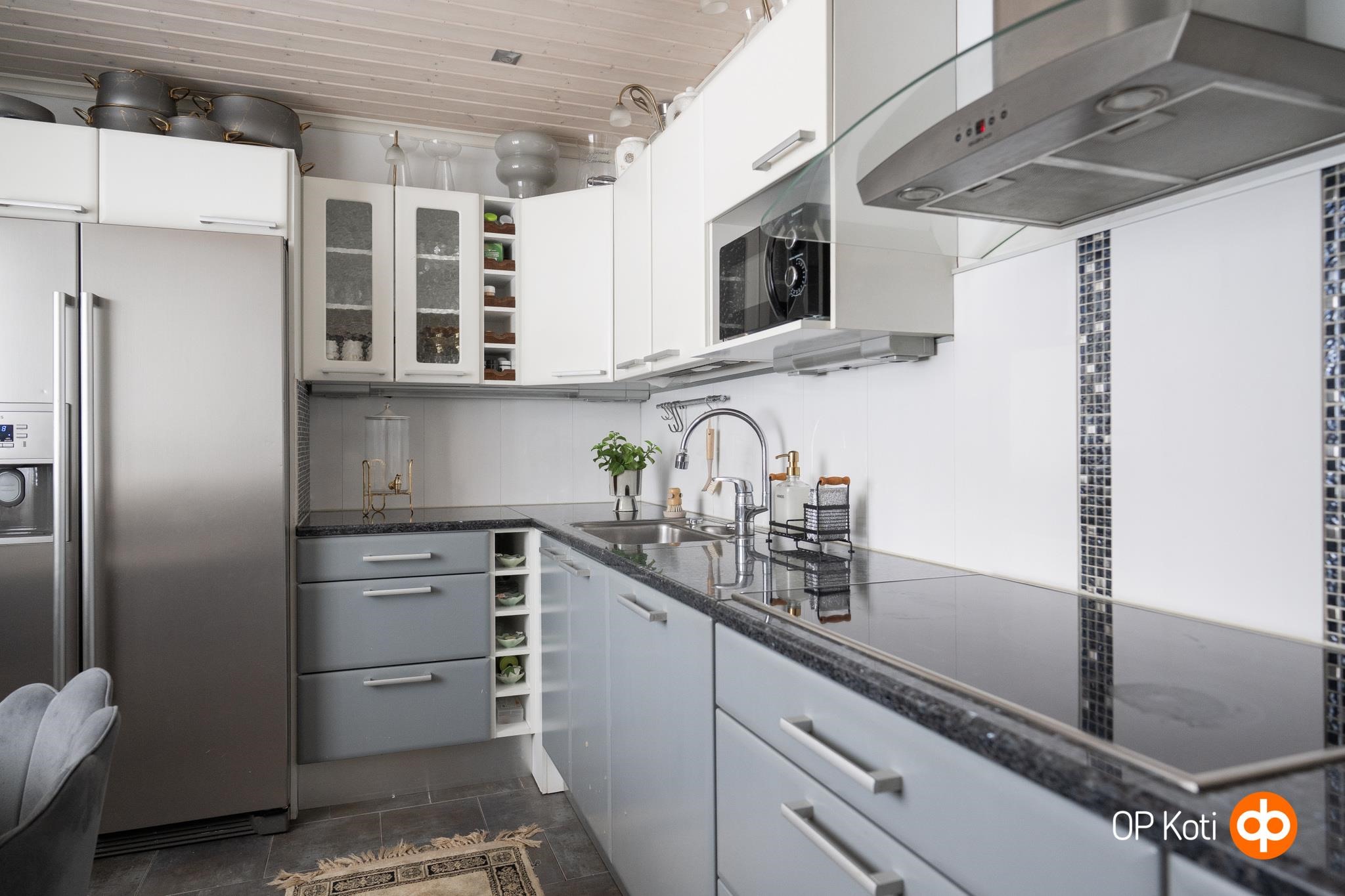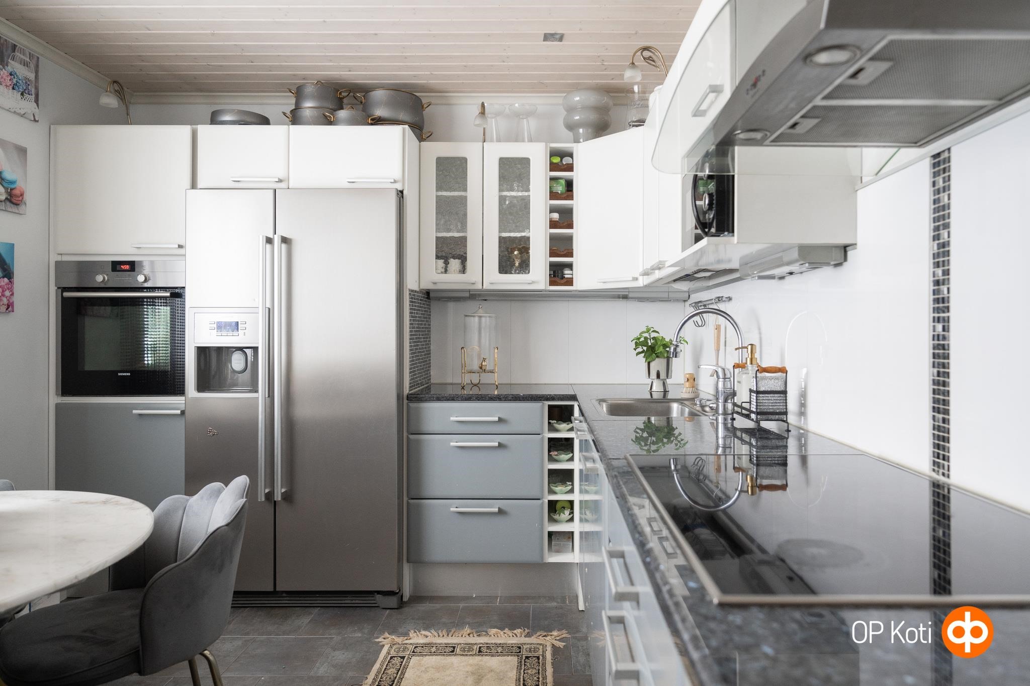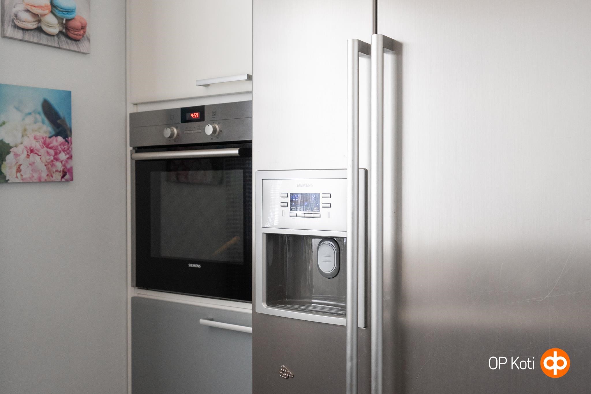 - Jääviileäkaappi side by side, pakastekaappi side by side, jääpalakone ovessa, erillisuuni, liesitaso, induktioliesi, liesituuletin, astianpesukone, kaapistot, kiinteät valaisimet.
