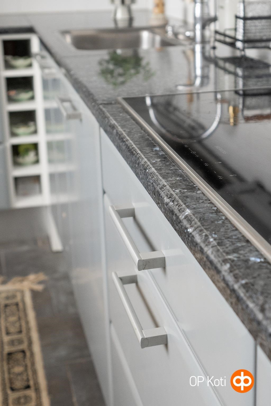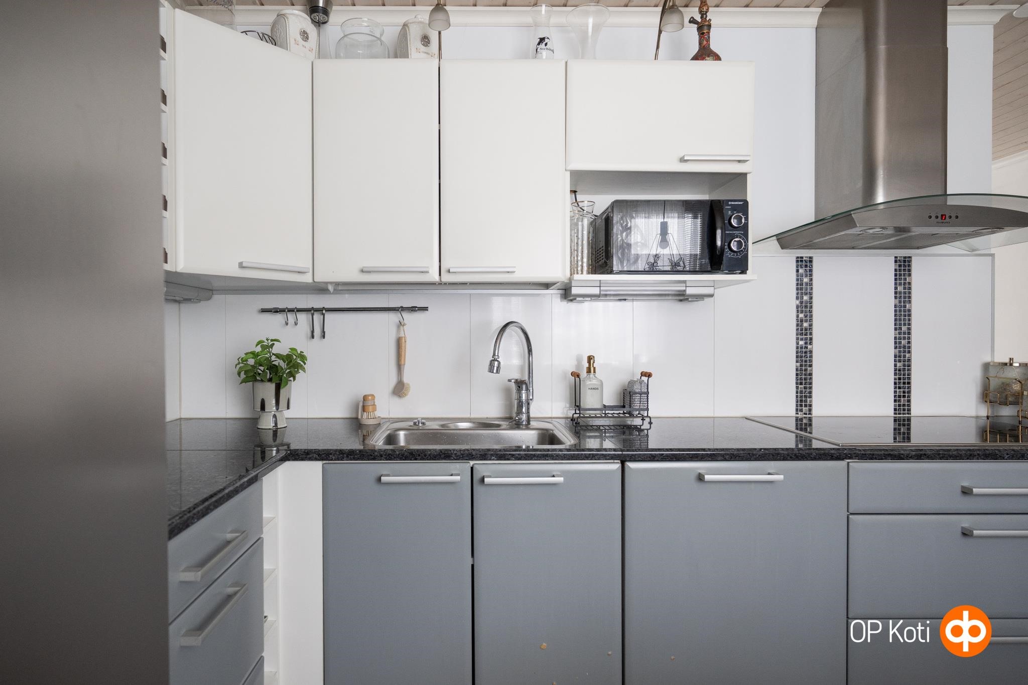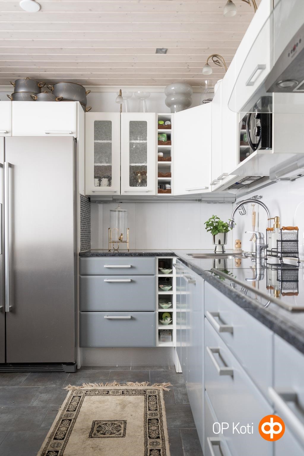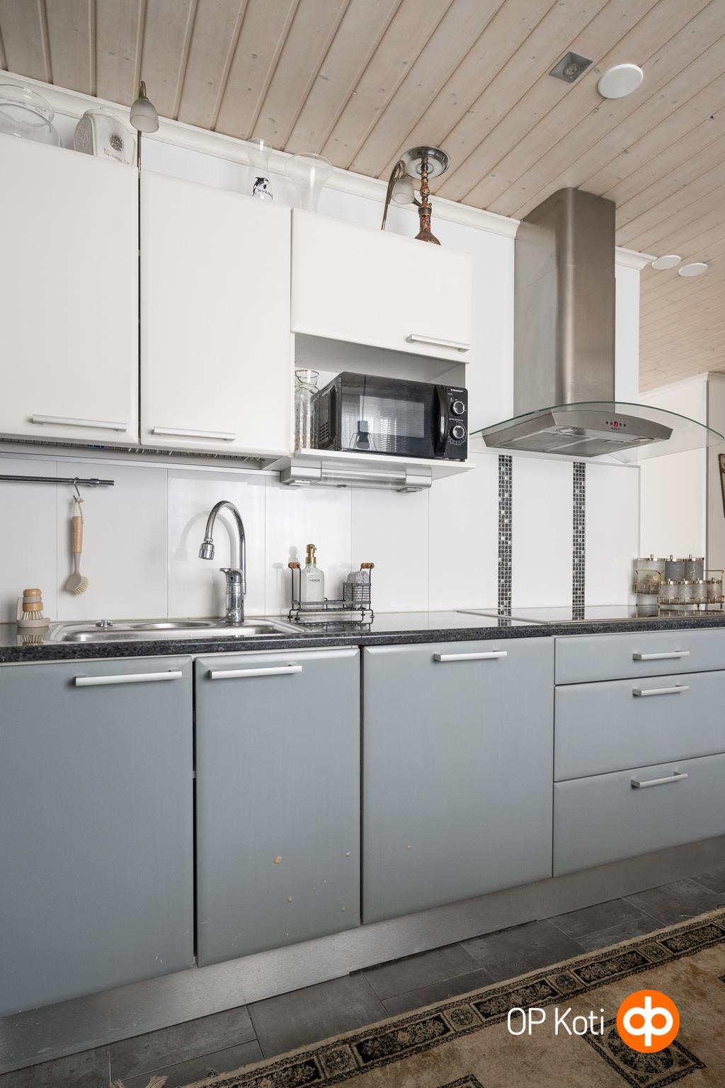- Jääviileäkaappi side by side, pakastekaappi side by side, jääpalakone ovessa, erillisuuni, liesitaso, induktioliesi, liesituuletin, astianpesukone, kaapistot, kiinteät valaisimet.