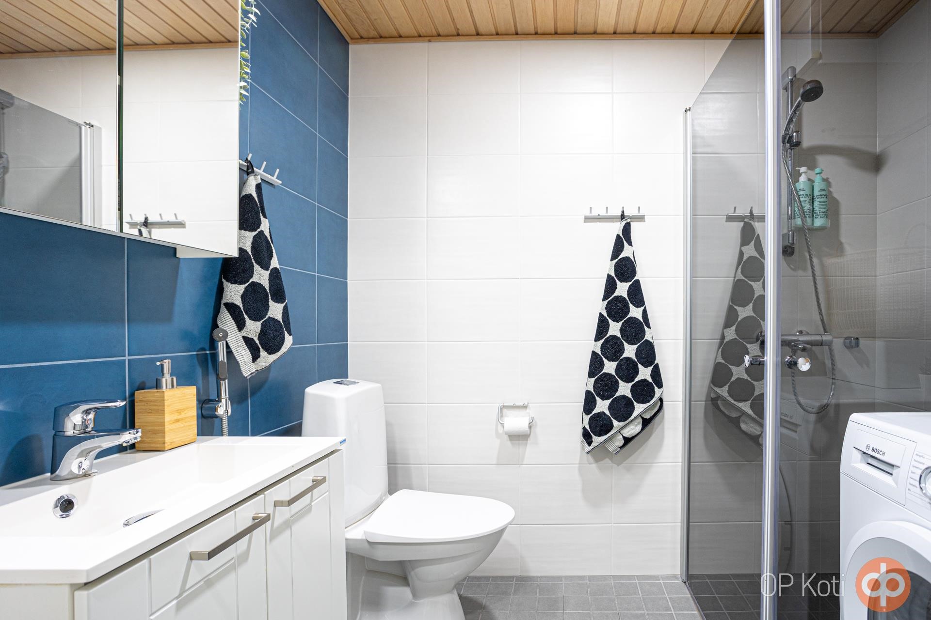 - Kylpyhuone, suihku, suihkuseinä, peilikaappi, allaskaappi, pesukoneliitäntä, lattialämmitys, kiinteät valaisimet.