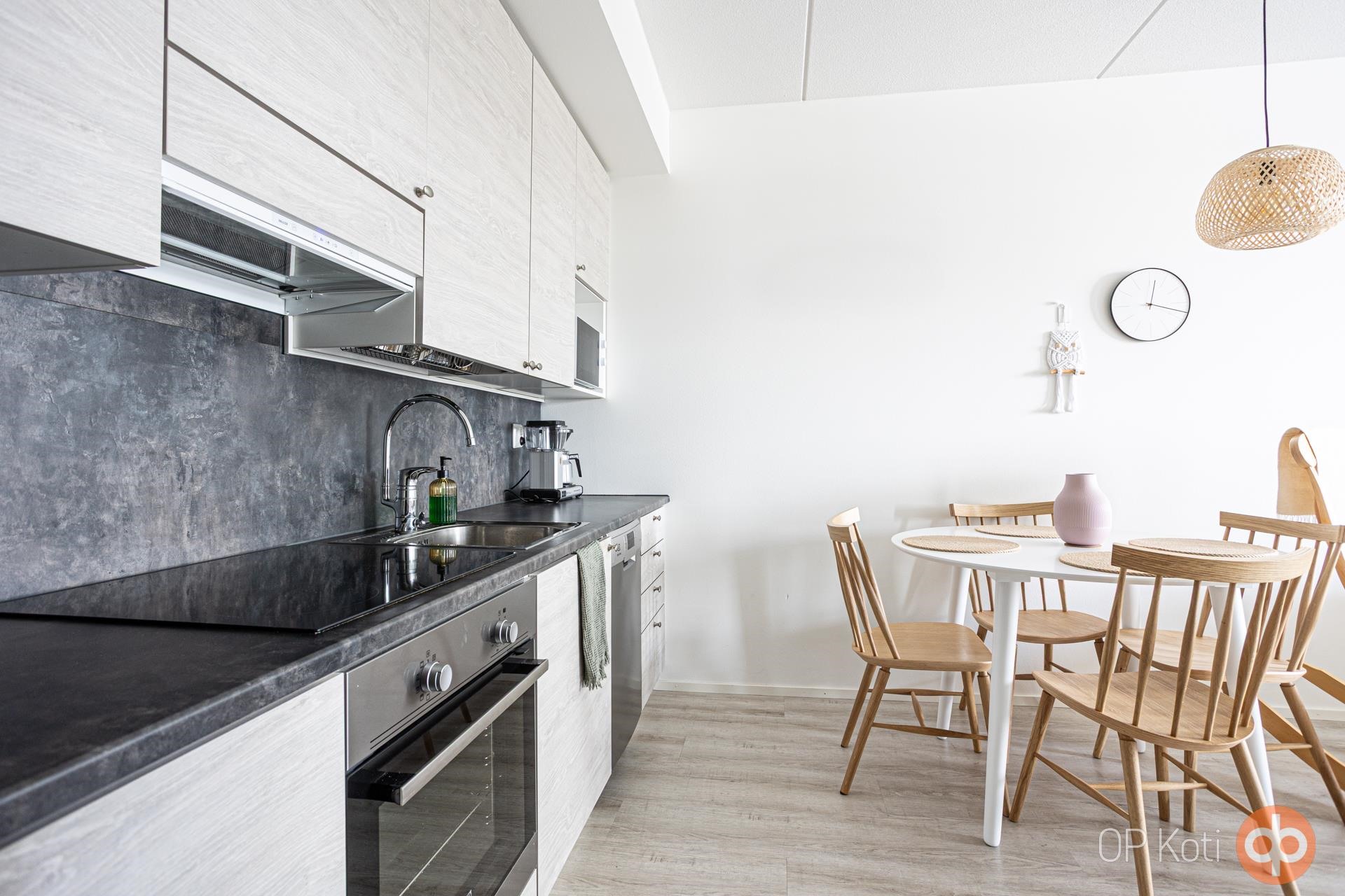 - Jääkaappipakastin, erillisuuni, induktioliesi, liesituuletin, astianpesukone, kaapistot, kiinteät valaisimet.