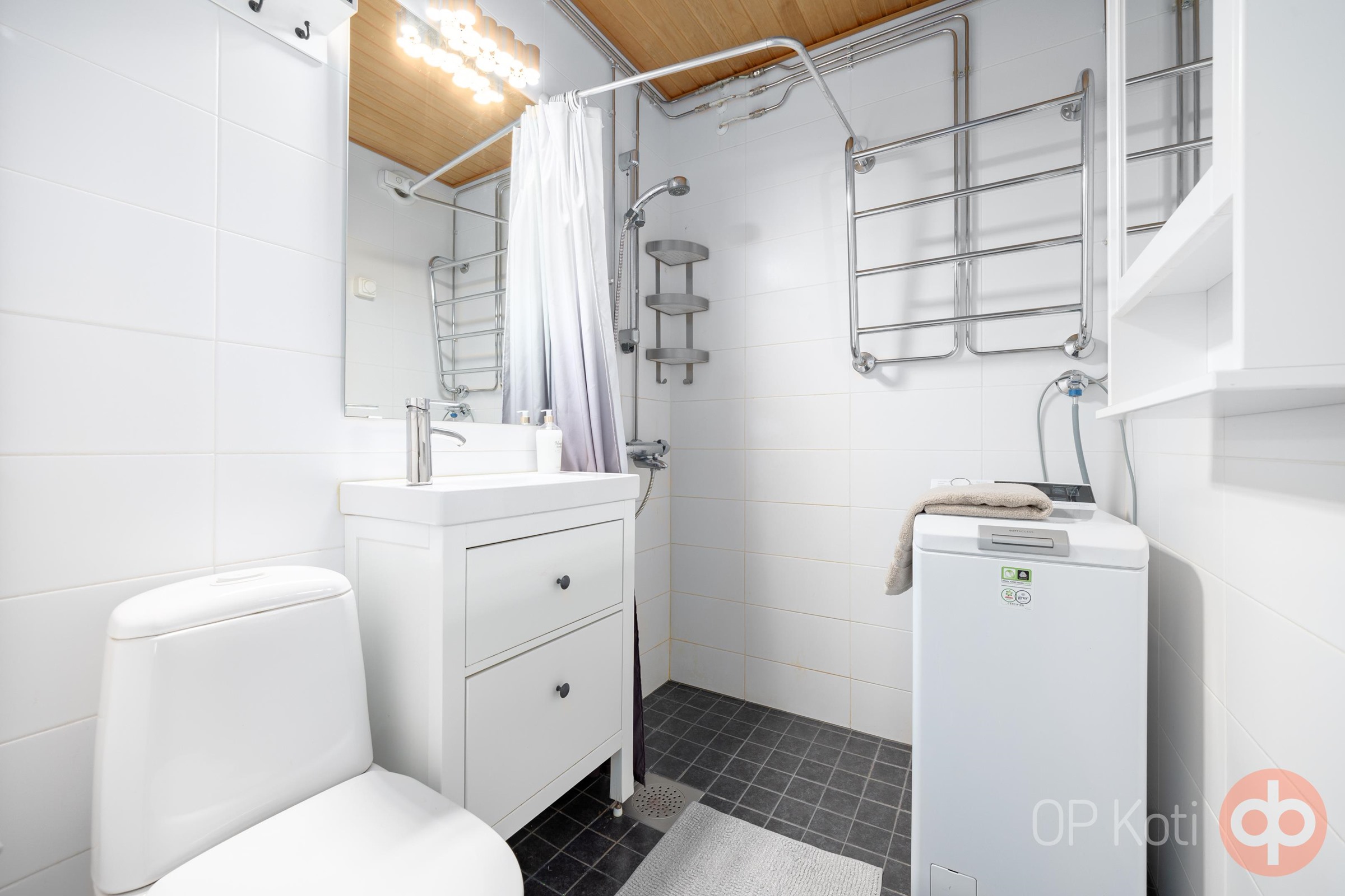 - Kylpyhuone, suihku, peilit, peilikaappi, allaskaappi, pesukoneliitäntä, kiinteät valaisimet. rättipatteri
