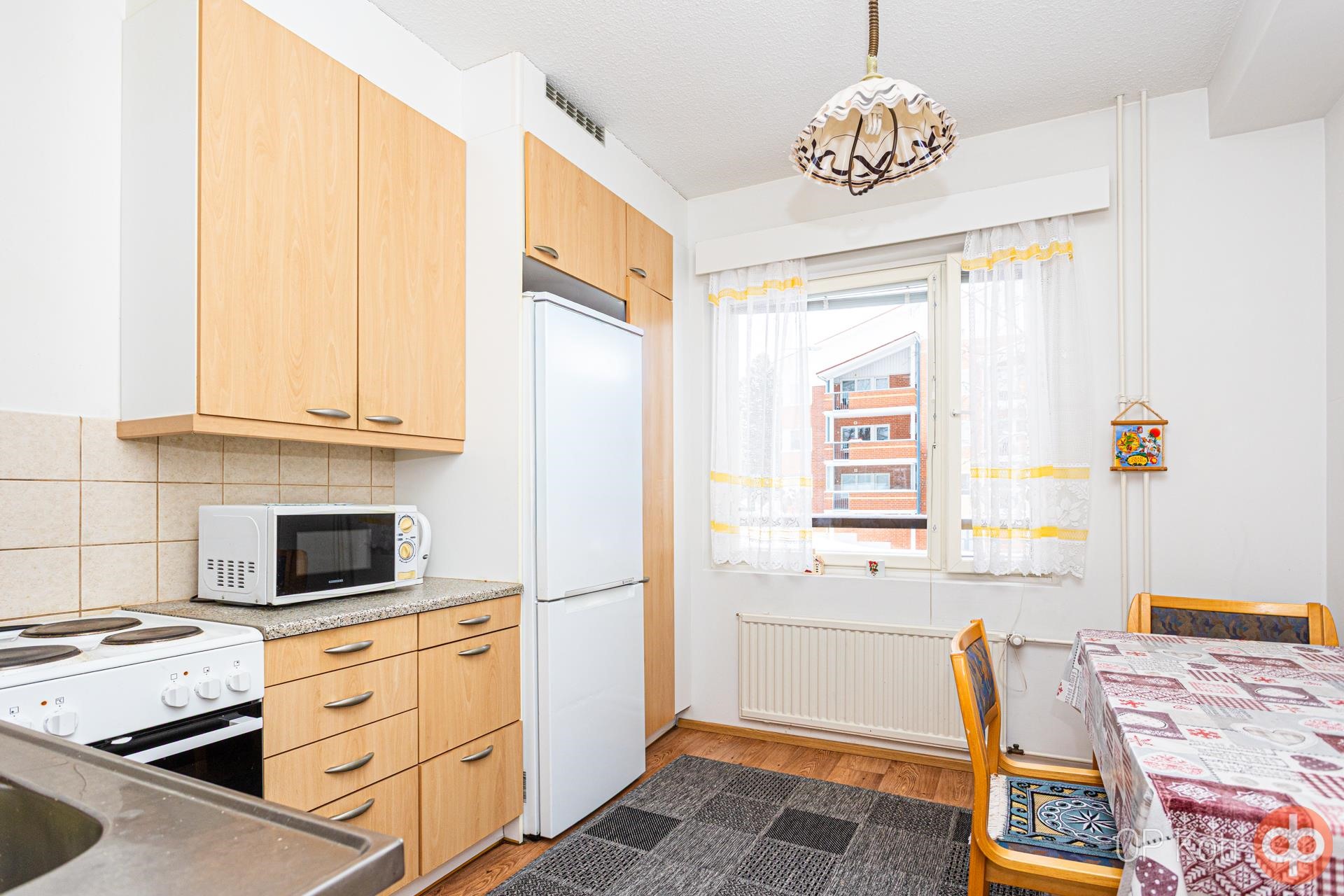 - Jääkaappipakastin, sähköliesi, liesituuletin, kaapistot, kiinteät valaisimet.