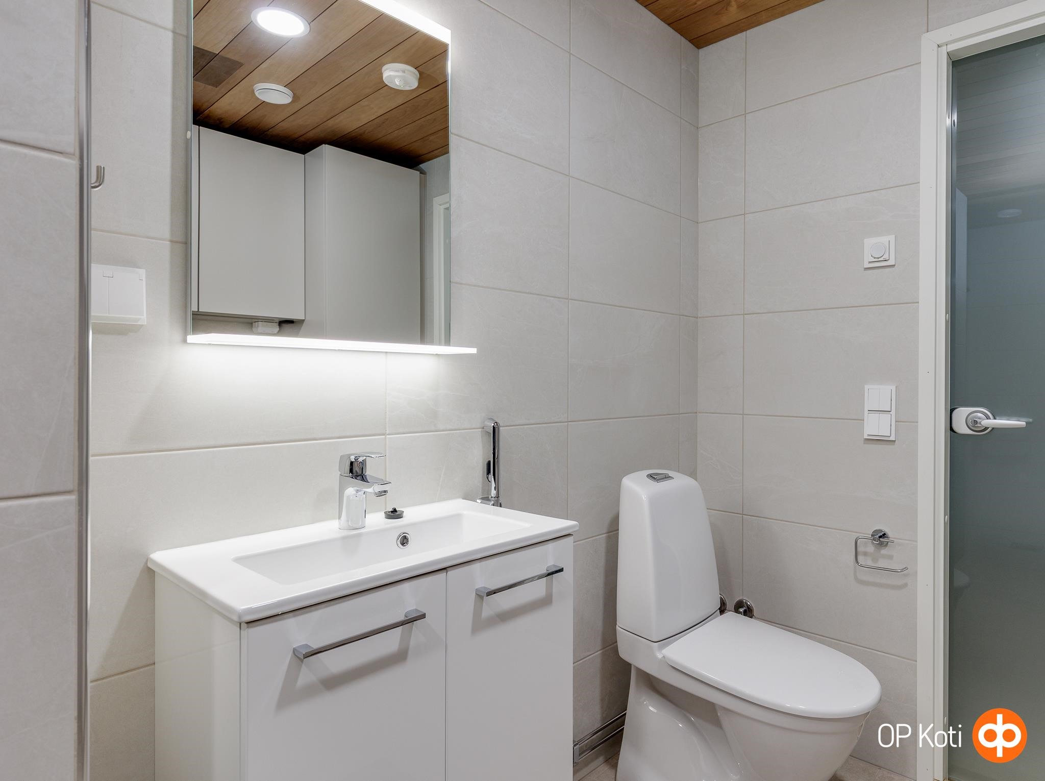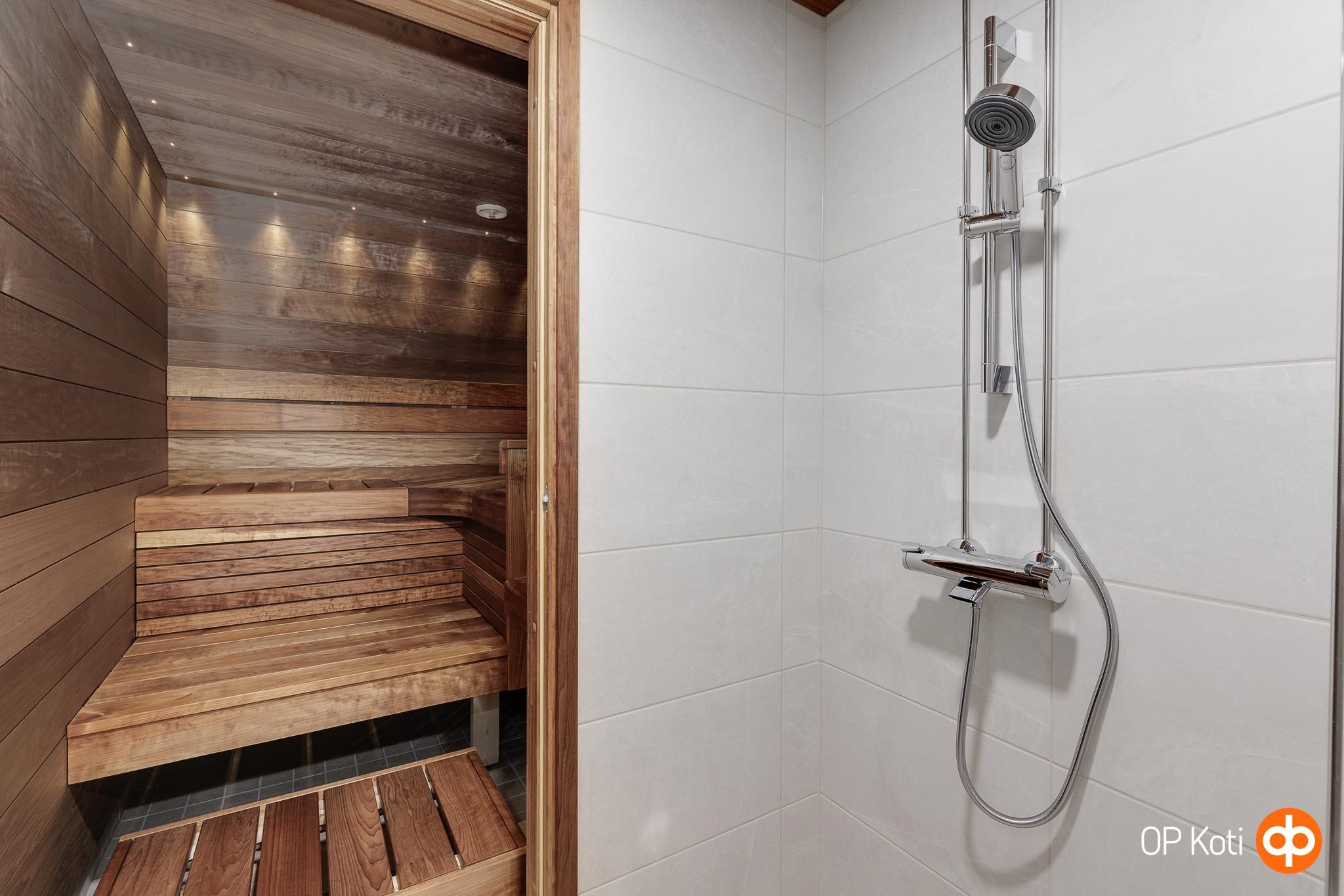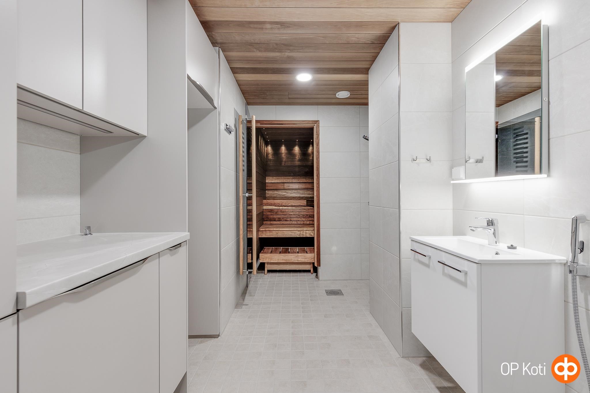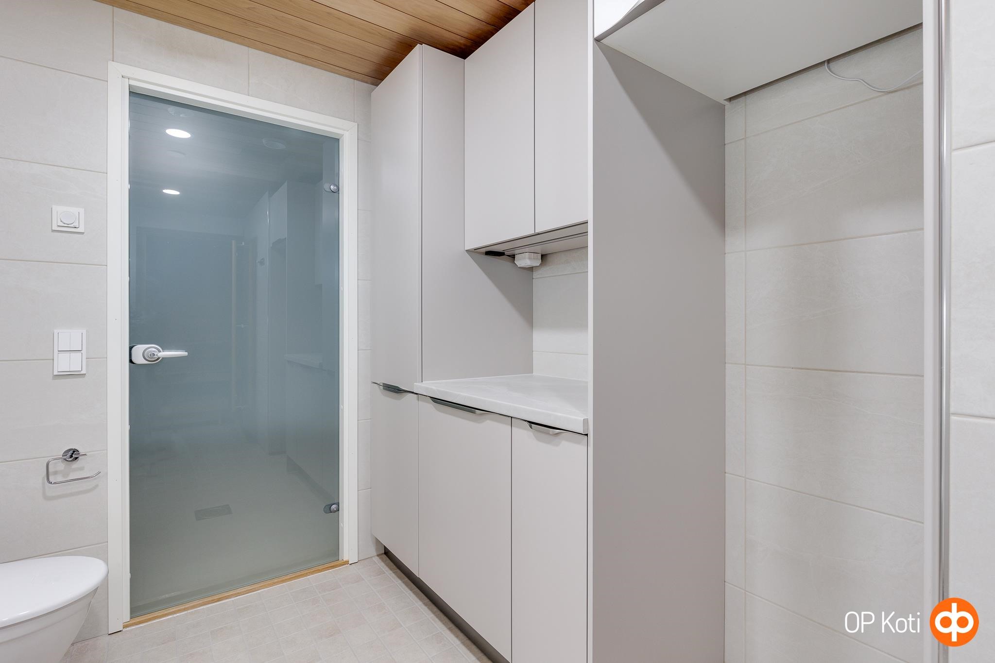 - Sauna, sähkökiuas, kylpyhuone, erillinen wc, suihkukaappi, peilikaappi, allaskaappi, pesukoneliitäntä, lattialämmitys (kylpyhuoneessa), kiinteät valaisimet.