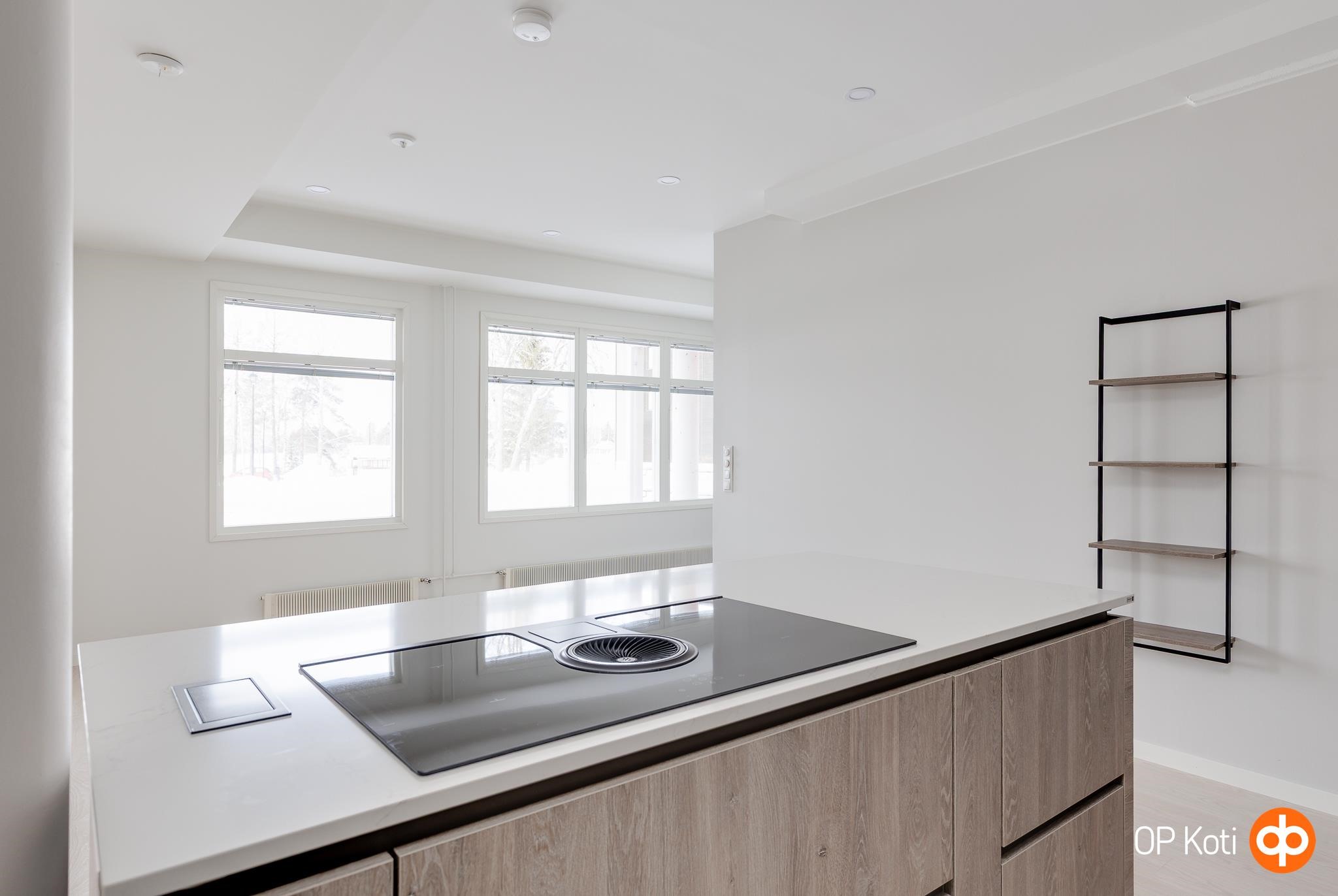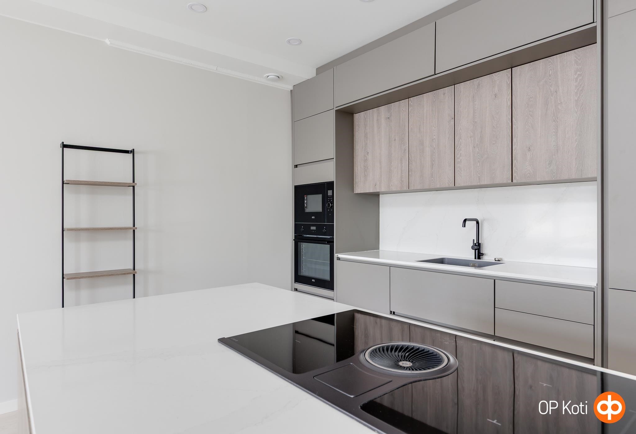 - Jääkaappipakastin, erillisuuni, liesitaso (induktio), liesituuletin, mikroaaltouuni, astianpesukone, kaapistot, kiinteät valaisimet.