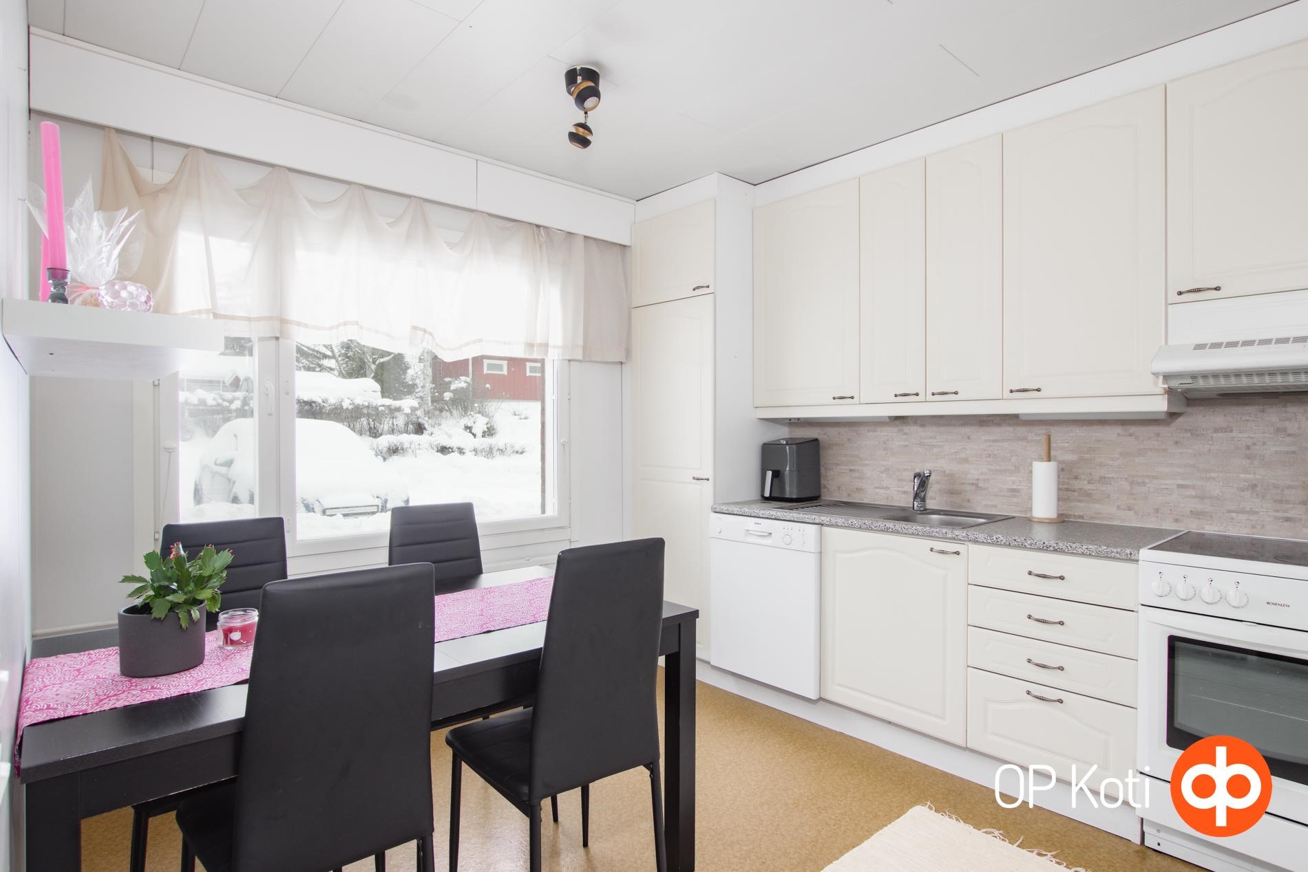 - Jääkaappipakastin, keraaminen liesi, liesituuletin, astianpesukone, kaapistot, kiinteät valaisimet.