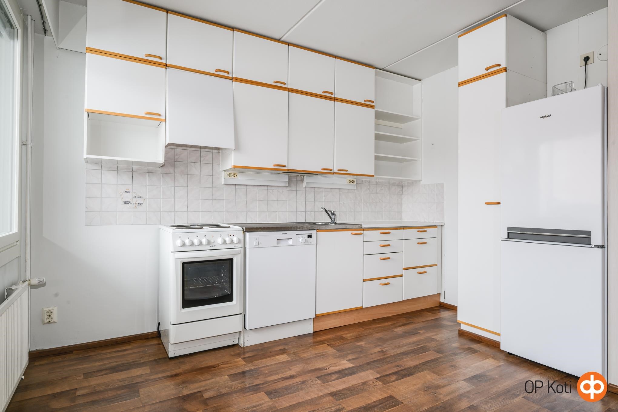 - Jääkaappipakastin, lattialiesi, kaapistot.