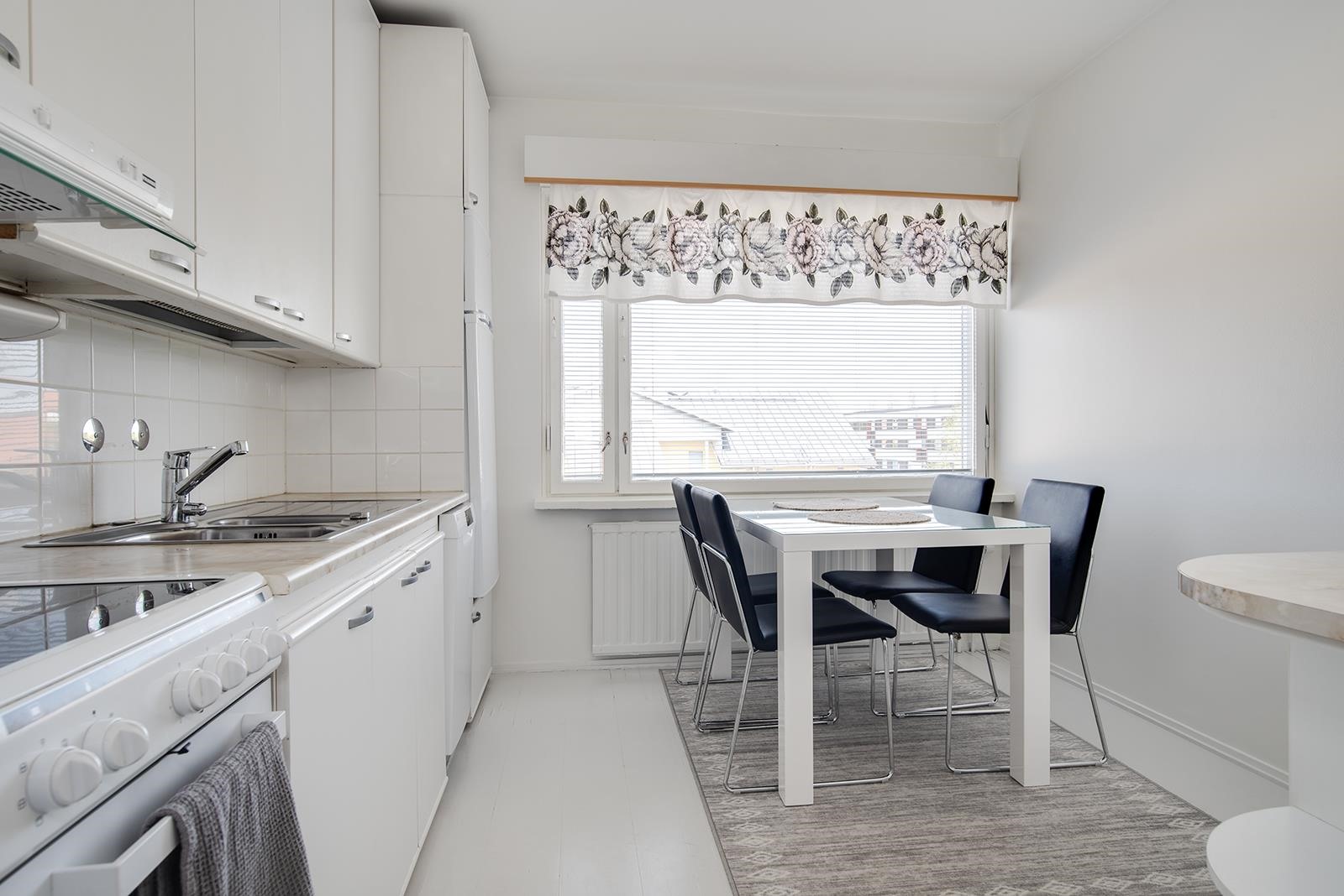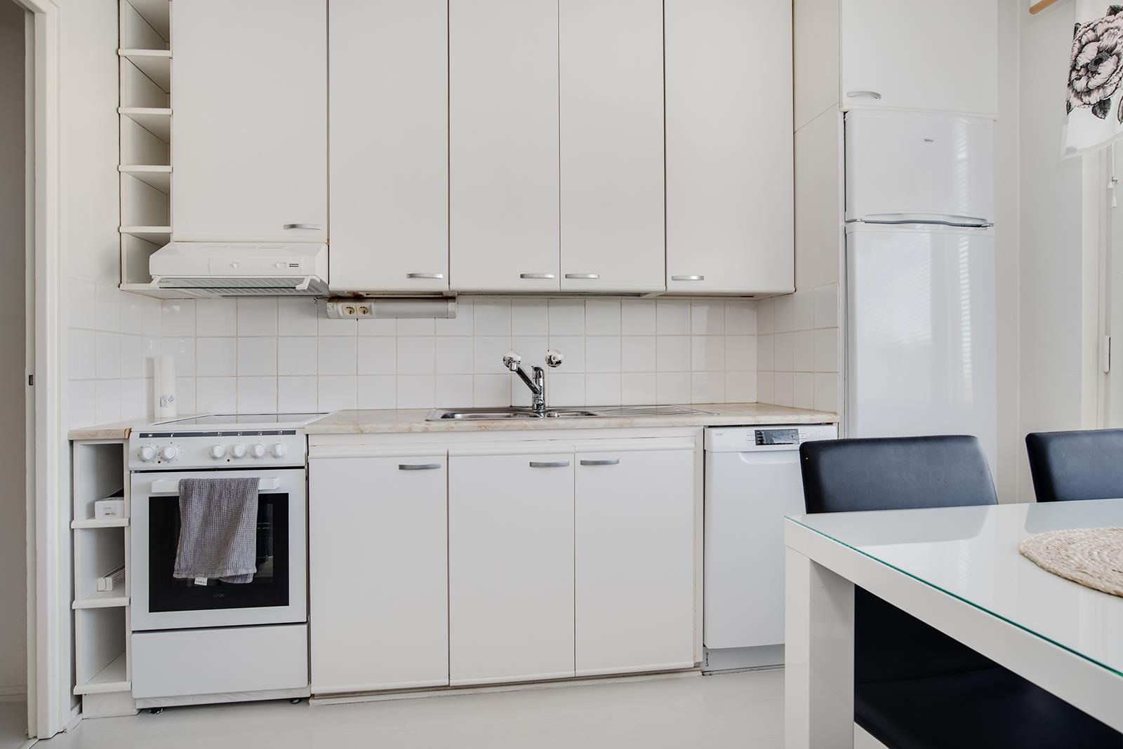 - Jääkaappipakastin, keraaminen liesi, astianpesukone, kaapistot, kiinteät valaisimet.