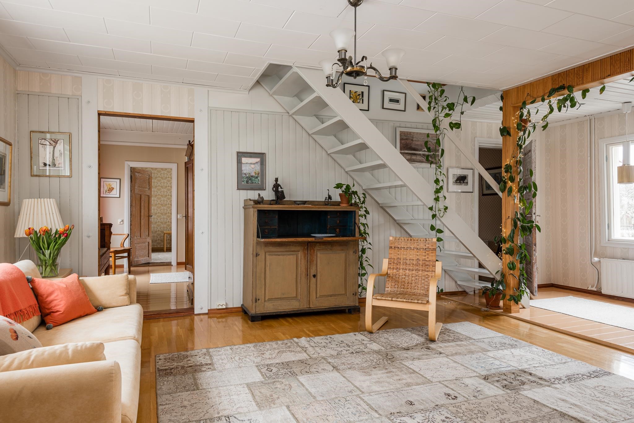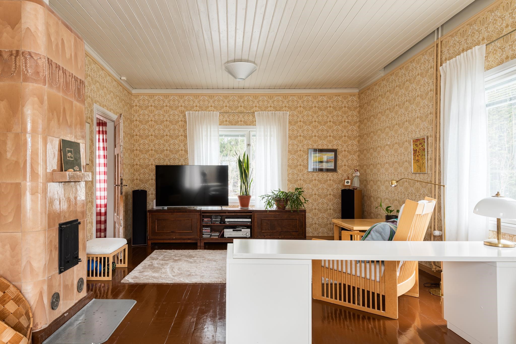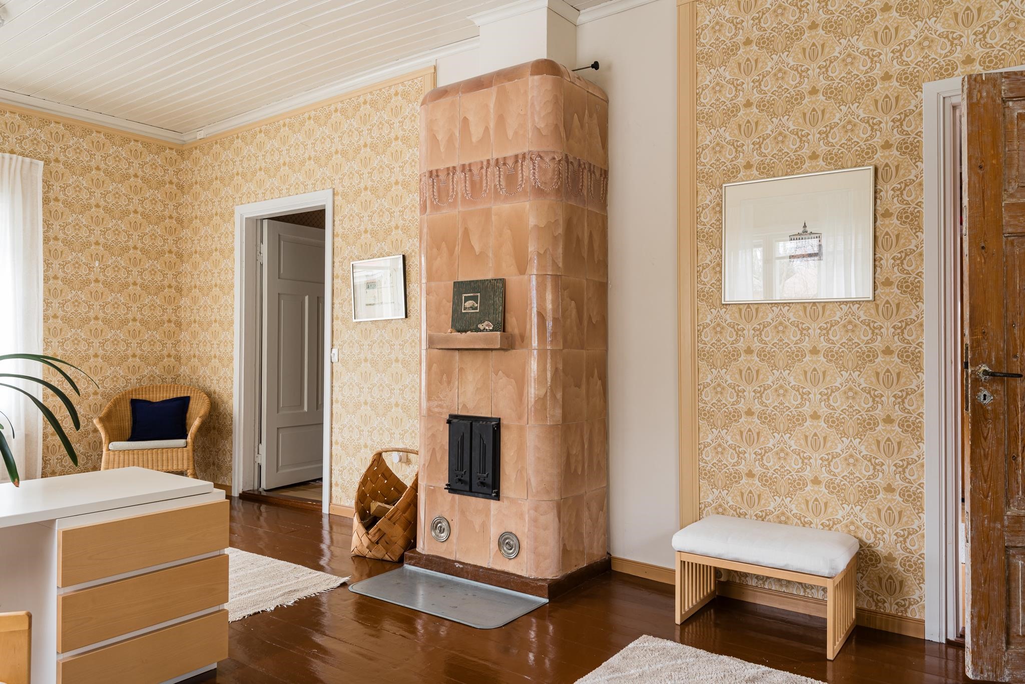 Keittiö: Maalattu lautalattia, tapetti, kaakeli. Olohuone: Parketti, tapetti. Makuuhuone 1: Muovimatto, tapetti. Makuuhuone 2: Muovimatto, tapetti. Kodinhoitohuone: Kodinhoitotila/apukeittiö: Maalattu lautalattia, tapetti. Sauna: Laatta, laatta, lautapaneeli, lattialämmitys.. Kylpyhuone: Laatta, lattialämmitys. Eteinen: Maalattu lautalattia, tapetti. Wc: Muovimatto, tapetti (yläkerta). Olohuone 2.: Alkuperäinen lautalattia, maalattu, tapetti. Yläkerran aula: Korkkilattia, tapetti. Wc: Maalattu puulattia, hirsi, kaakeli, tapetti (alakerta). Ruokailutila: Maalattu lautalattia, tapetti..