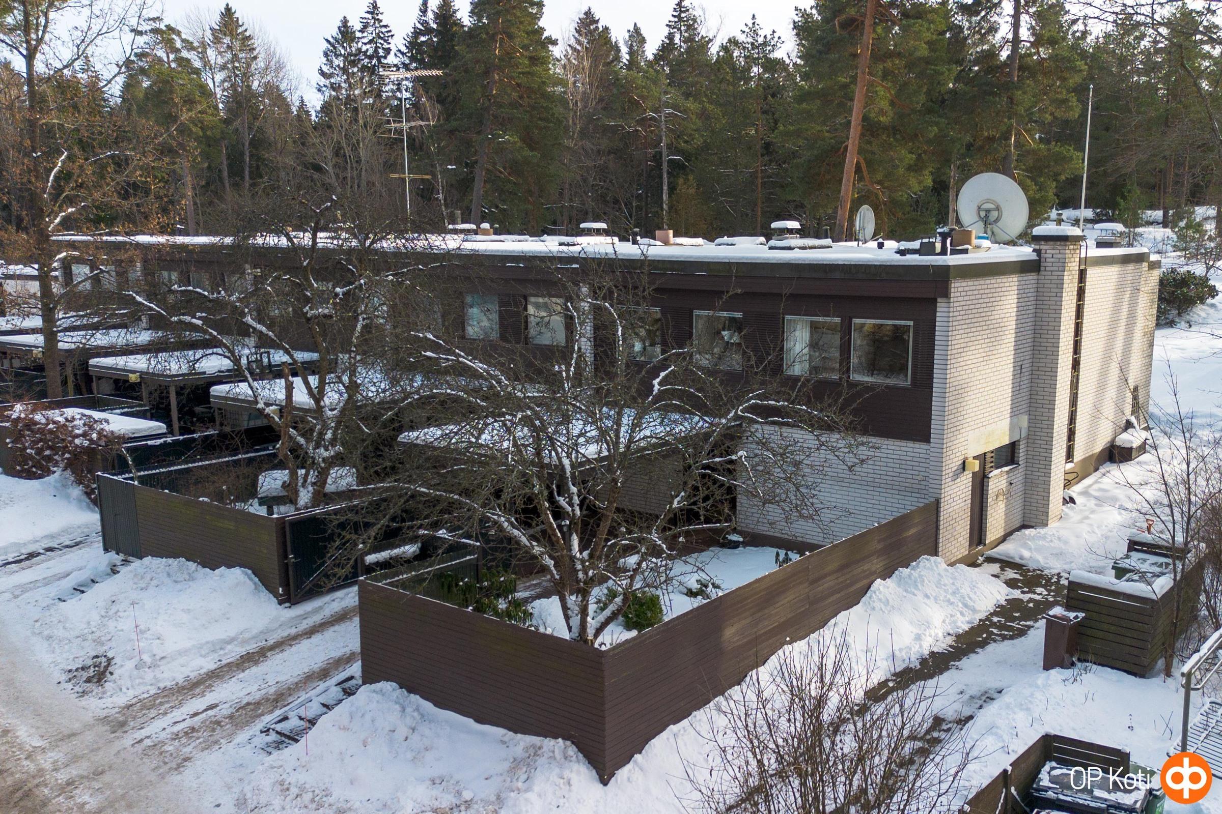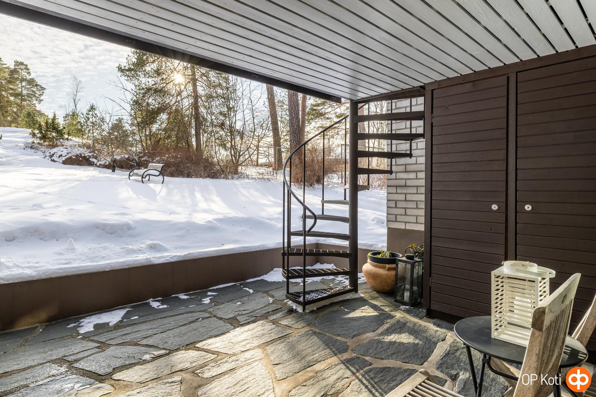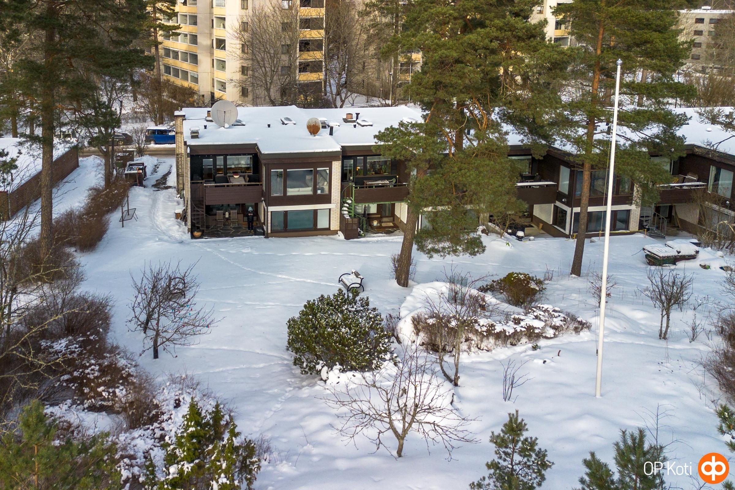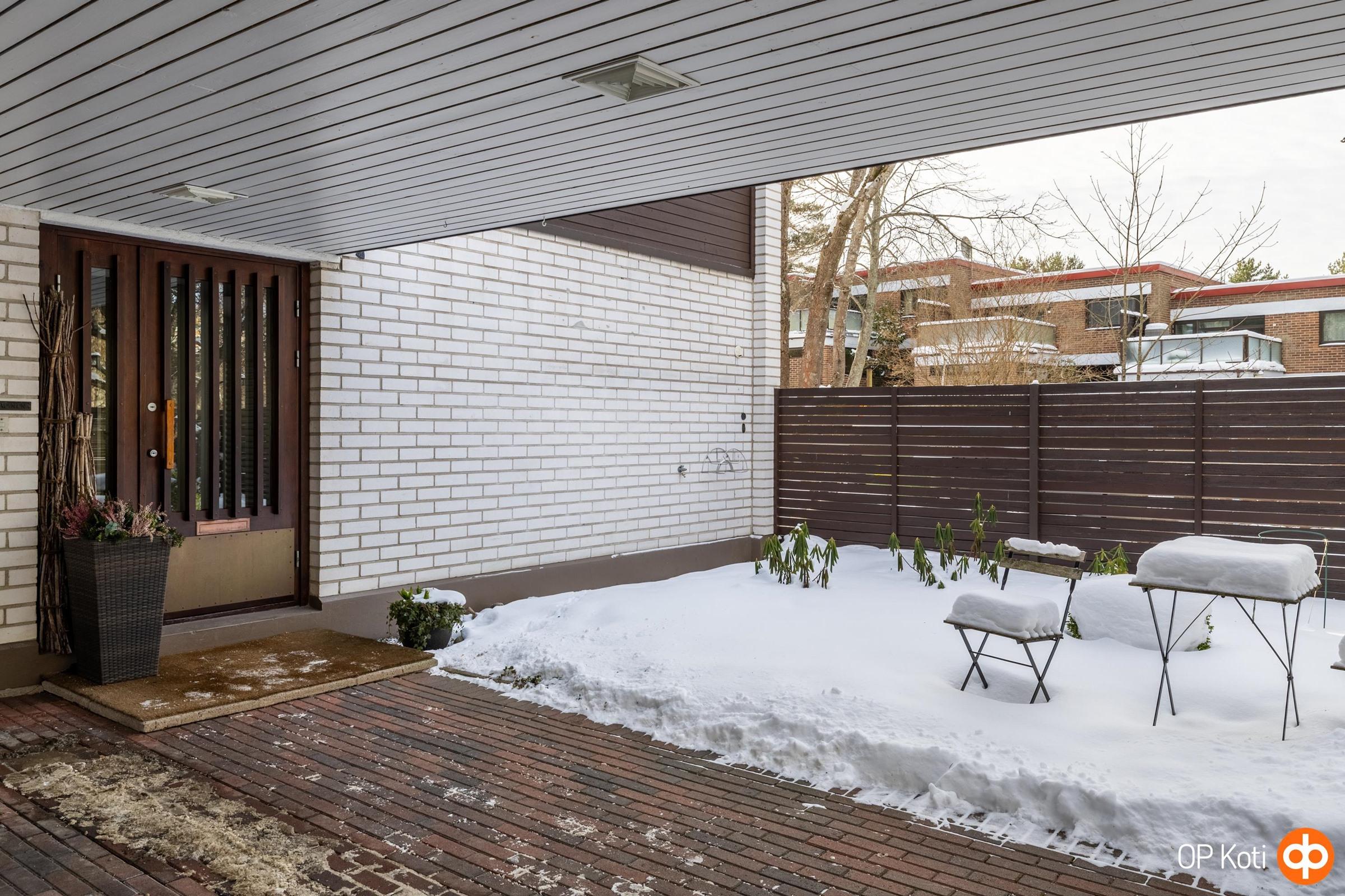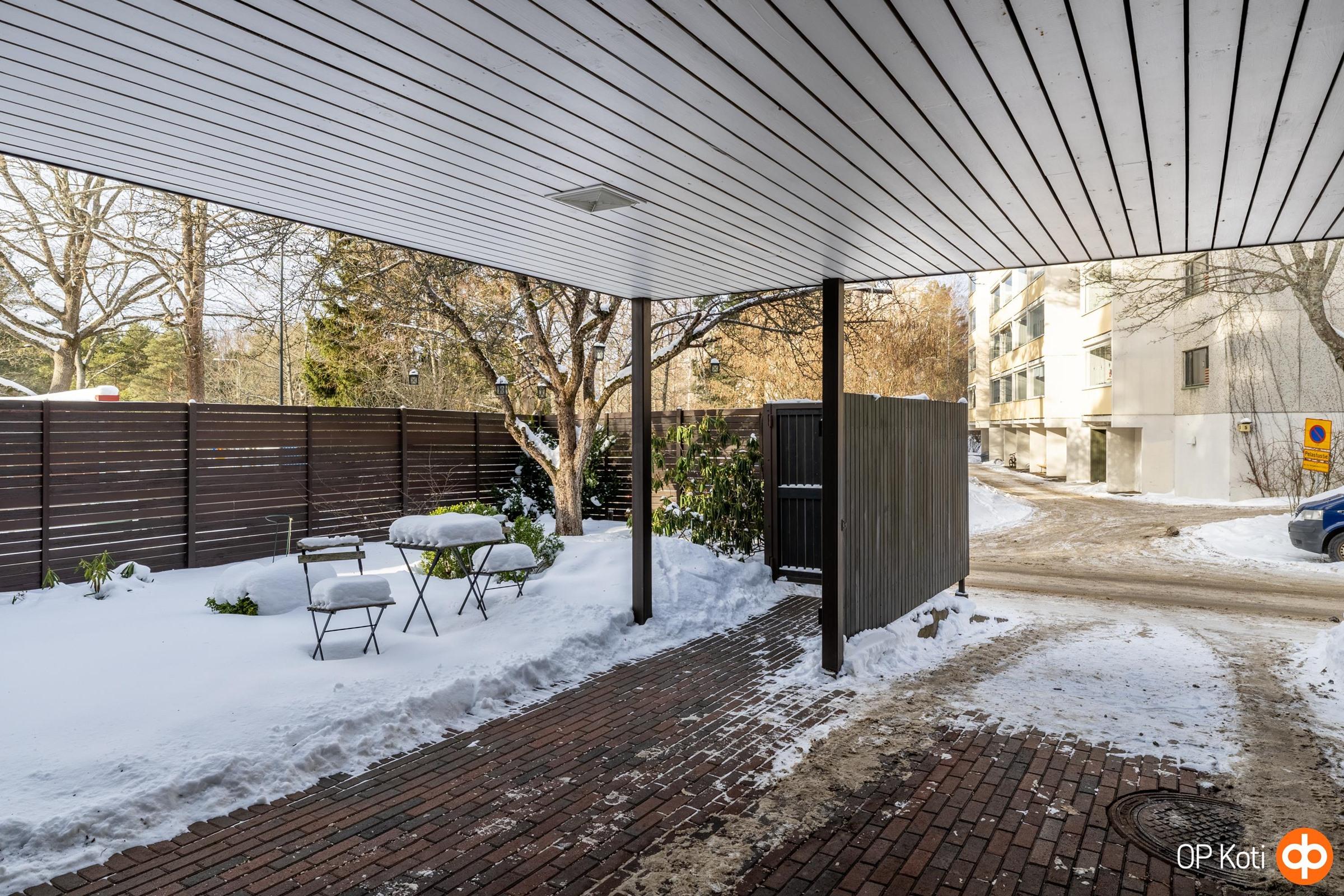Päätyhuoneiston sijainti tuo mukanaan erityistä rauhaa ja yksityisyyttä. Suuri oma piha, suojaisat näkymät ja ympäröivä vihreys luovat tunnelman, joka tuntuu lähes omakotitalomaiselta. Oma autopaikka sijaitsee suoraan etuoven edessä suojaisan katoksen alla.