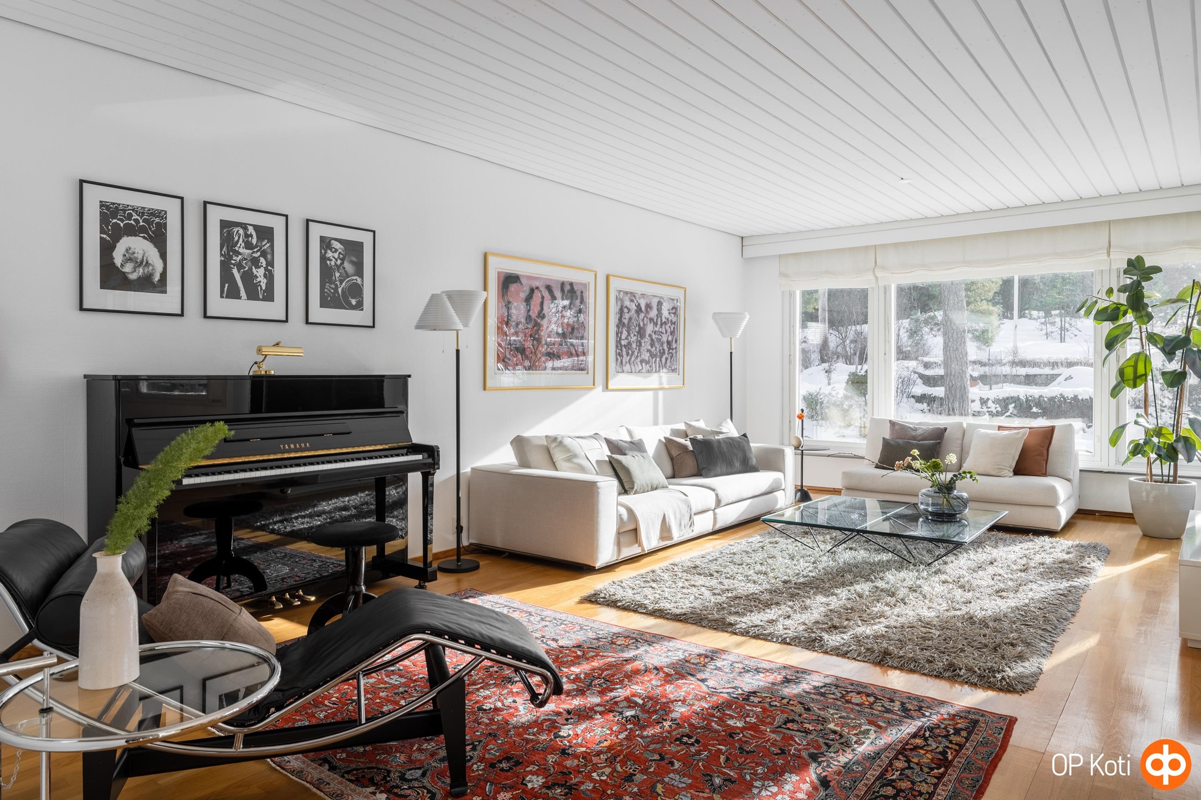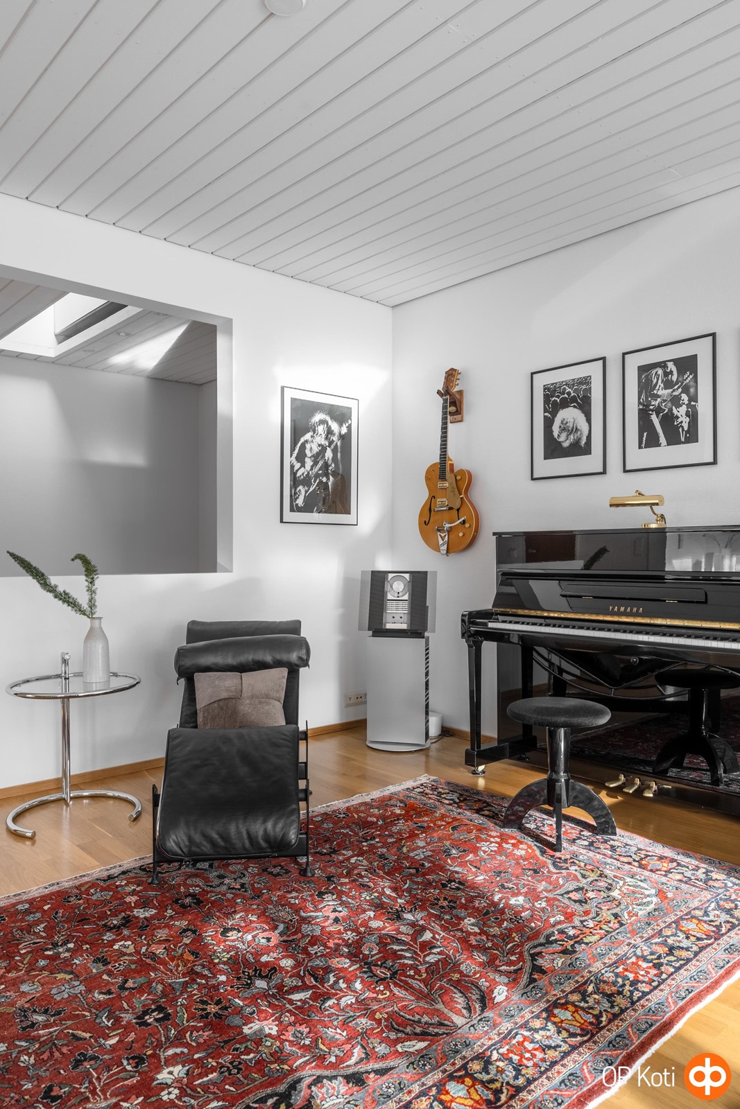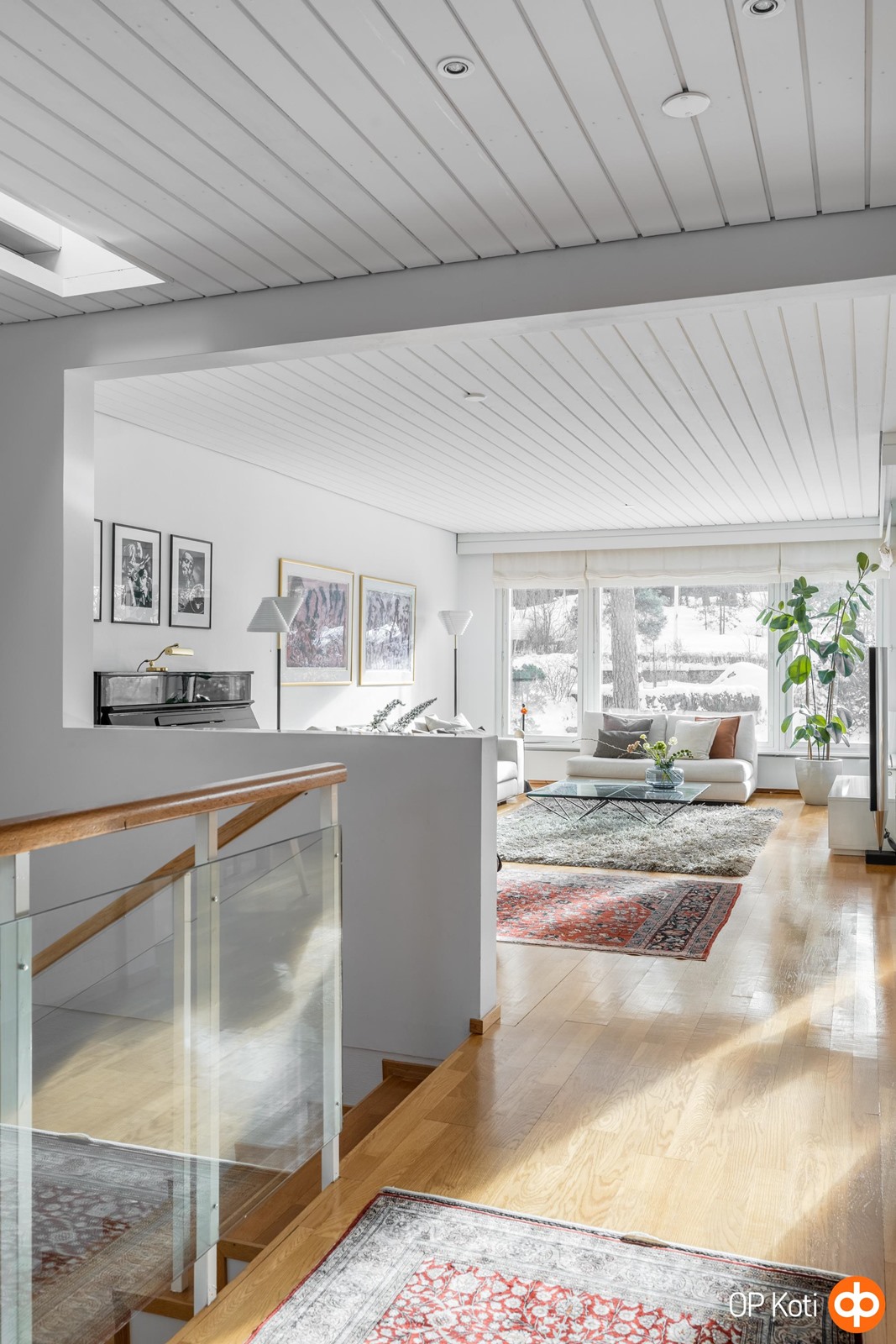 Yläkerran sydän on suuri, avara ja kauniisti valoisa olohuone. Suuret ikkunat avaavat näkymät omalle, laajalle pihalle, jossa vihreys rauhoittaa katseen ja aurinko kulkee pihan yli lähes koko päivän. Tila hengittää valoa ja avaruutta - se on paikka, jossa arki tuntuu kevyeltä ja juhla syntyy luonnostaan.