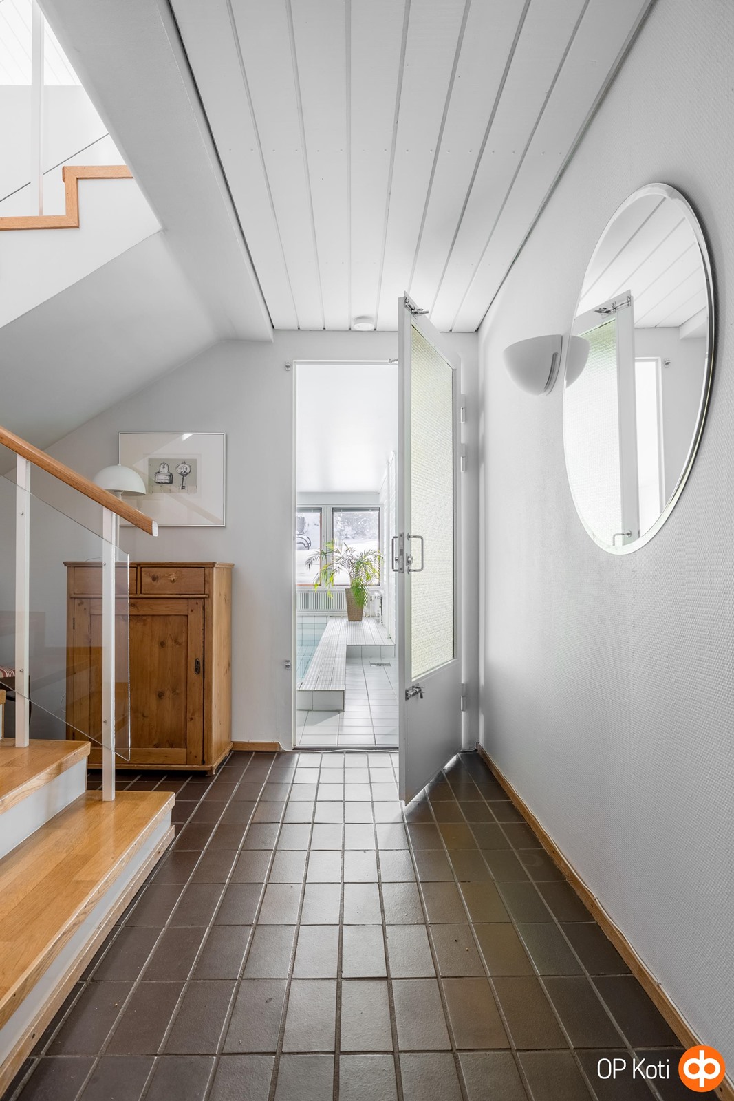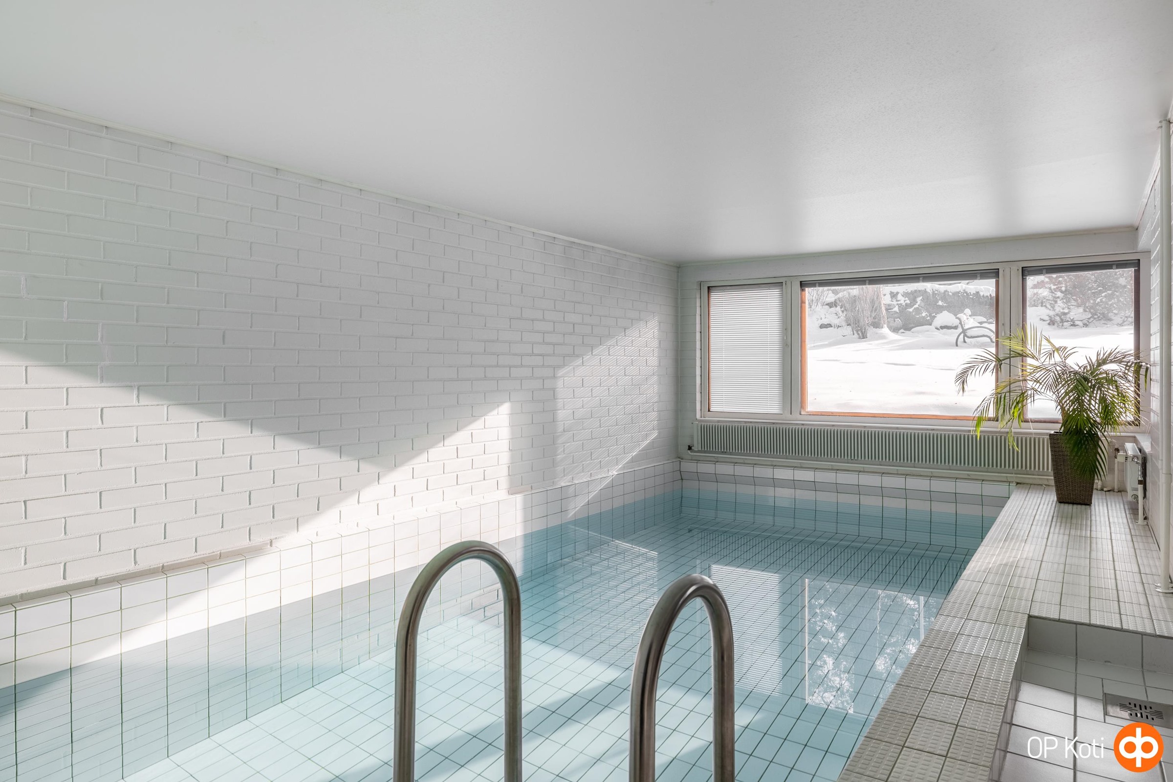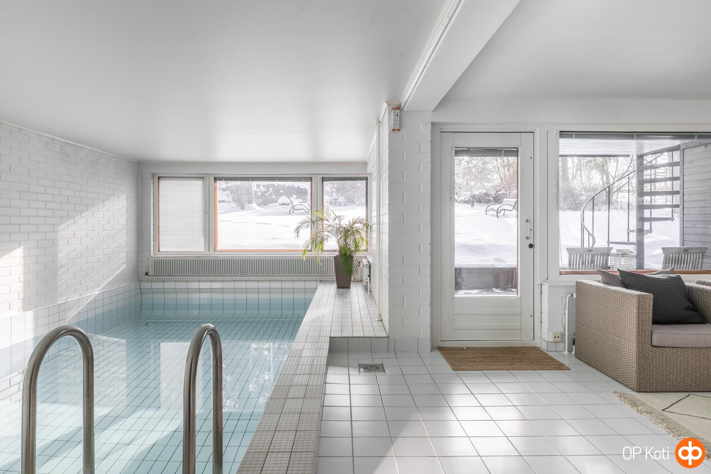 Takkahuoneen yhteydessä sijaitsee kodin oma pieni kylpylä. Allasosasto, suihkutilat ja kaunis ikkunallinen sauna tarjoavat hetkiä, jolloin arki unohtuu ja mieli rauhoittuu.