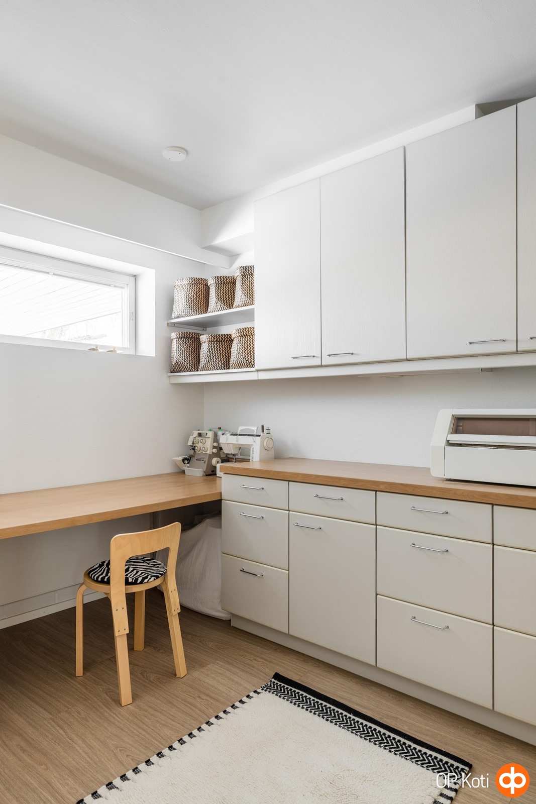 Alakerrassa on lisäksi käytännöllinen kodinhoitohuone, runsaasti varastotilaa sekä erillinen wc. Kodinhoitohuone on toiminut myös makuuhuoneena, ja sen muuttaminen siihen onnistuu vaivattomasti, koska lattia on yhtenäinen myös tasojen alta.