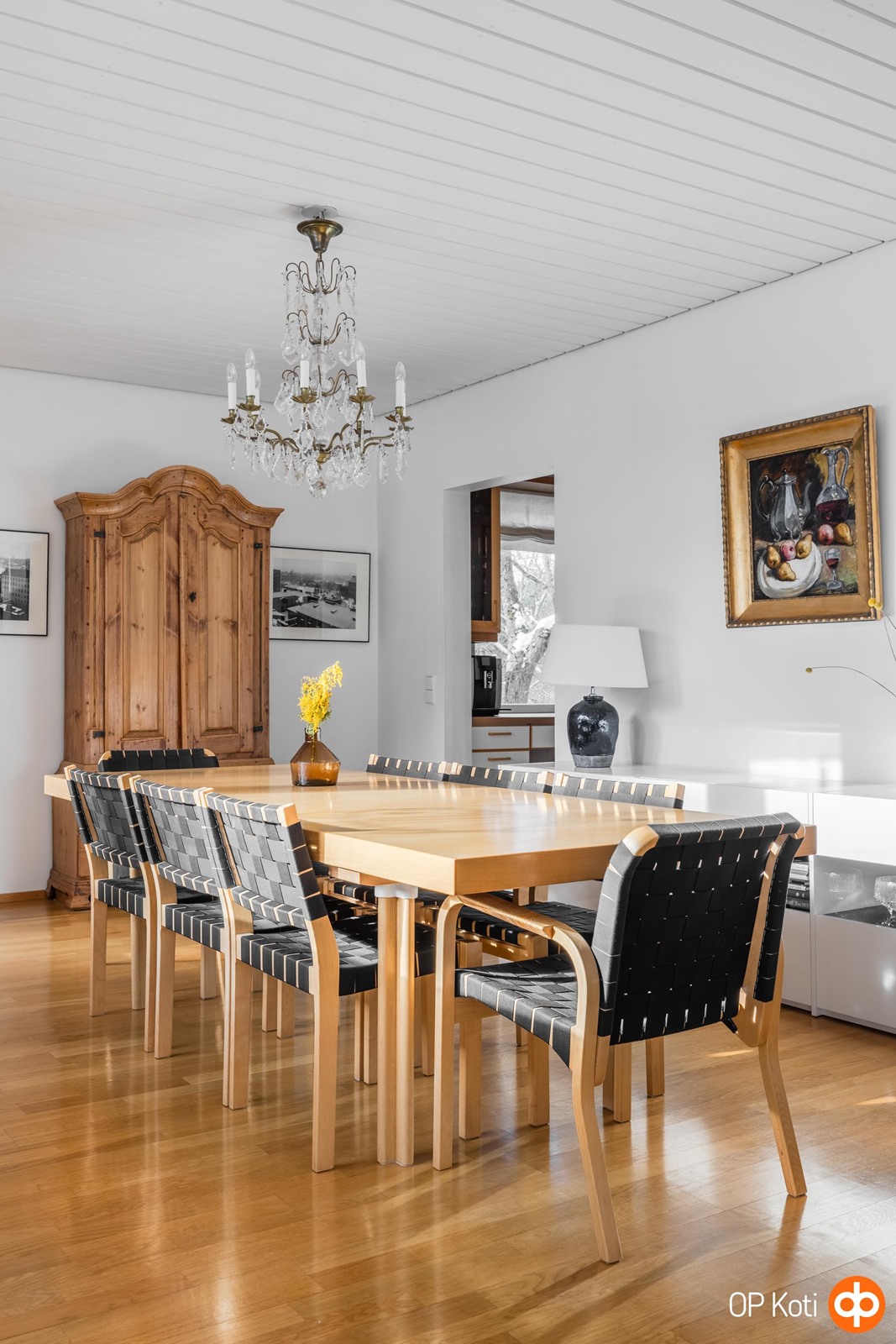 Olohuone jatkuu luontevasti ruokasaliin, jonka ympärille elämä kokoontuu. Pitkät illalliset, arjen nopeat aamupalat ja ystävien kanssa vietetyt hetket löytävät täällä paikkansa. Ruokasalista on käynti parvekkeelle, jossa kahvikuppi kädessä voi pysähtyä hetkeksi ja istua kesäisin rauhoittumaan. Erillisessä hyvin varustellussa keittiössä on runsaasti taso- ja säilytystilaa. Kaikki on suunniteltu niin, että kokkaaminen sujuu vaivattomasti - yksin tai yhdessä.