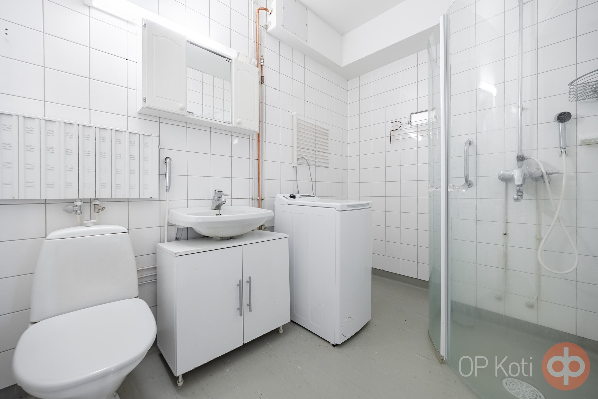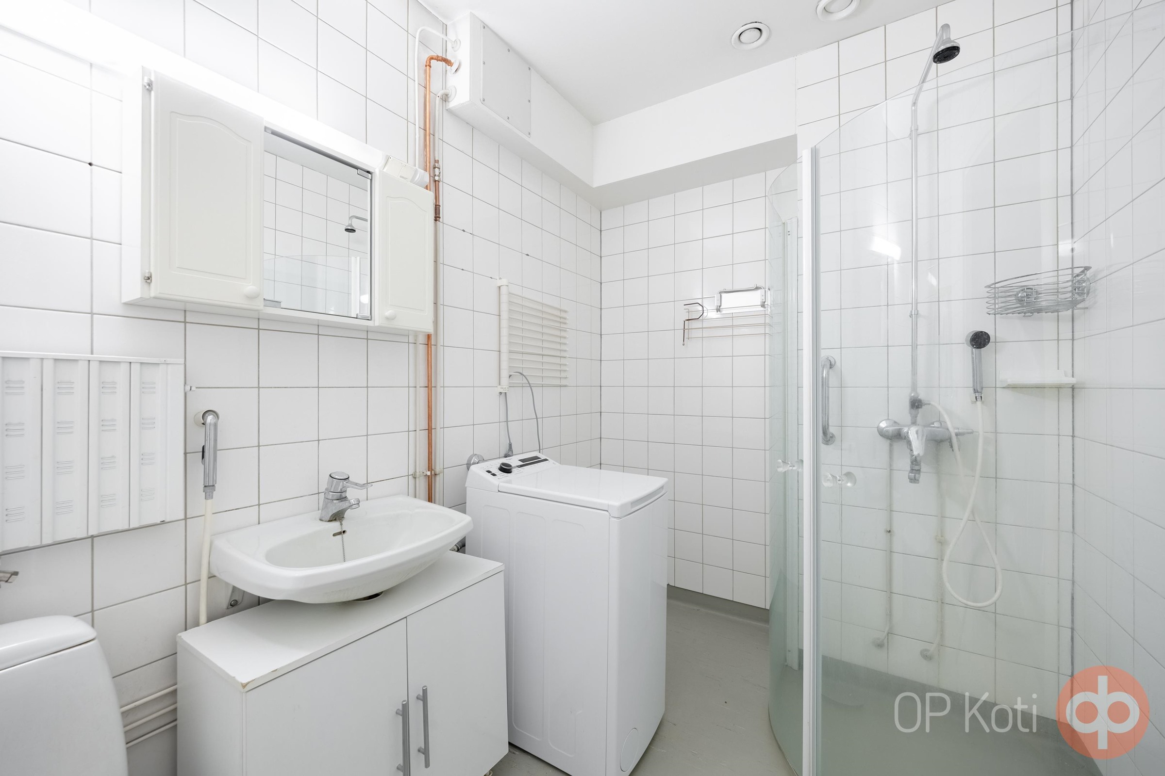 - Suihku, suihkukaappi, peilikaappi, allaskaappi, pesukoneliitäntä, kiinteät valaisimet.